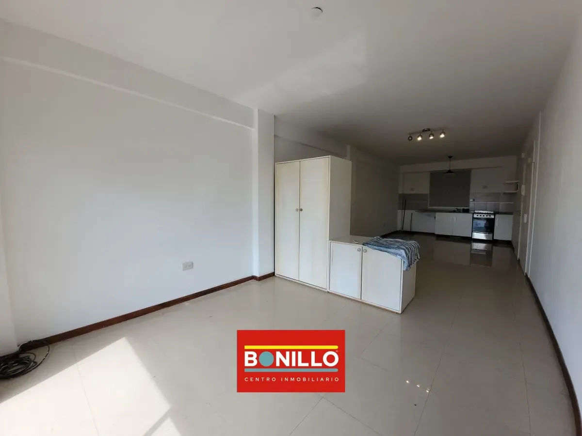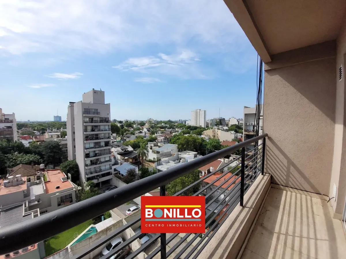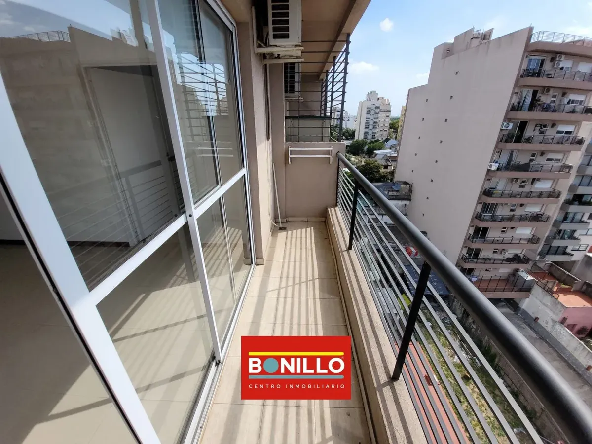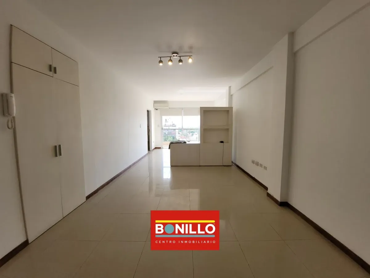Kitnet (1 ambiente) na parte de fundos (contrafrente), com varanda, para locação em Villa del Parque. Possui aparelho de cozinha com gás natural, conexão para máquina de lavar roupa de carga frontal e pequeno armário. Banheiro completo com janela voltada para a varanda e janela na cozinha, permitindo ventilação cruzada. Contrato de 2 anos com reajuste trimestral pelo IPC. Não aceita animais.