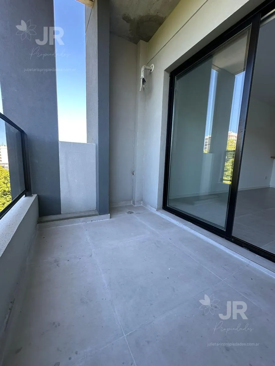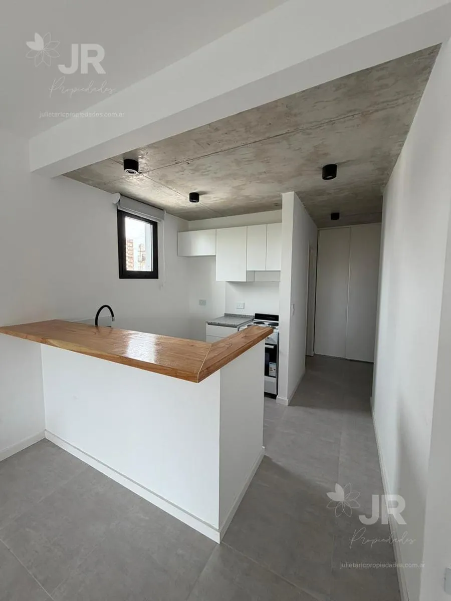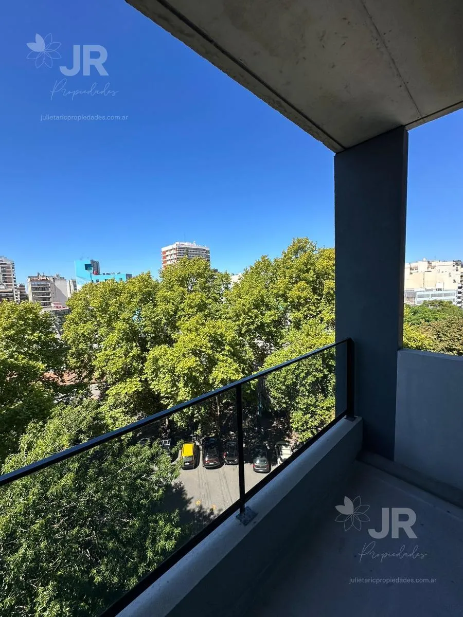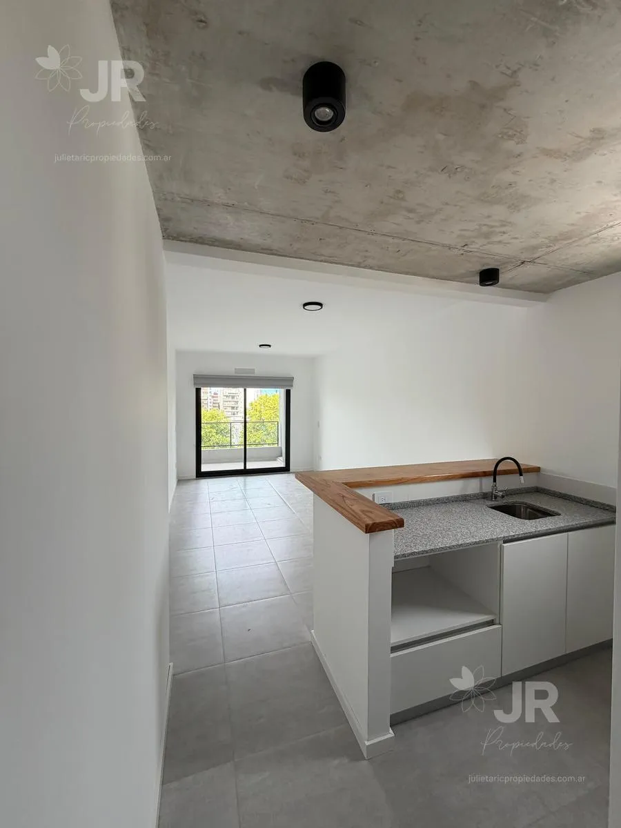 Kitnet novo (nunca habitado) em Villa del Parque, com 1 ambiente e varanda. Cozinha integrada com móveis planejados (bancada e armários aéreos), banheiro completo e pisos de porcelanato. Janelas de alumínio e pré-instalação para ar-condicionado. Varanda descrita como espaçosa. Fica a 200 metros do centro comercial da Calle Cuenca e a 3 quadras da Estação Villa del Parque (Trem San Martín). Há linhas de coletivos e acesso ao Metrobús na Av. San Martín; o anúncio menciona também a proximidade da á