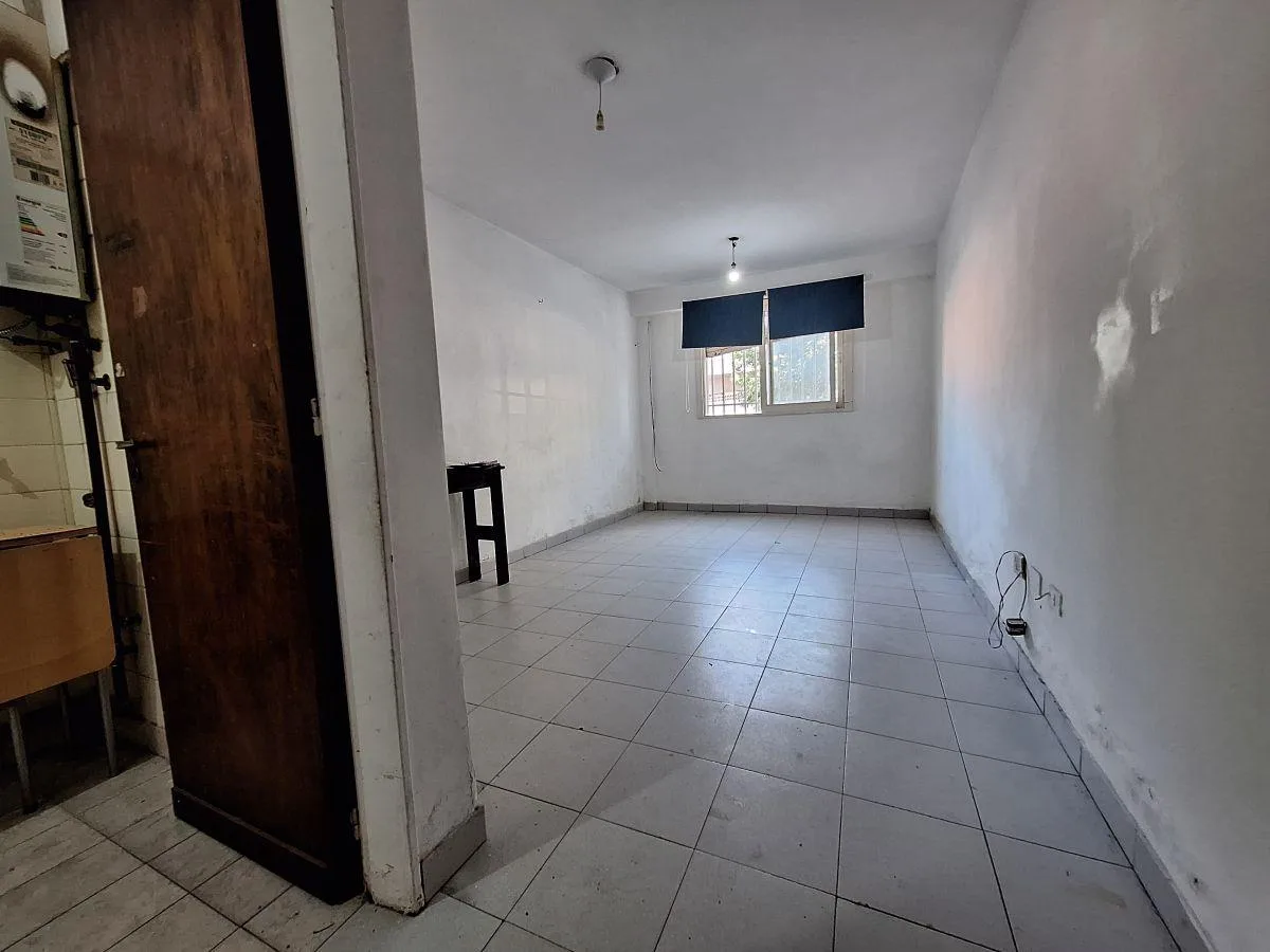 Kitnet de 1 ambiente em andar térreo, de frente para a rua, com cozinha independente e pátio. O imóvel tem 5,65 x 3,00 (ambiente), cozinha de 3,07 x 1,50 e banheiro completo de 2,10 x 1,40. Conta com pátio de 3,60 x 3,50 e área de lavanderia incorporada. O prédio tem térreo e mais 3 andares, com aquecimento de água por calefón. O condomínio informado é de cerca de $ 40.000; despesas de expensas comuns, luz, gás, ABL e AYSA ficam a cargo do inquilino.