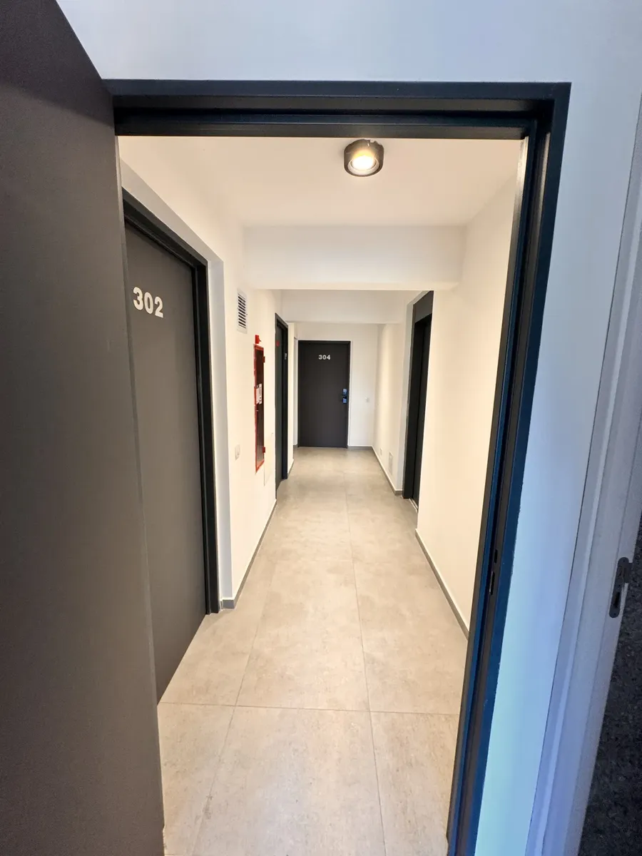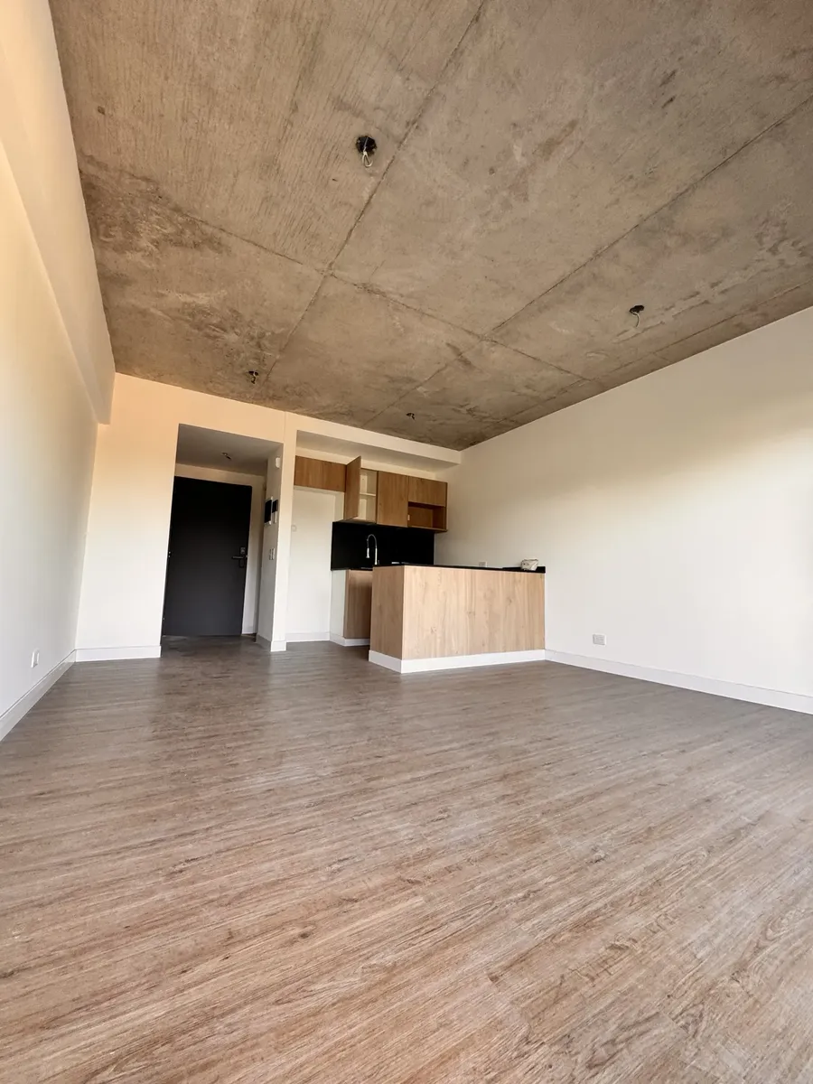 Apartamento de um único ambiente novo (nunca habitado) com varanda de frente para a rua. Conta com cozinha integrada, espaço para lavanderia e banheiro com box/chuveiro. Há churrasqueira na área de terraço.