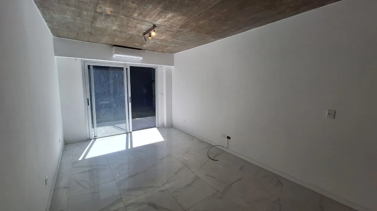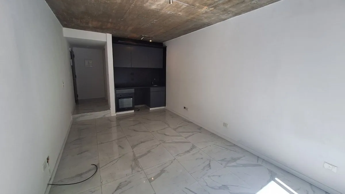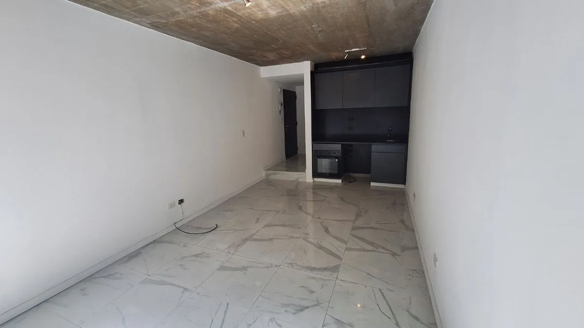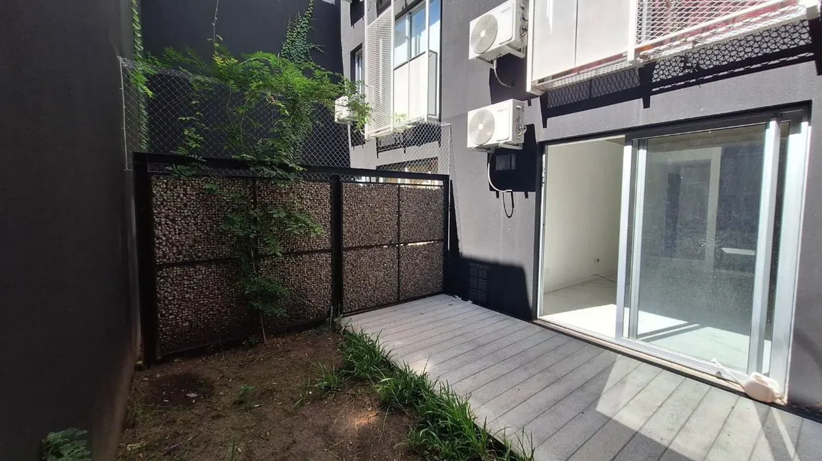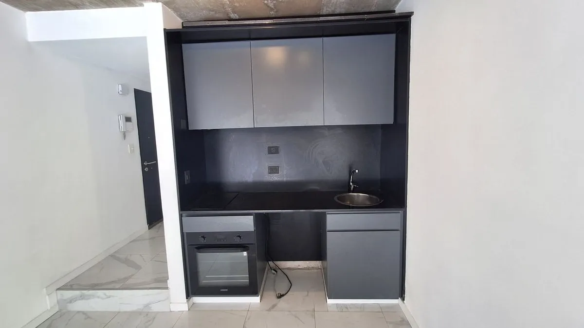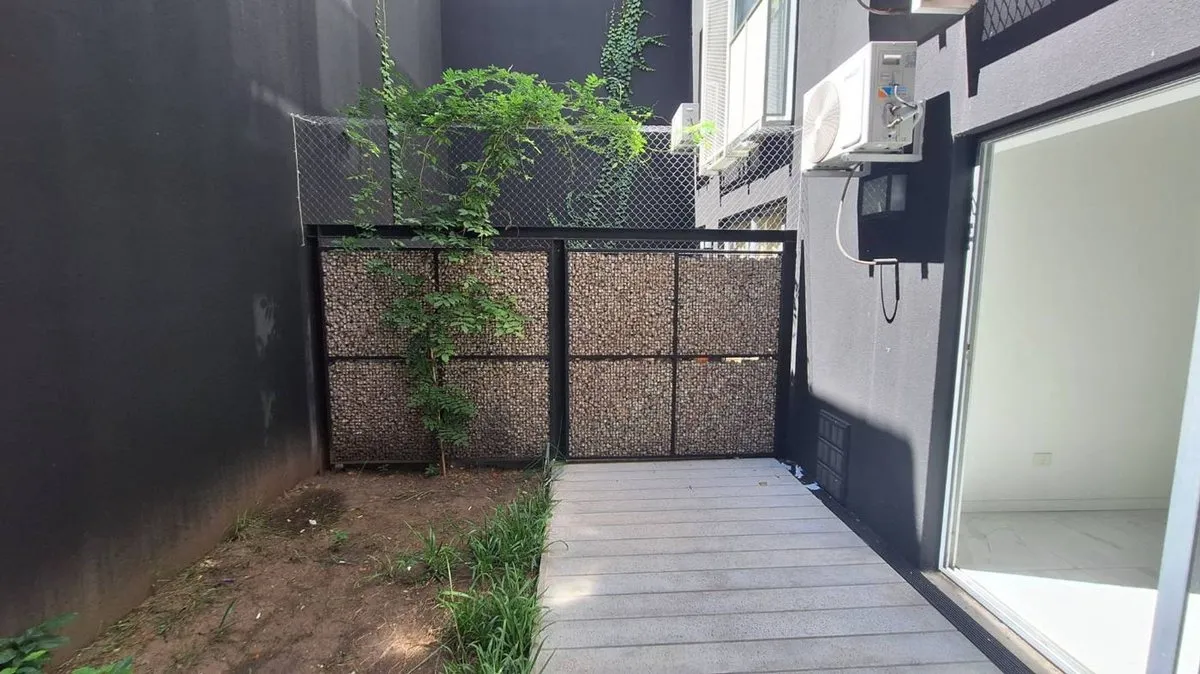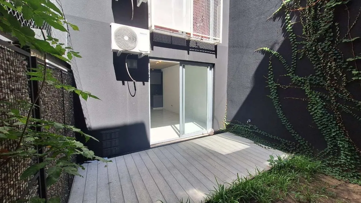 Kitnet de 1 ambiente, térrea, de fundos, com pátio/jardim em Villa Ortúzar. Cozinha com forno e cooktop elétrico, espaço para geladeira sob a bancada e armários sob e sobre a bancada. Ambiente com split frio-calor, luminárias, pisos de porcelanato calacata e teto de concreto aparente; banheiro com ducha e vista para o pátio/jardim. O prédio tem piscina, solarium, deck, salão de festas (SUM) e laundry no 9º andar, além de água quente central por aquecedor a gás. Contrato residencial de 2 anos, re