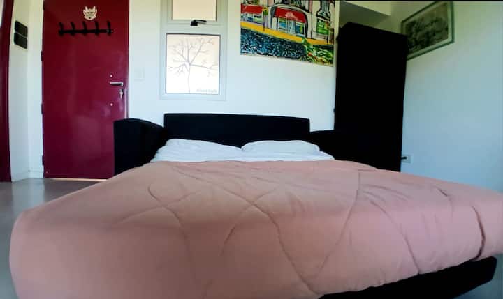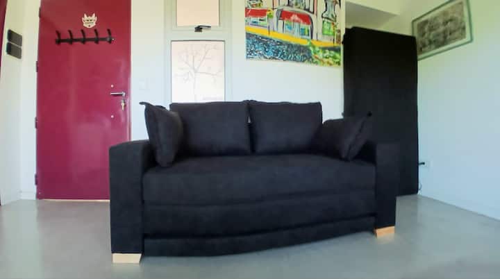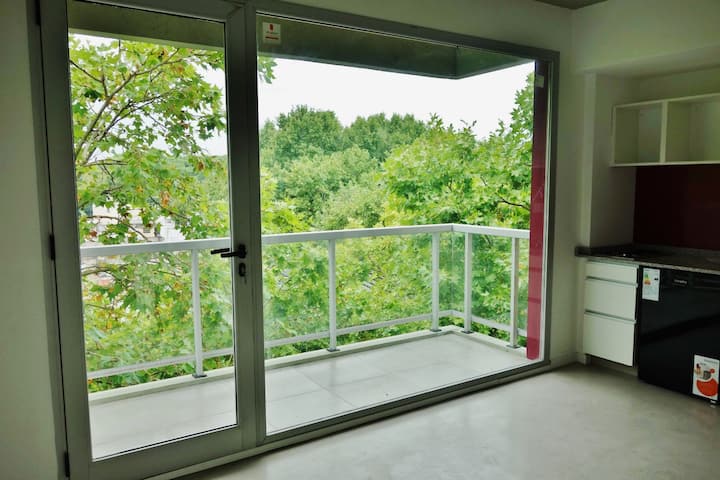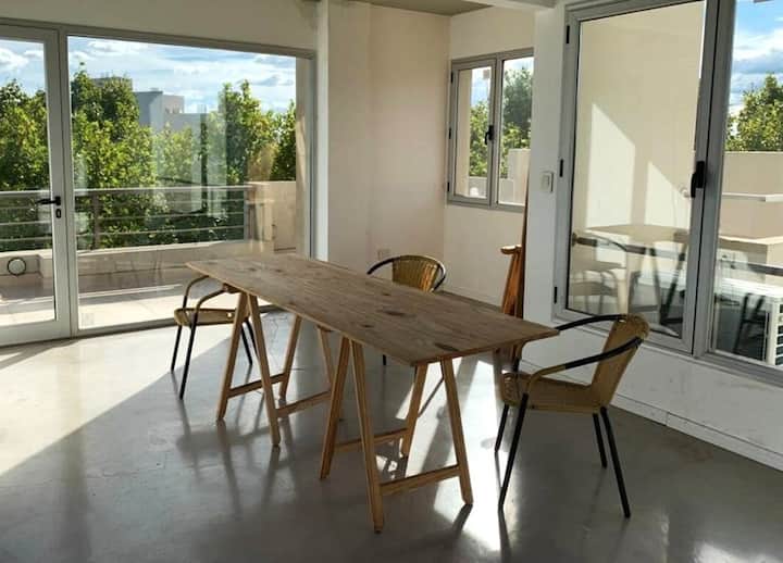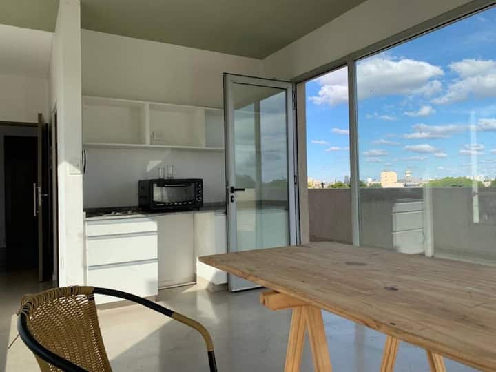 Квартира для временного размещения в районе Parque Chas, 5-й этаж. В квартире есть балкон и выход на террасу с зоной гриля и общей гостиной для жильцов (SUM), откуда виден парк с высоты. В отделке: диван-кровать, постельное бельё, кондиционер холод/тепло, душ с эффектом «тропического» режима (Scottish shower). Минимальный срок аренды — 3 ночи. Пользование SUM возможно по предварительному уведомлению; при нарушении предусмотрен штраф. Квартира для некурящих.