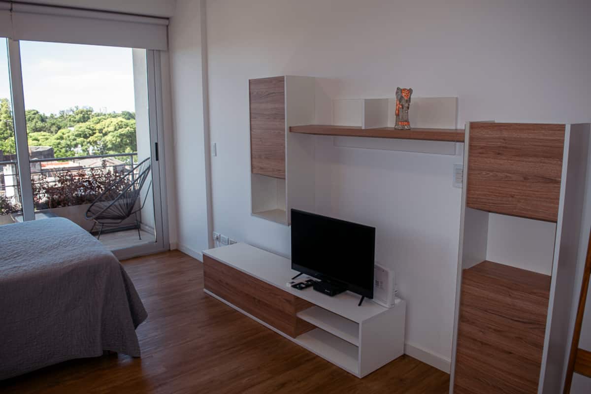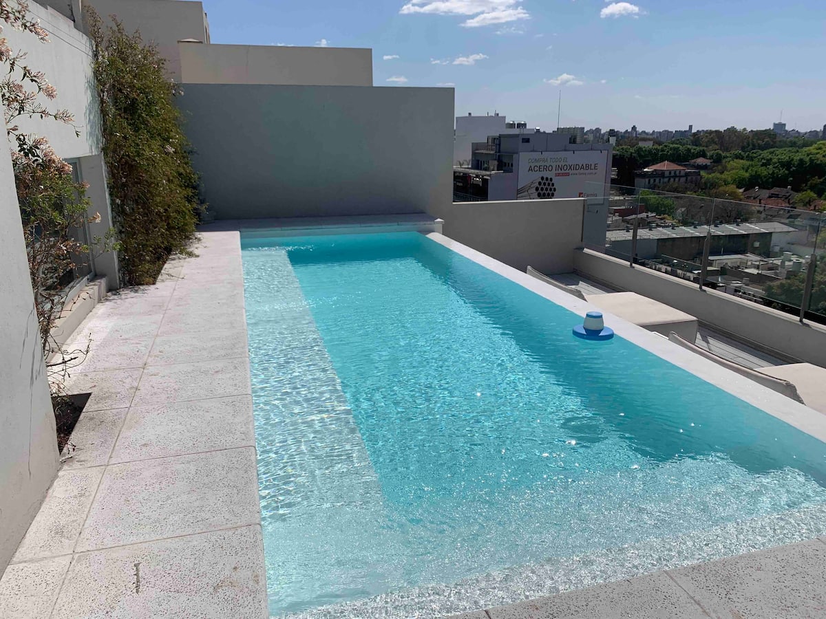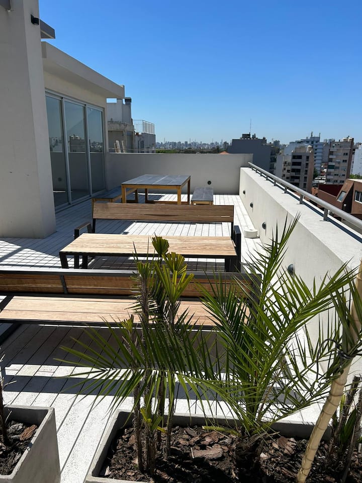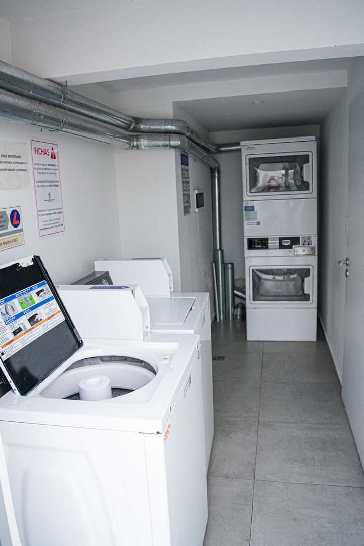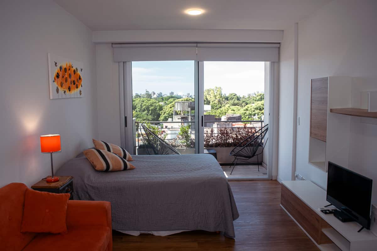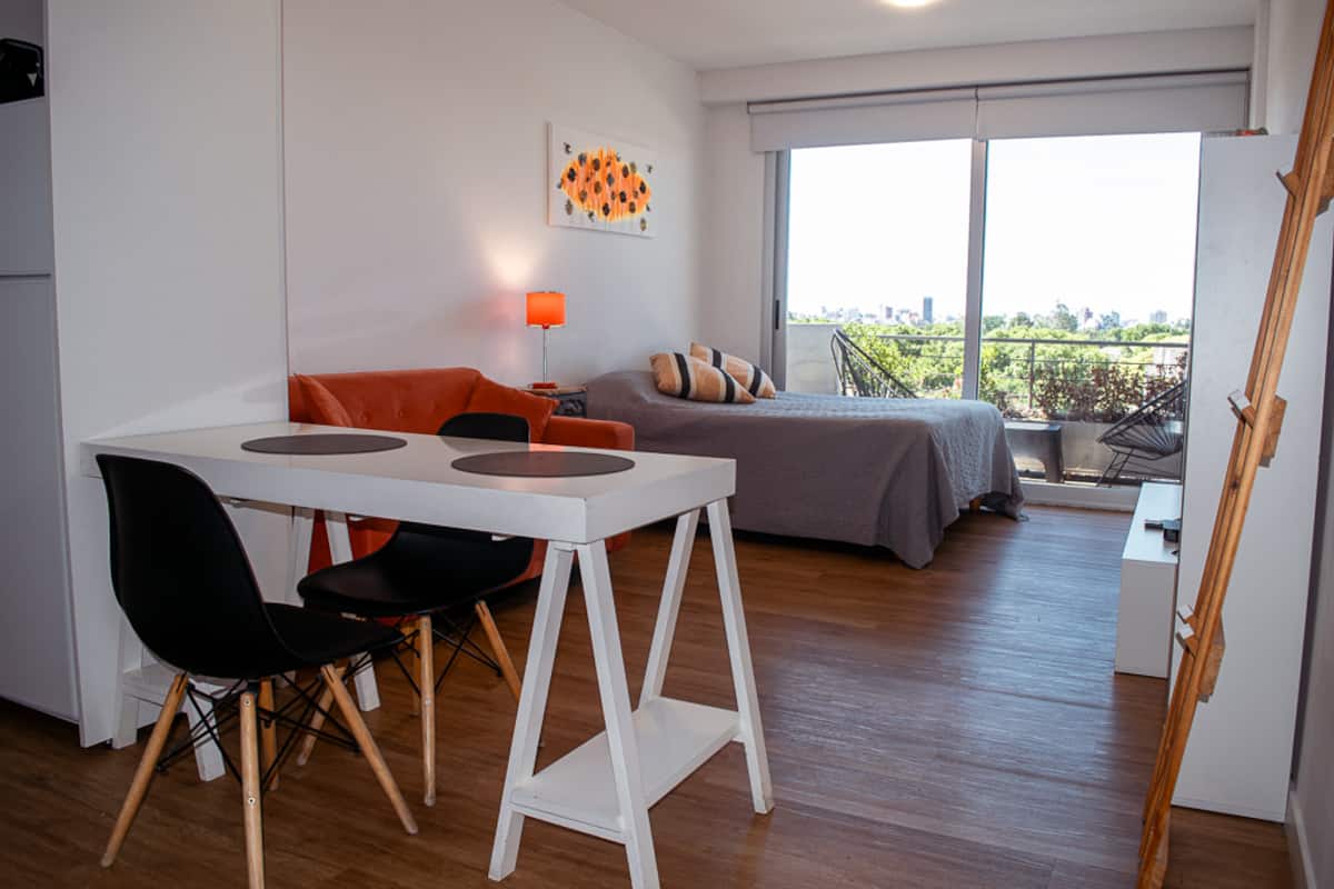 Квартира-студия на 7 этаже в жилом комплексе. Есть балкон с панорамным видом на парки в Agronomía и город Buenos Aires. Центральное горячее водоснабжение, давление воды указано как высокое. В здании предусмотрены охрана 24 часа, бассейн, тренажёрный зал, общая гостиная для жильцов (SUM) и прачечная. Бассейн не отапливается, работает в течение всего года; в сезон он доступен 24 часа. В бассейне допускаются только проживающие, гостей и родственников не допускают. Доступ к помещениям и сервисам: