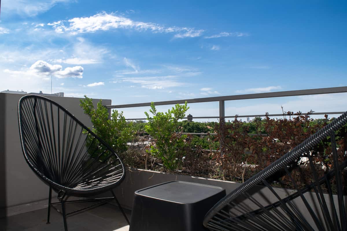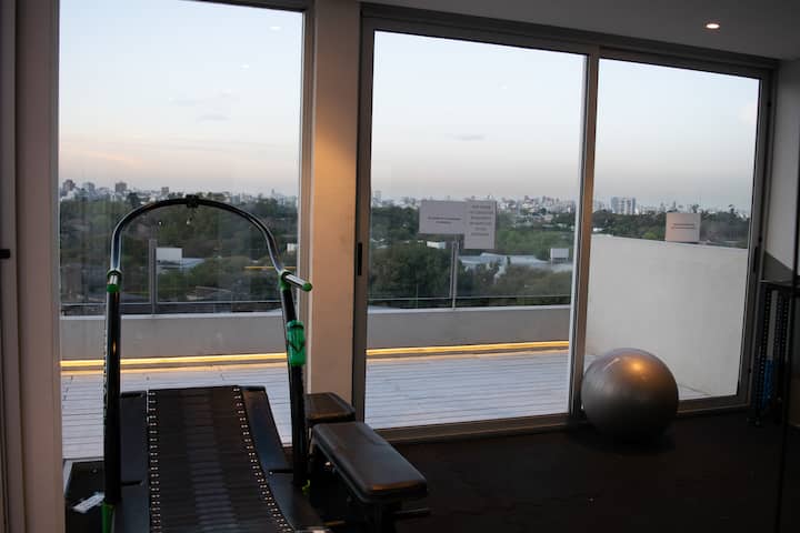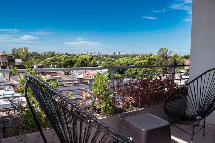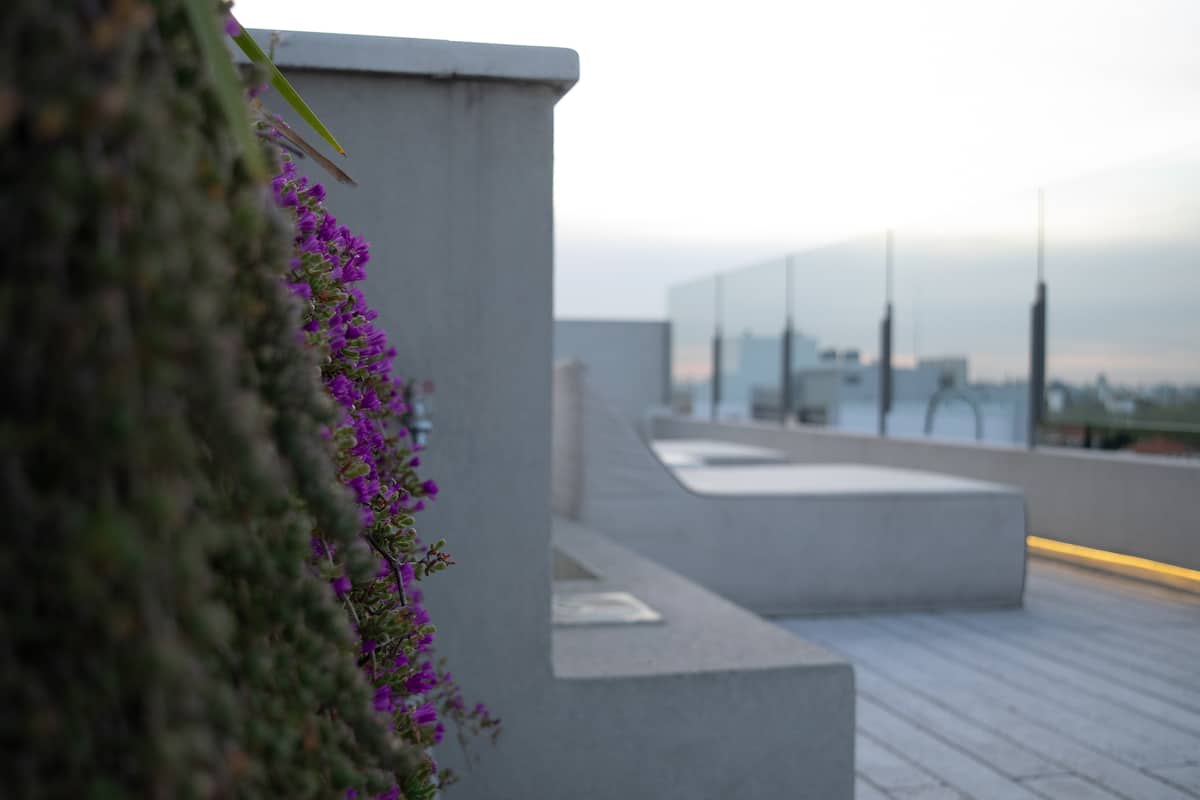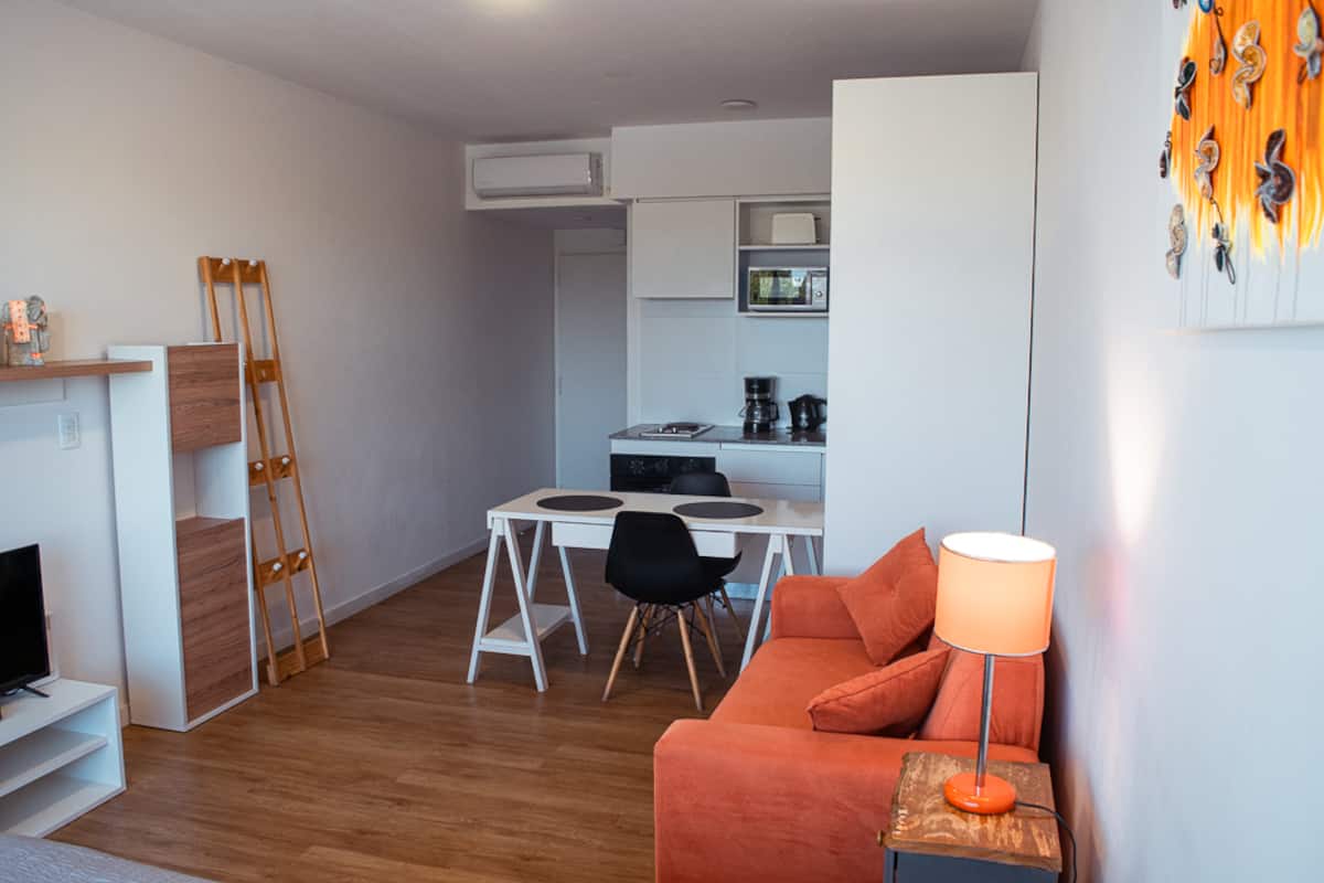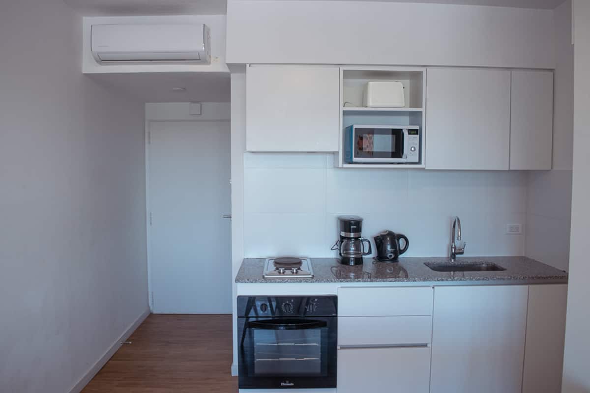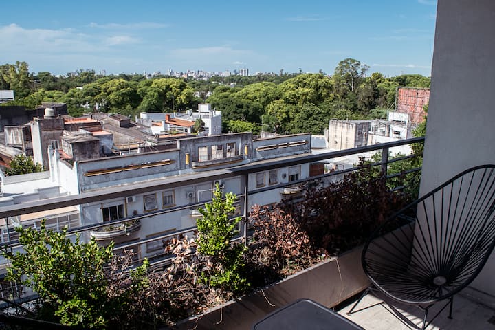 Квартира-студия на 7 этаже в жилом комплексе. Есть балкон с панорамным видом на парки в Agronomía и город Buenos Aires. Центральное горячее водоснабжение, давление воды указано как высокое. В здании предусмотрены охрана 24 часа, бассейн, тренажёрный зал, общая гостиная для жильцов (SUM) и прачечная. Бассейн не отапливается, работает в течение всего года; в сезон он доступен 24 часа. В бассейне допускаются только проживающие, гостей и родственников не допускают. Доступ к помещениям и сервисам: