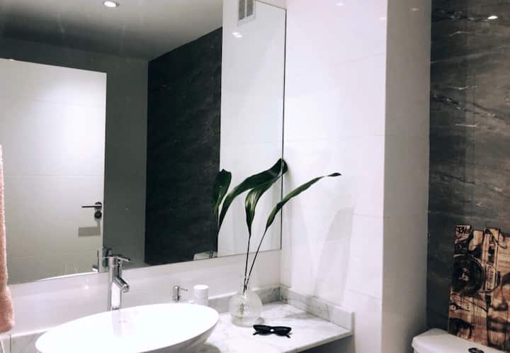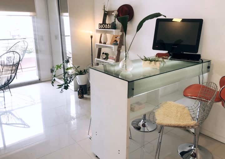 Квартира-студия в Almagro. Планировка в стиле лофт, площадь не указана. Кондиционер (нагрев и охлаждение), тёплый пол с подогревом, Wi‑Fi и кабельное телевидение. Кухня оборудована для пользования гостями. В здании предусмотрено круглосуточное частное видеонаблюдение и доступ в сектор внутри комплекса. К услугам жильцов: большой бассейн, большой солярий и зелёный парк, терраса с зоной гриля, фитнес-зал, мультифункциональная комната и прачечная; предоставляются полотенца и постельное бельё.