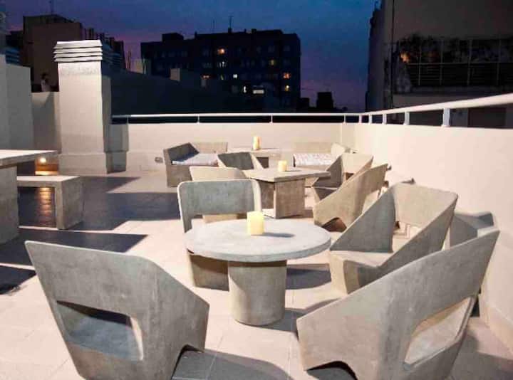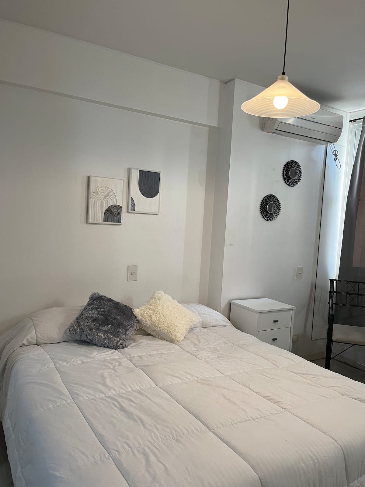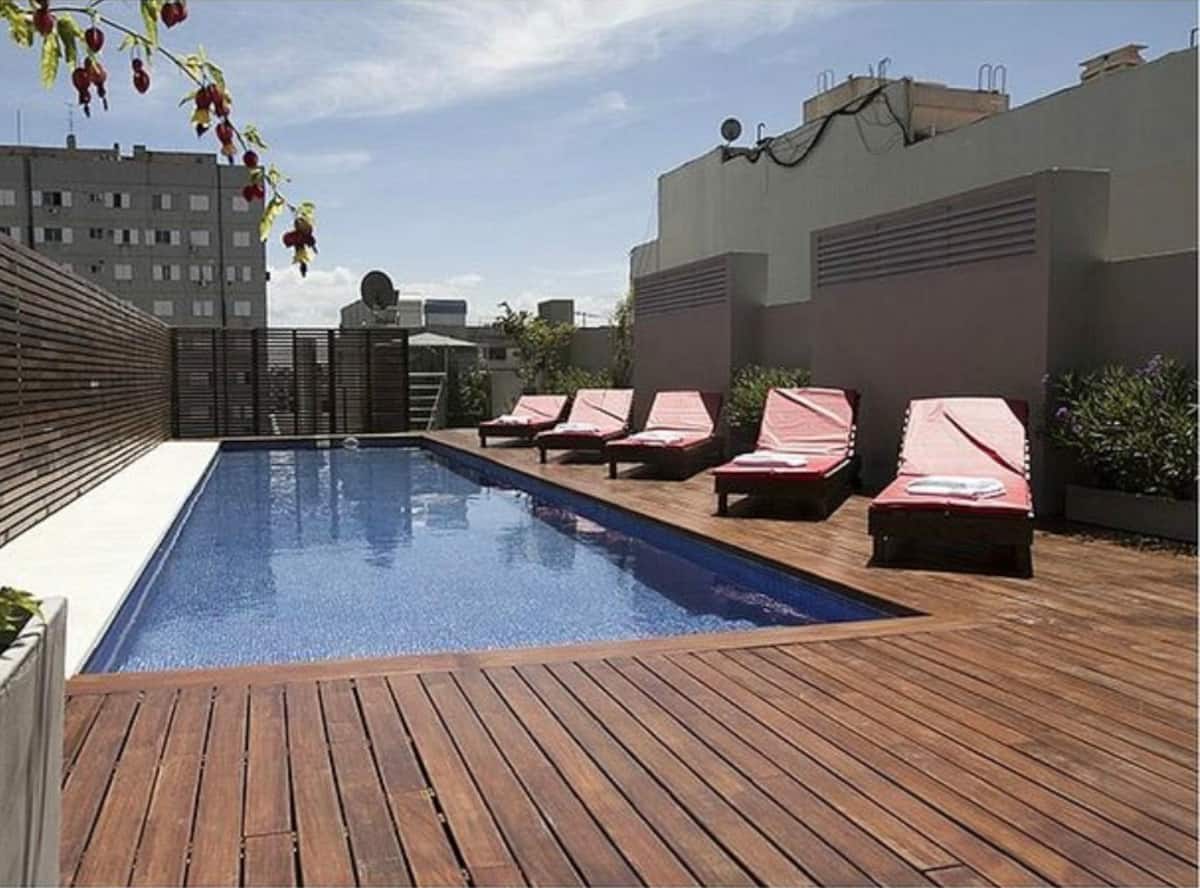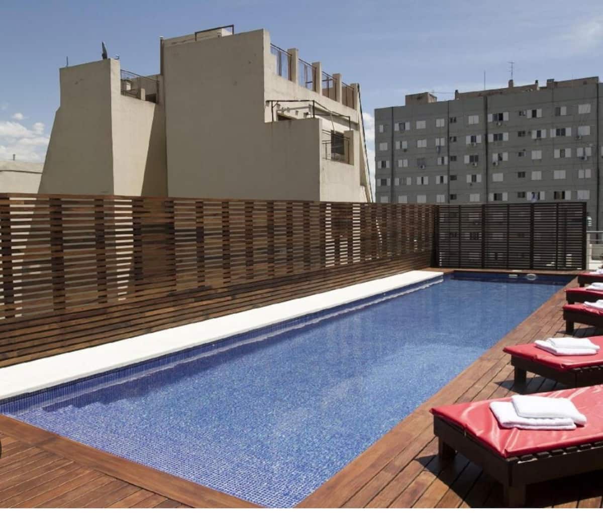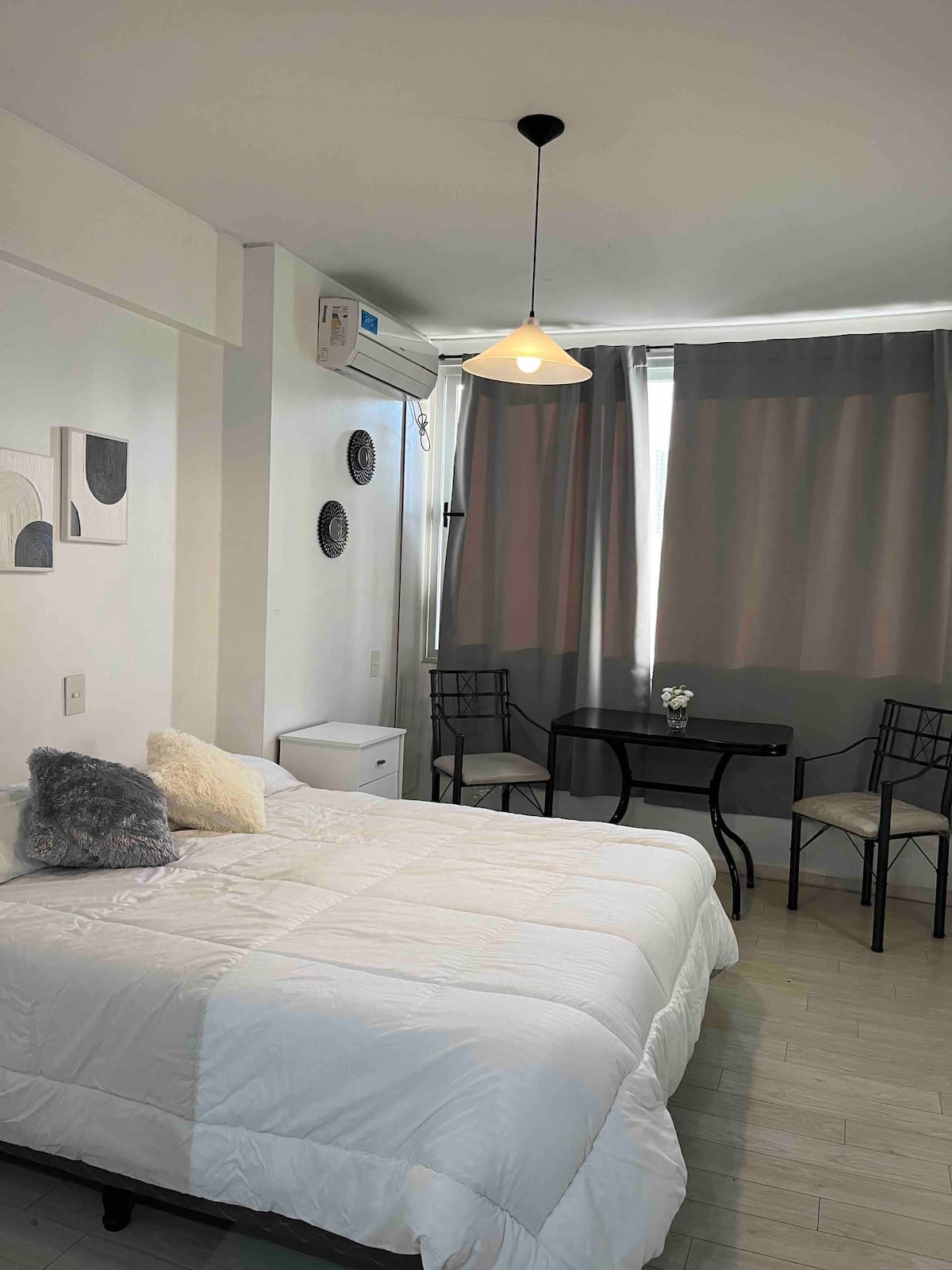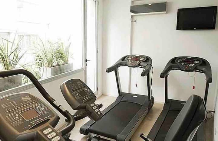 Меблированная квартира в Almagro, в здании с круглосуточной охраной. В здании есть спортзал и бассейн. Квартира оборудована телевизором, кондиционером и системой отопления; отдельная ванная комната и кухня с холодильником, плитой, электрической духовкой и кухонной утварью. Предоставляются постельные принадлежности и входит бесплатный Wi‑Fi. В описании указано, что здание находится напротив Italian Hospital, рядом с Parque Centenario и станциями Subte линий A и B.