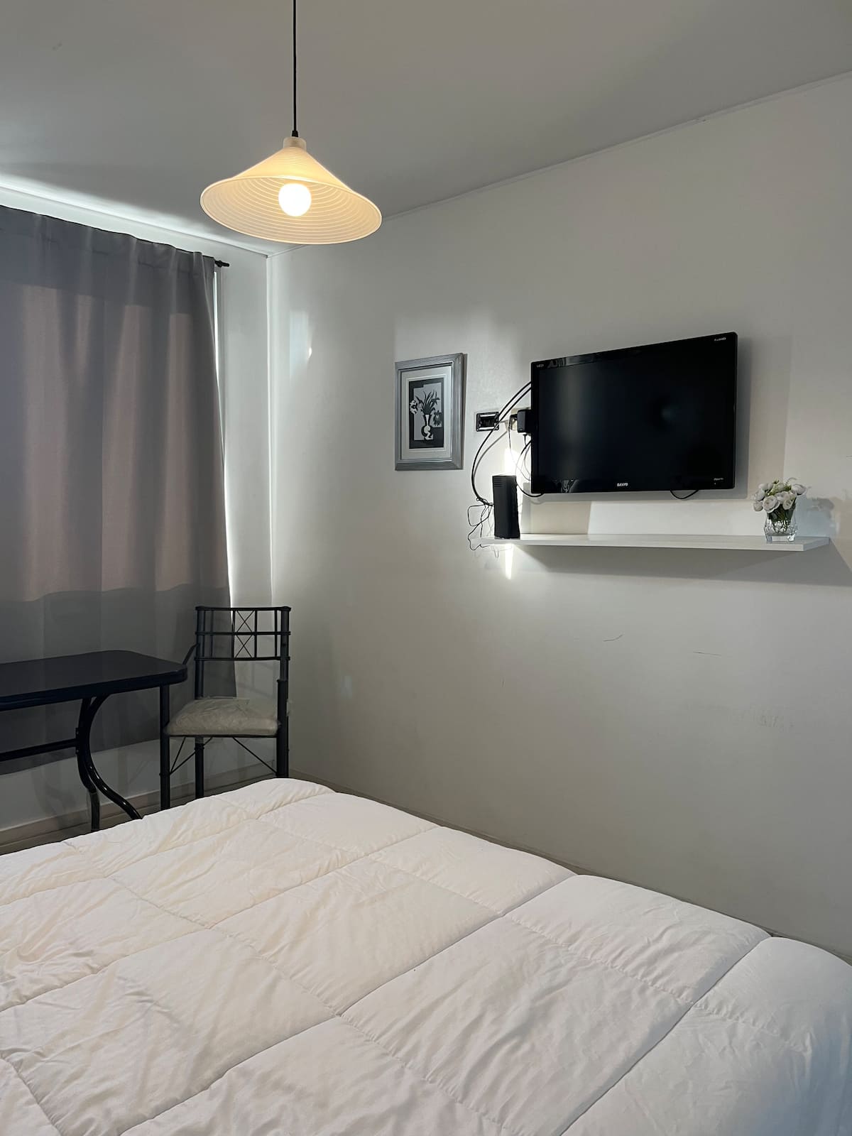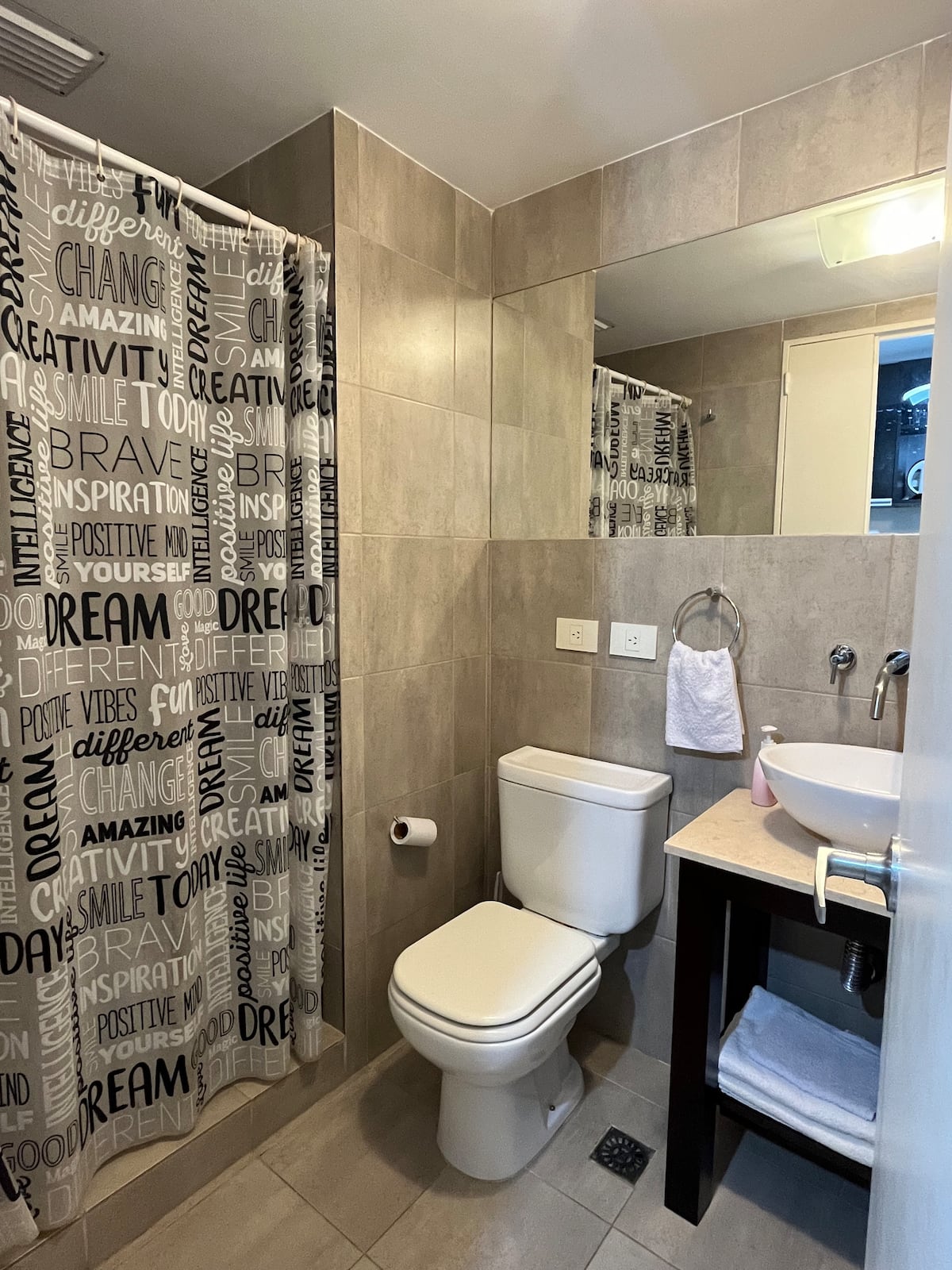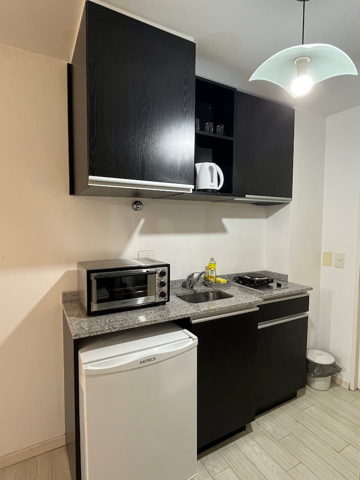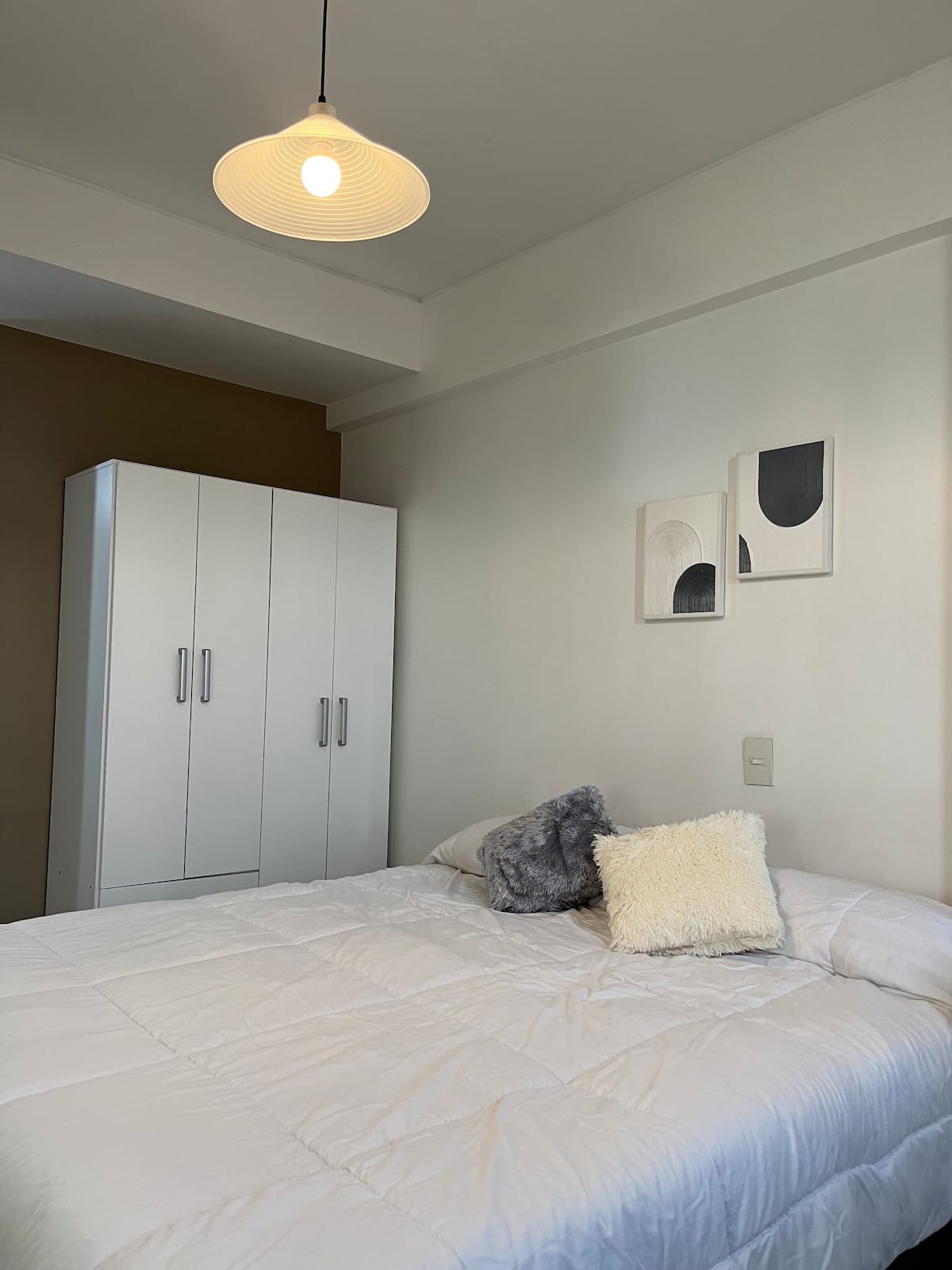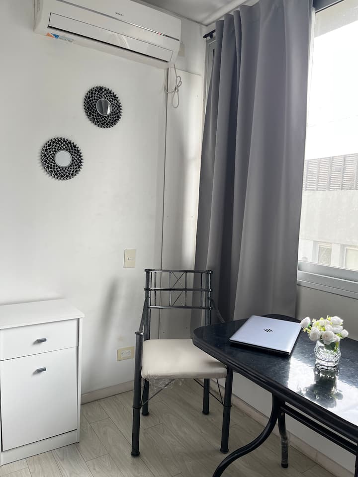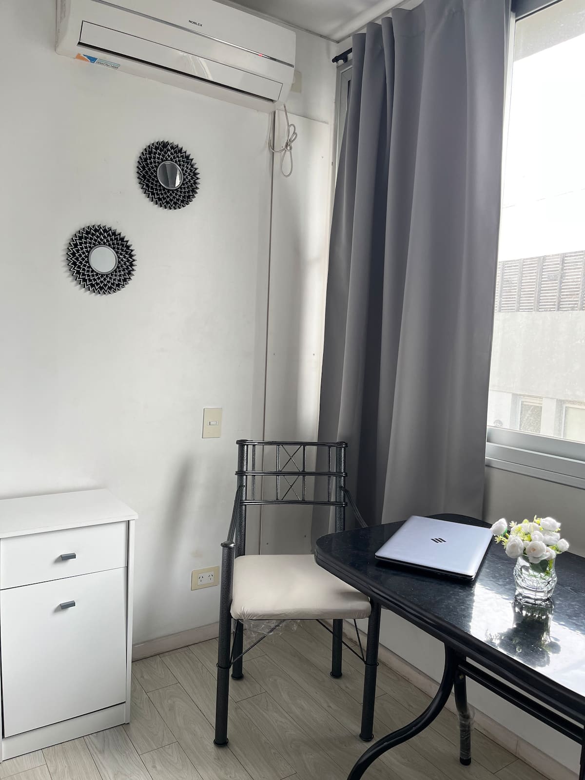 Меблированная квартира в Almagro, в здании с круглосуточной охраной. В здании есть спортзал и бассейн. Квартира оборудована телевизором, кондиционером и системой отопления; отдельная ванная комната и кухня с холодильником, плитой, электрической духовкой и кухонной утварью. Предоставляются постельные принадлежности и входит бесплатный Wi‑Fi. В описании указано, что здание находится напротив Italian Hospital, рядом с Parque Centenario и станциями Subte линий A и B.