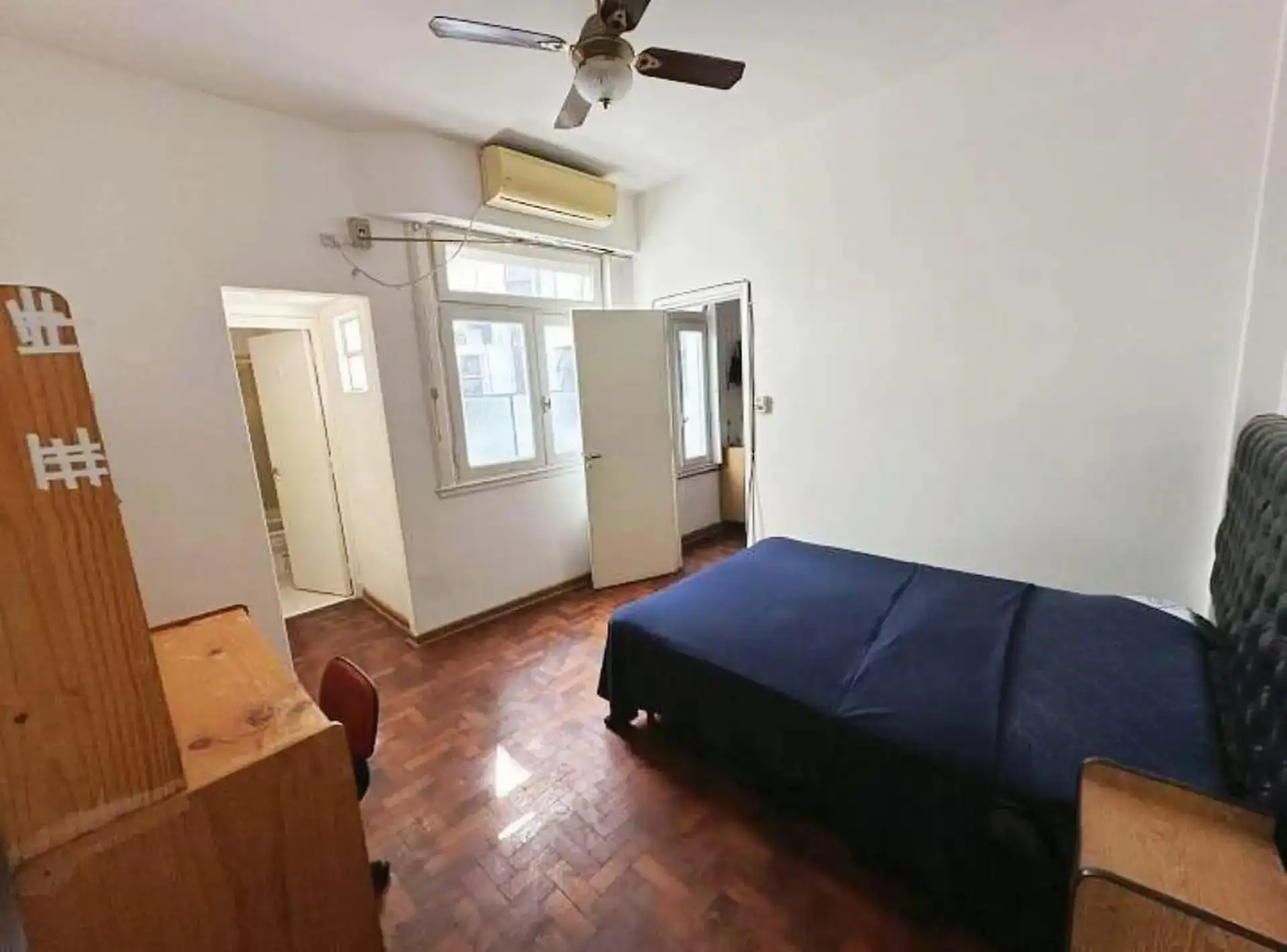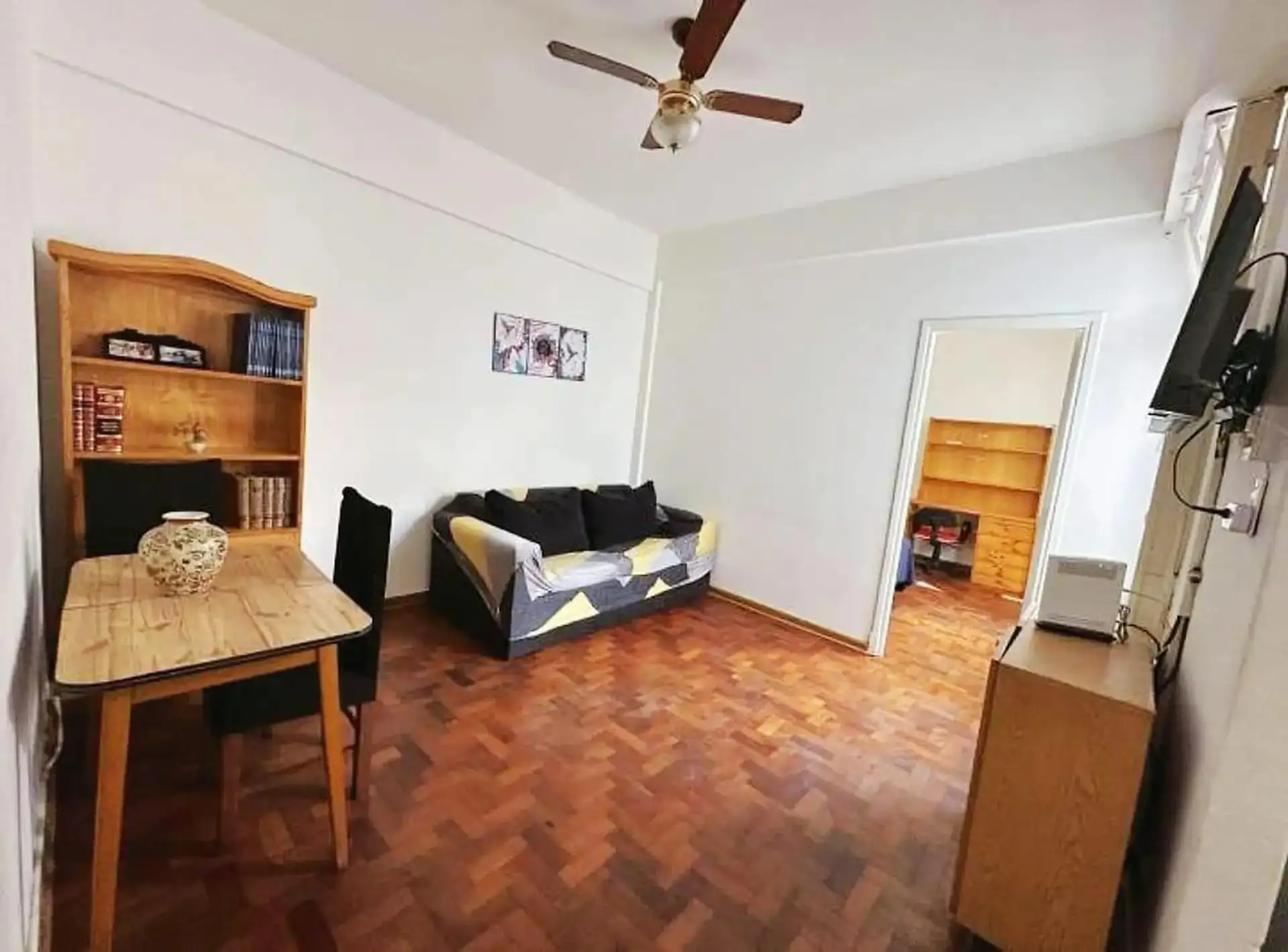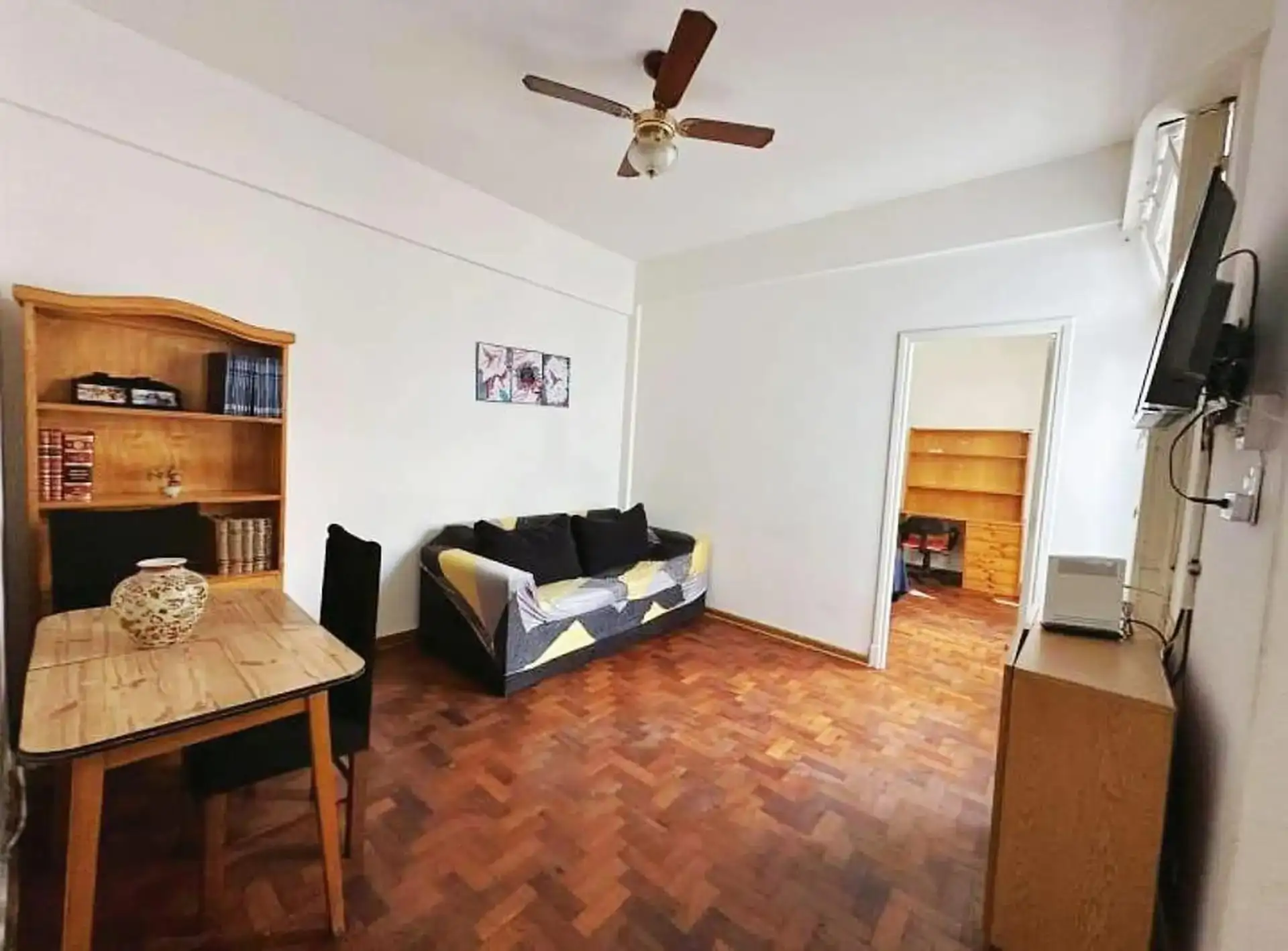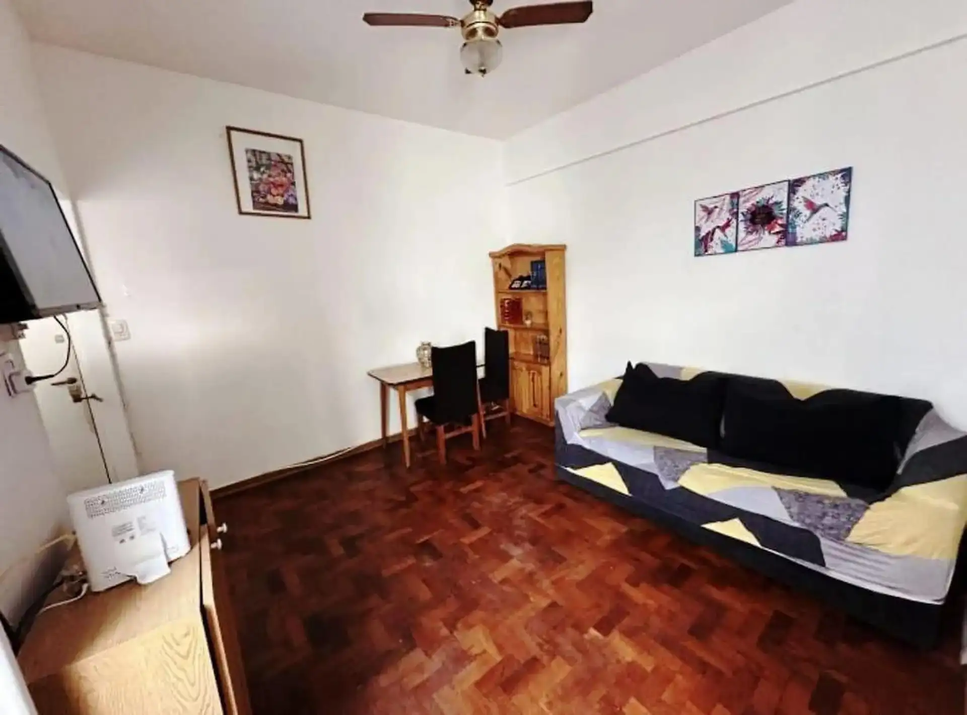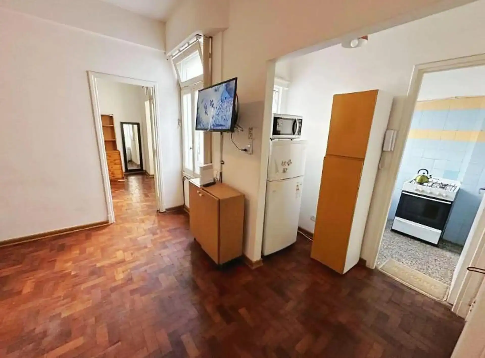 Квартира с двумя комнатами (1 спальня) на 2-м этаже без лифта, через лестницу. Общая меблировка и оснащение, деревянные полы. В гостиной-столовой есть телевизор и потолочный вентилятор. В спальне двуспальный матрас-sommier (матрас не входит в комплект), установлены кондиционер и потолочный вентилятор, есть встроенные шкафы, письменный стол. Ванная комната с ванной в suite. Отдельная кухня с холодильником с морозильной камерой и микроволновой печью, установлена стиральная машина (lavarropas). Ест