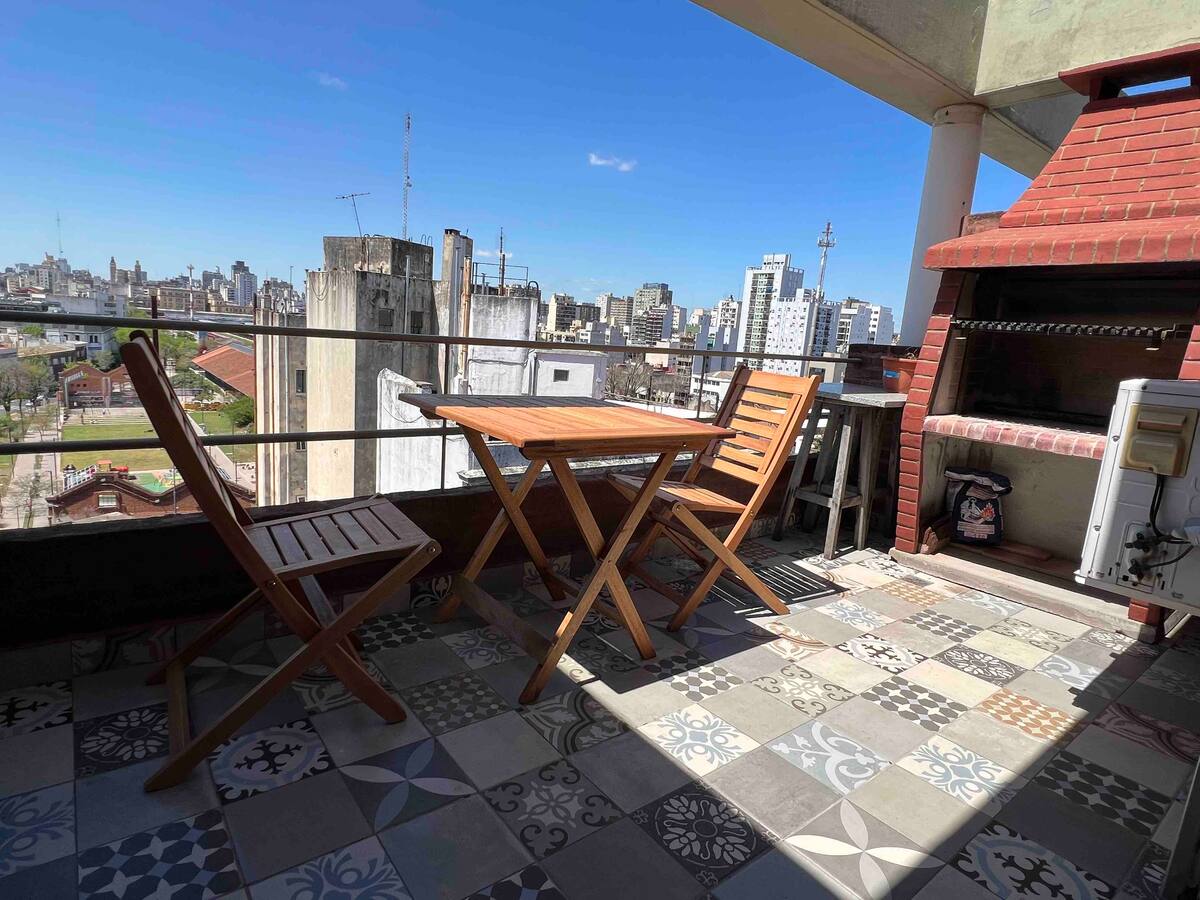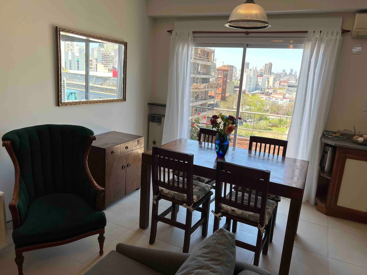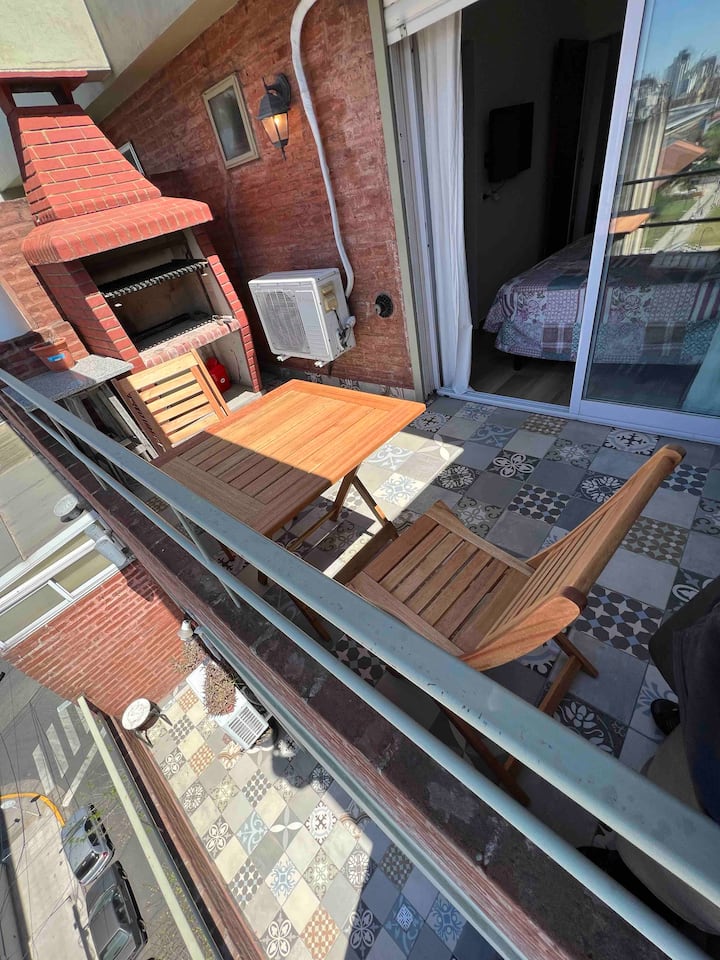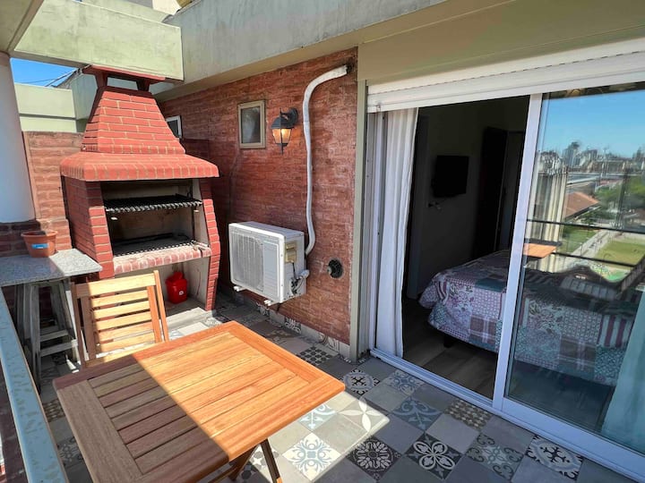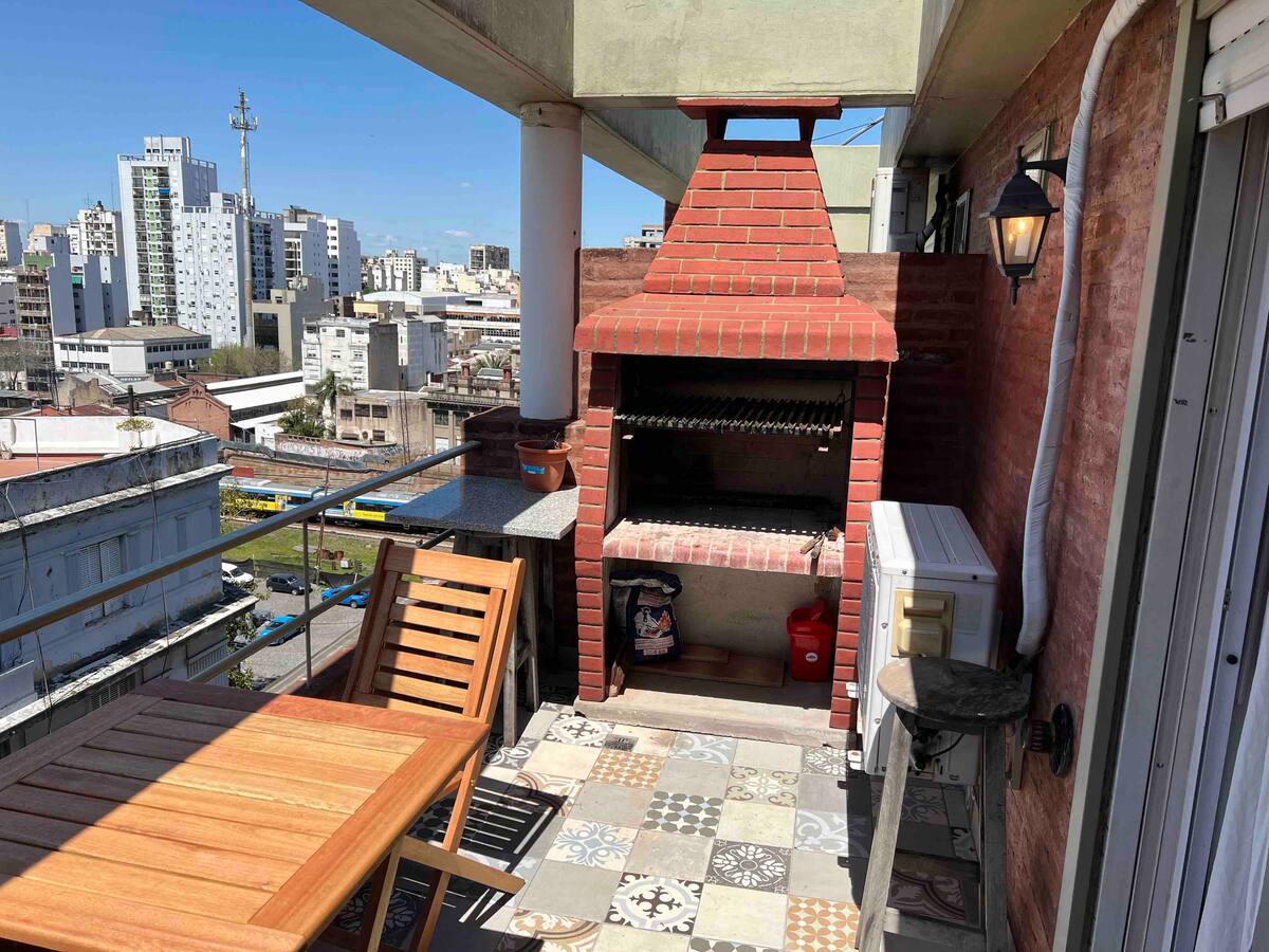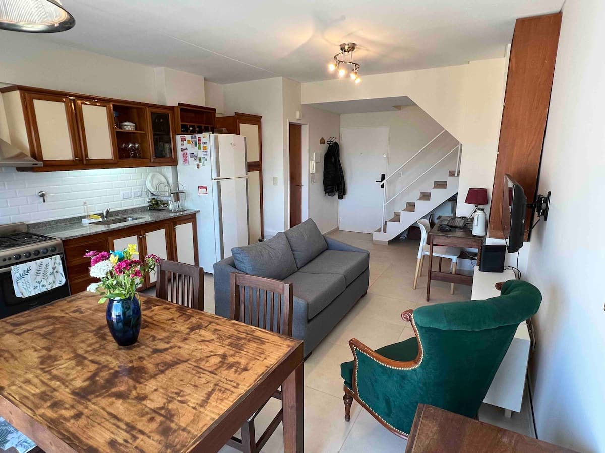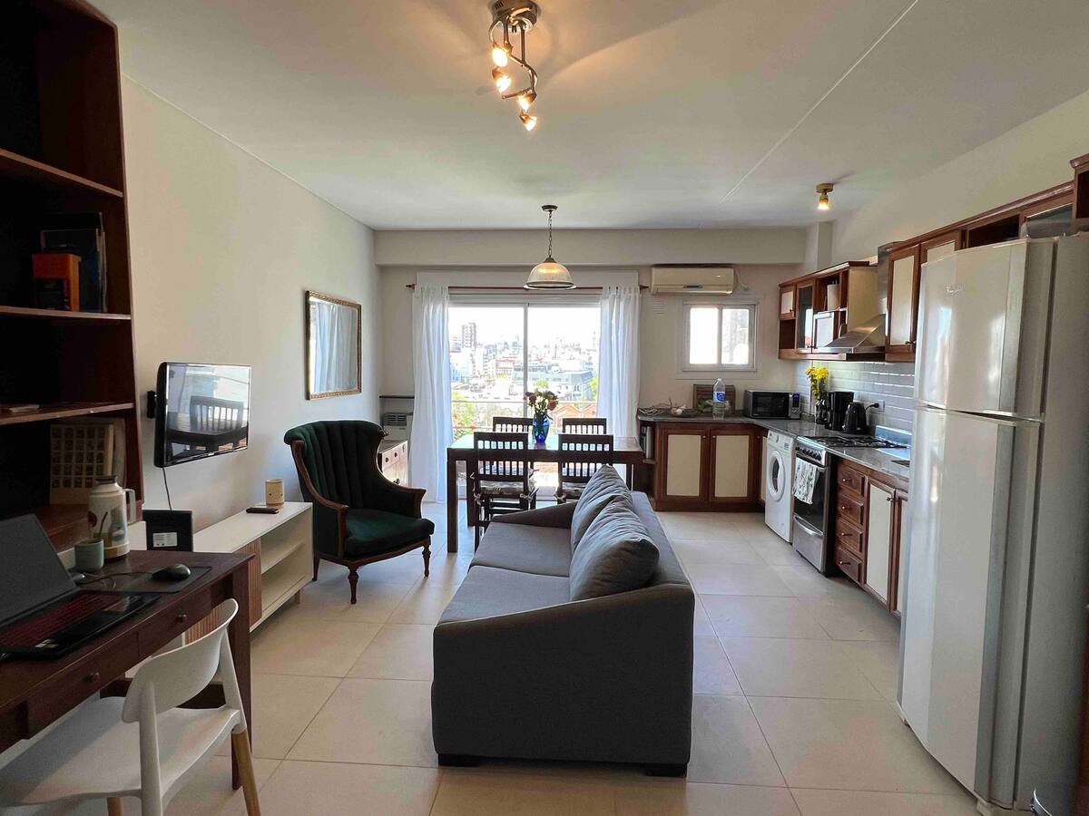 Квартира-дуplex площадью на двух уровнях в Almagro, полностью меблирована и оборудована. На нижнем уровне кухня, гостиная и столовая, туалет; на верхнем — спальня, гардероб и ванная комната. Есть балкон внизу и терраса на верхнем уровне с зоной гриля, окна с видом на город. В квартире установлены кондиционер и плита на обоих этажах, два телевизора с сигналом Open Digital TV, WiFi. На обеих уровнях предусмотрены отдельные рабочие зоны, управление входом по коду или по отпечатку пальца. В районе п