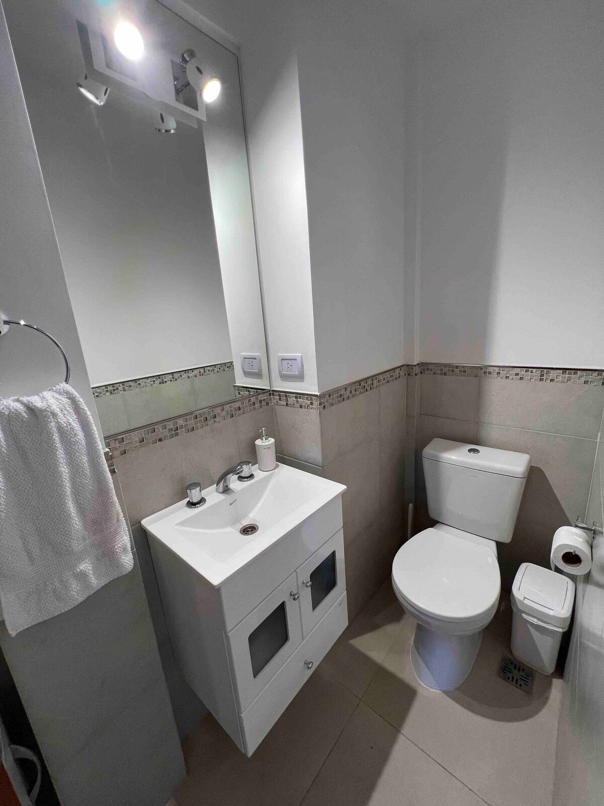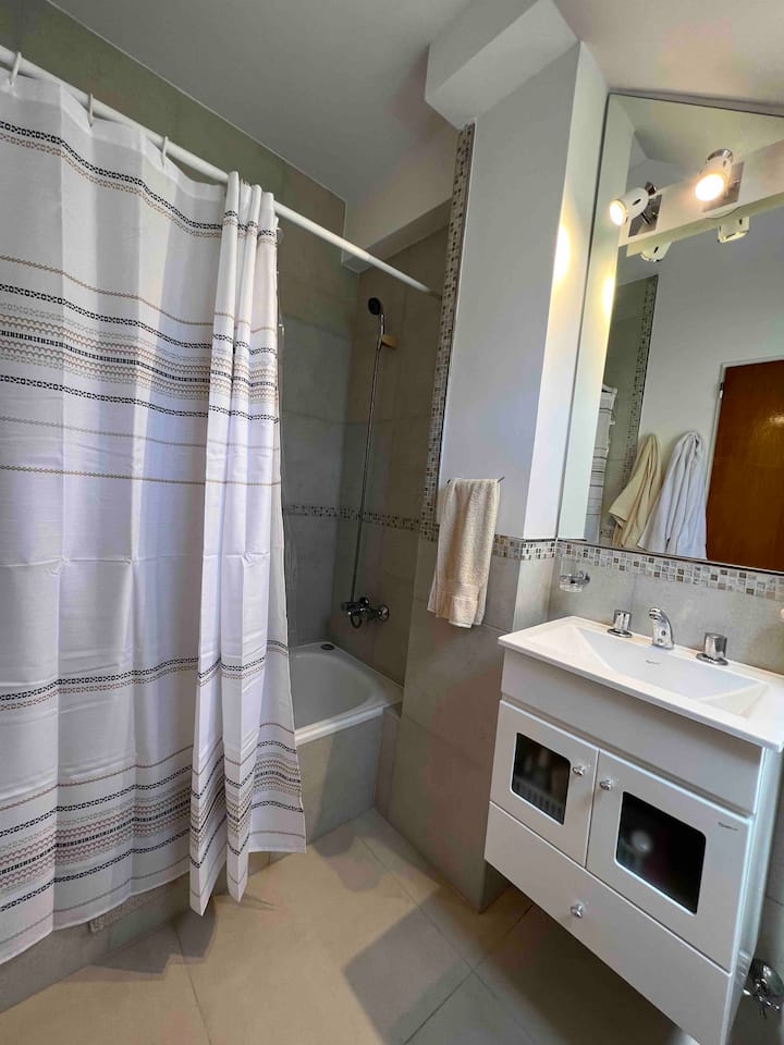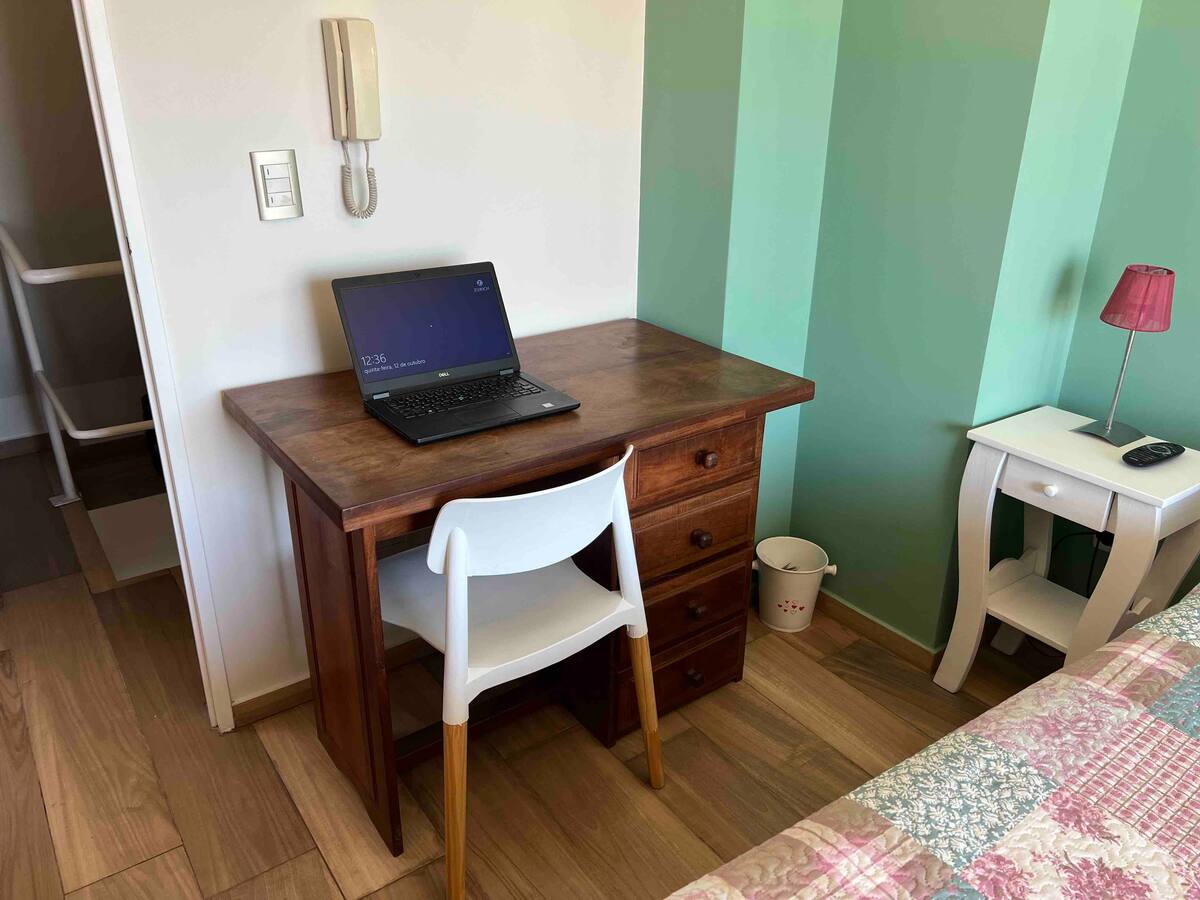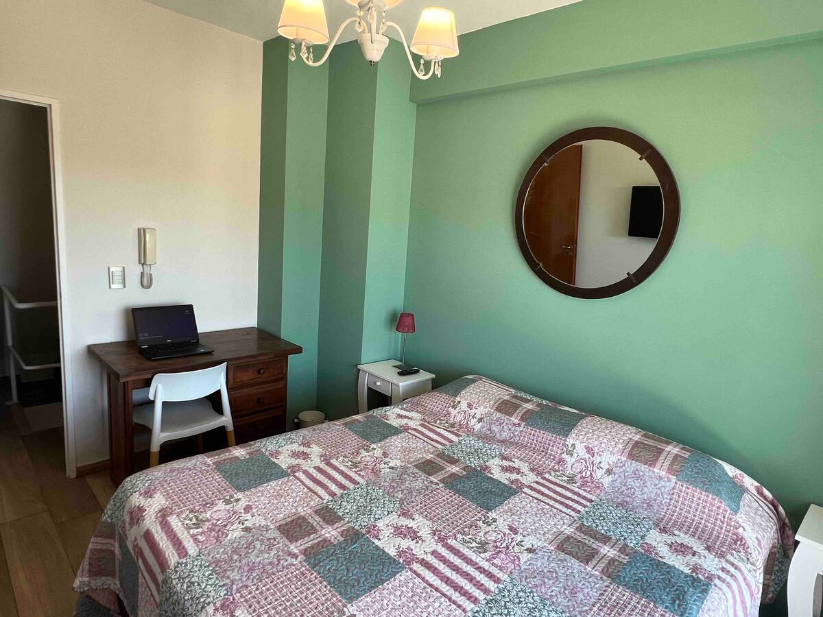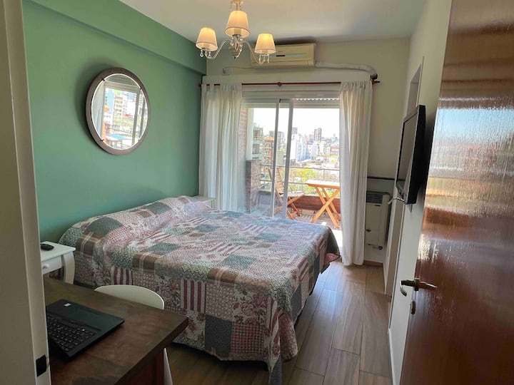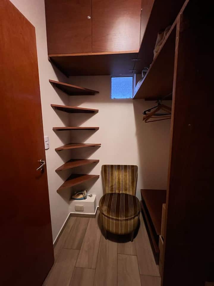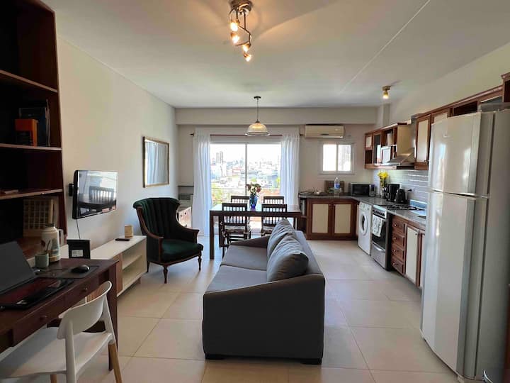Квартира-дуplex площадью на двух уровнях в Almagro, полностью меблирована и оборудована. На нижнем уровне кухня, гостиная и столовая, туалет; на верхнем — спальня, гардероб и ванная комната. Есть балкон внизу и терраса на верхнем уровне с зоной гриля, окна с видом на город. В квартире установлены кондиционер и плита на обоих этажах, два телевизора с сигналом Open Digital TV, WiFi. На обеих уровнях предусмотрены отдельные рабочие зоны, управление входом по коду или по отпечатку пальца. В районе п