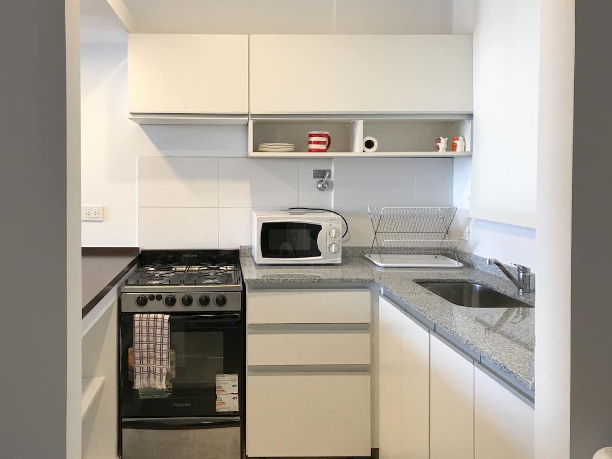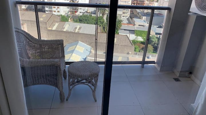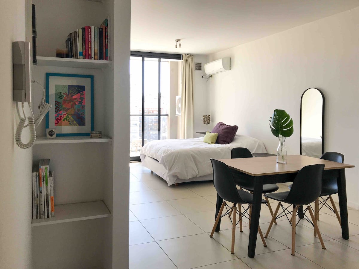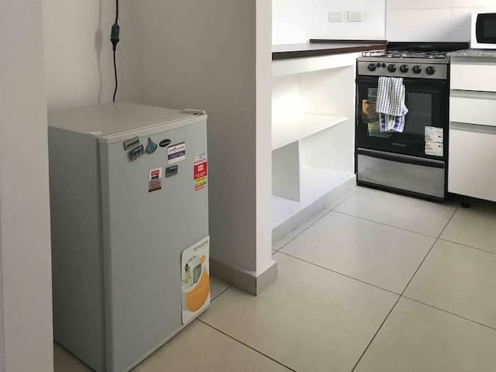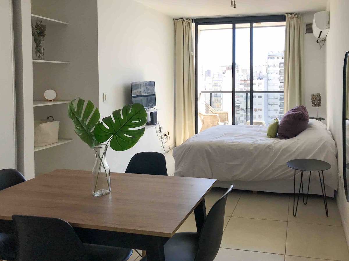 Квартира-студия площадью 41 m² в Avellaneda с балконом; окна выходят на внутренний двор квартала с зелёной зоной. Кухня полностью оборудована, включая мини-холодильник и кухонную утварь. Кондиционер hot/cold и смарт-телевизор с доступом к Netflix и другим приложениям, кабельного телевидения нет.
