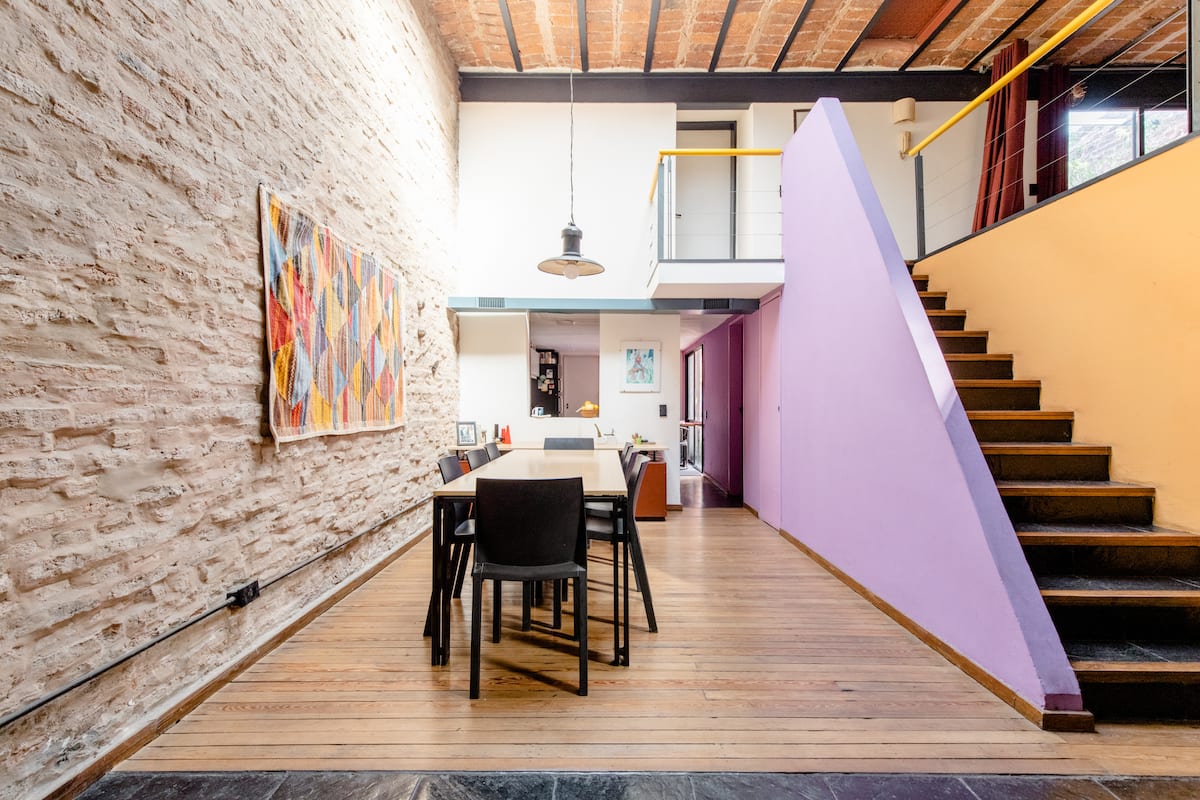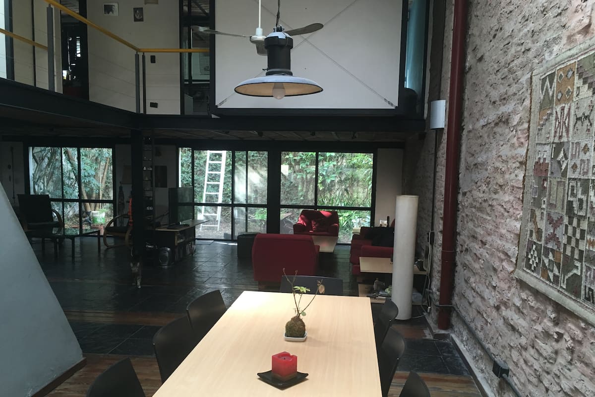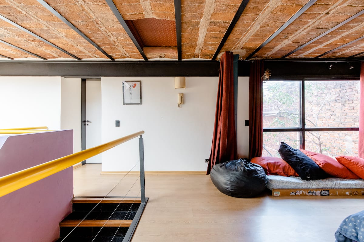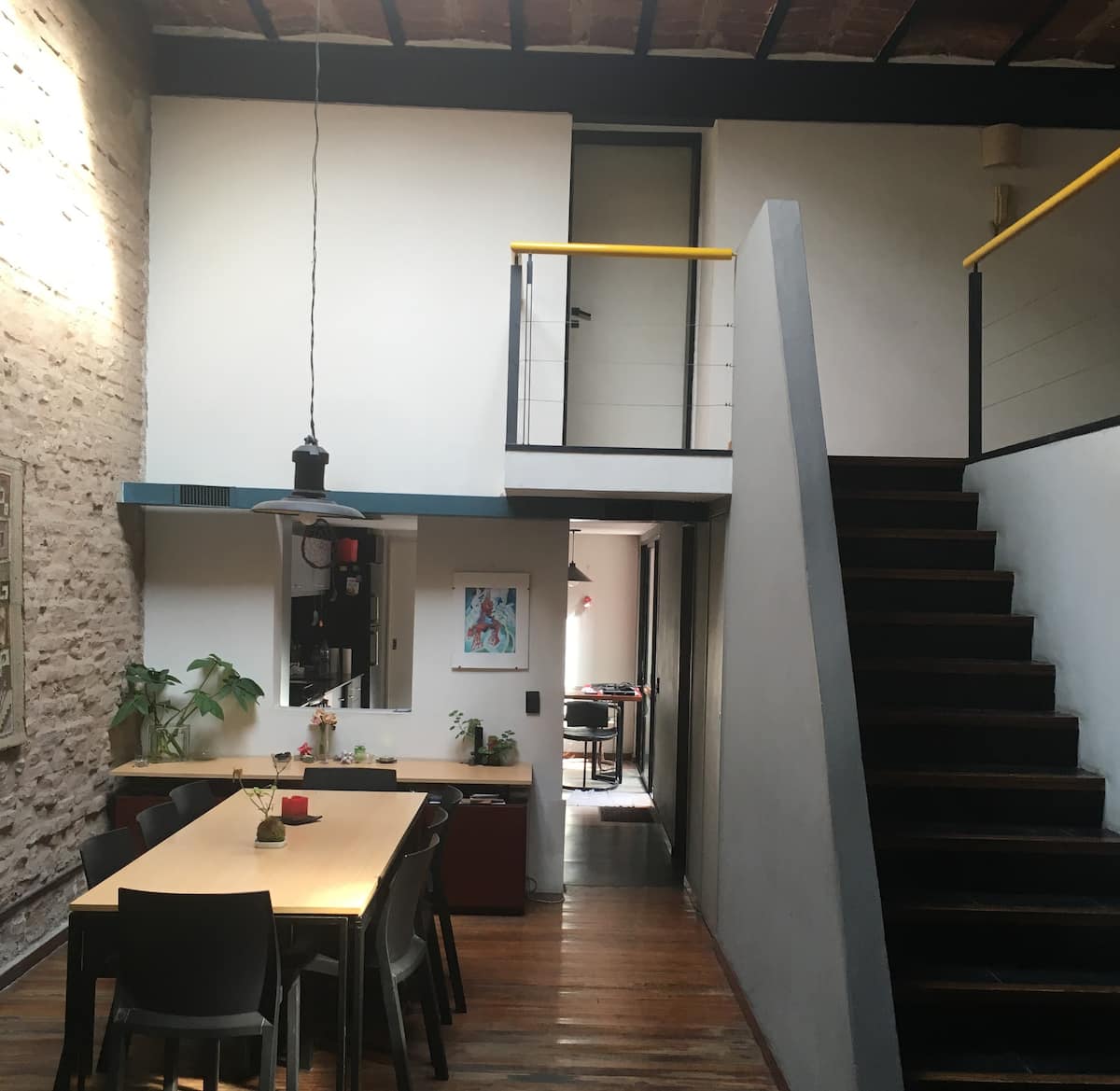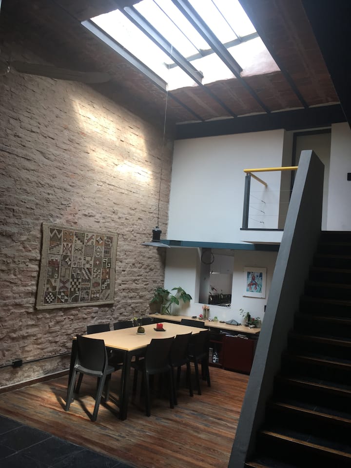 Квартира в формате лофта в доме с двойной высотой, общие помещения и два приватных пространства. Помещение на цокольном уровне связано с домом и выходит во внутренний сад; приватность обеспечивается занавесками. В лофте предусмотрены 4 комнаты (одна скрыта занавесками), отдельная зона на уровне антресоли и зона на цокольном уровне с занавесками; остальное пространство используется совместно. Общие помещения включают гостиную, оборудованную кухню, обеденную зону, доступ к патио, зону гриля, перед