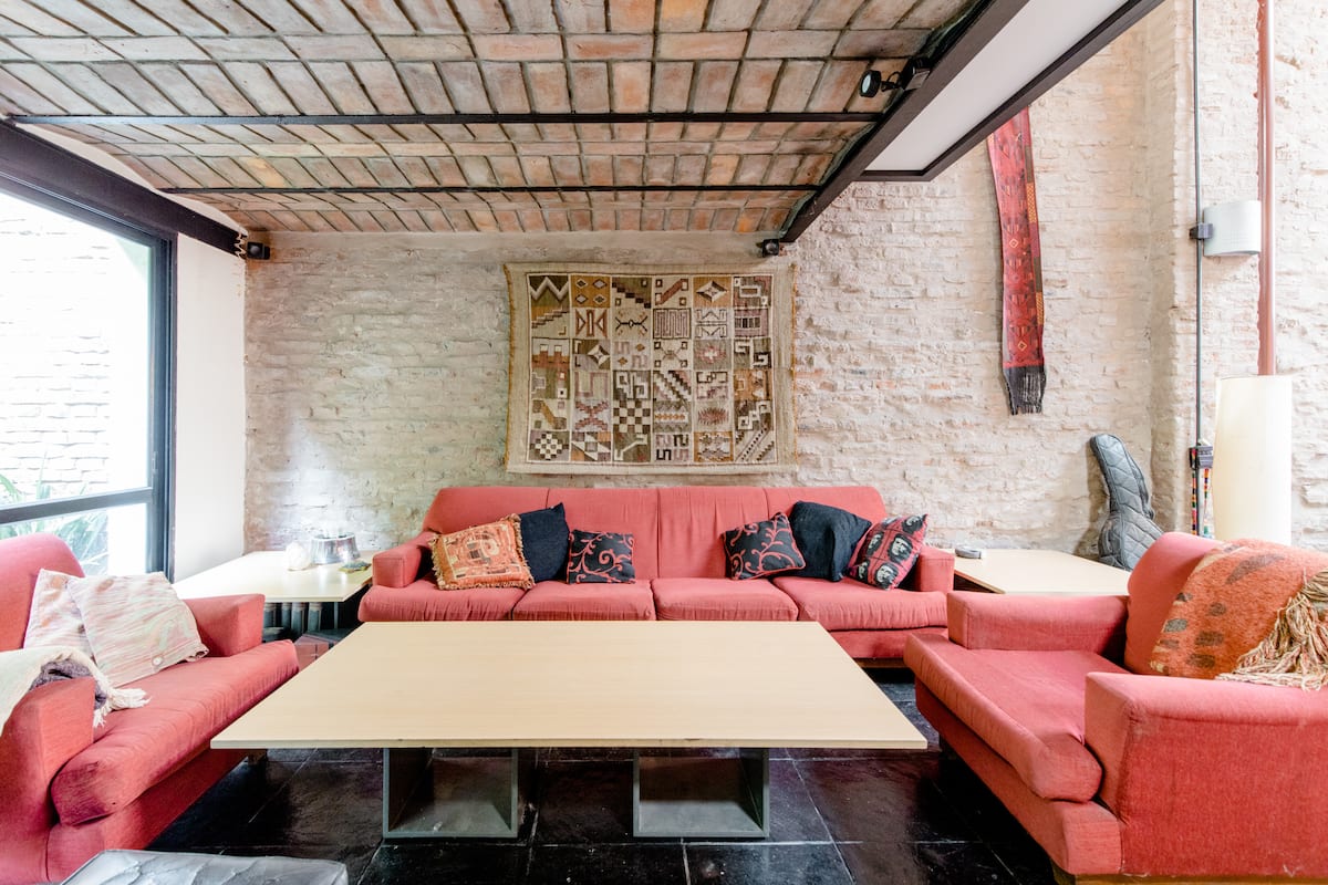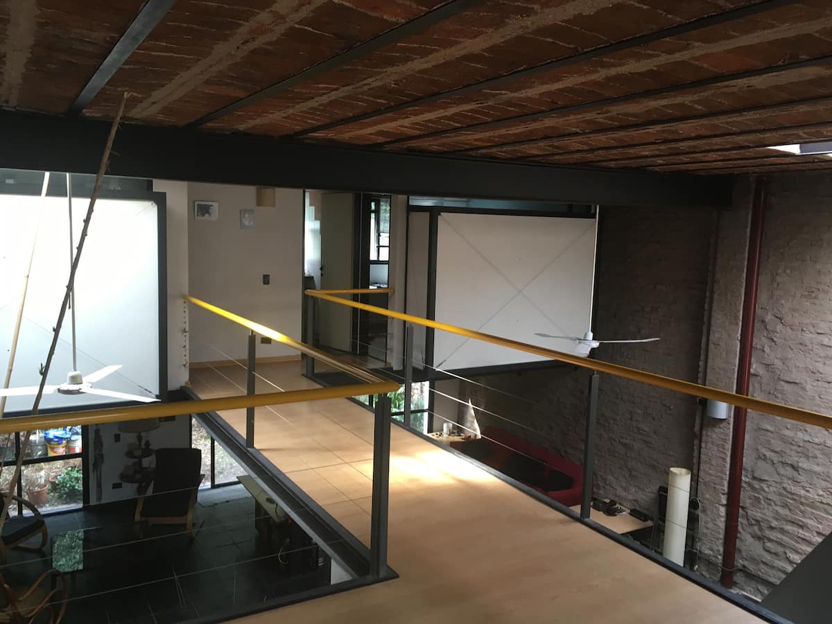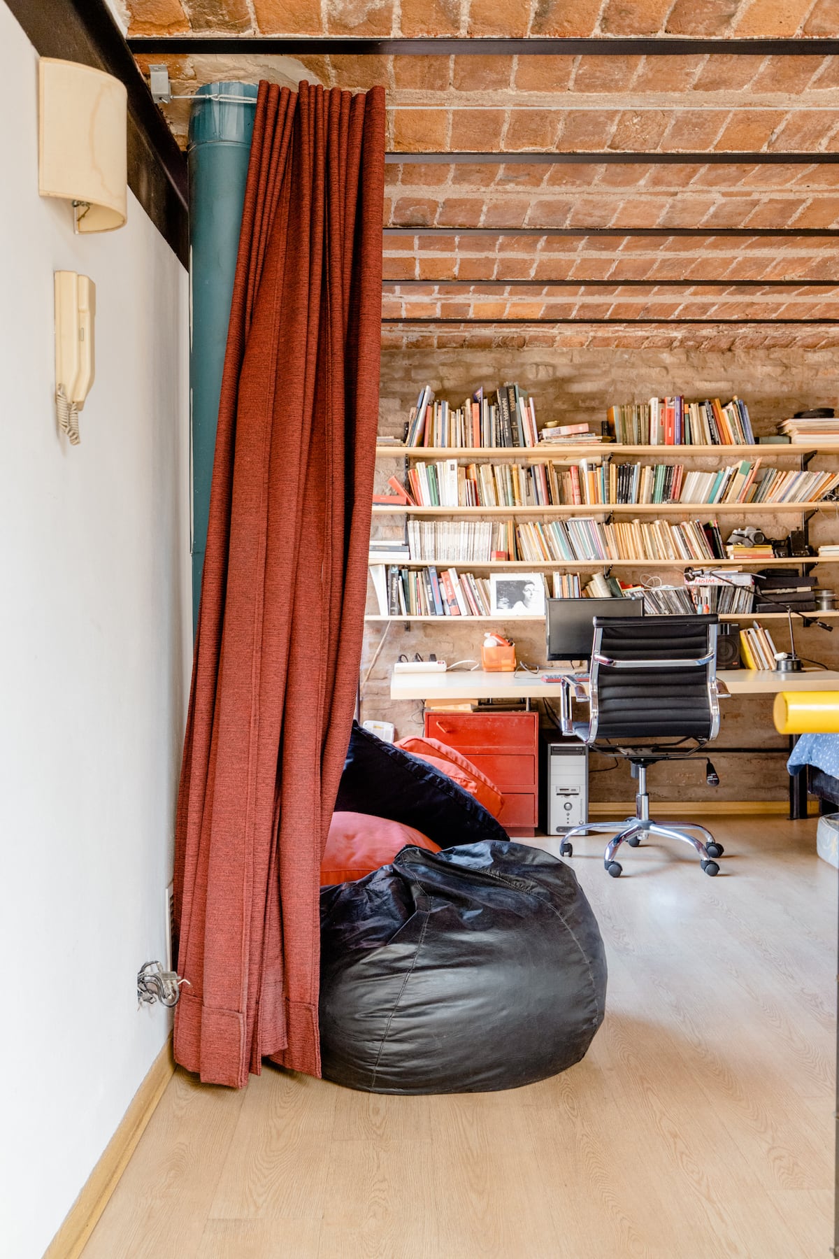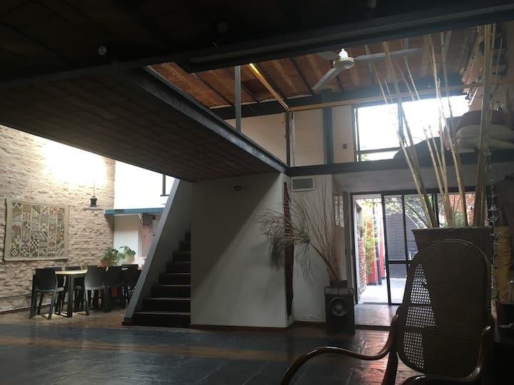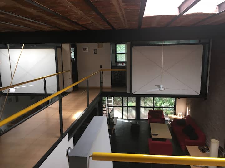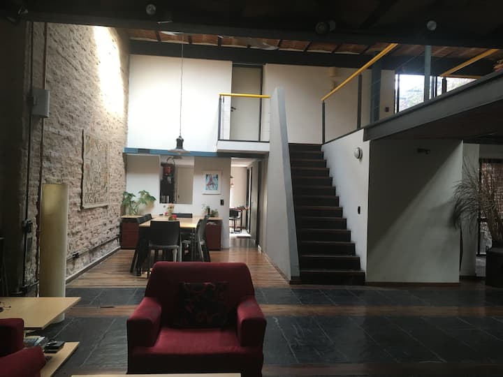 Квартира в формате лофта в доме с двойной высотой, общие помещения и два приватных пространства. Помещение на цокольном уровне связано с домом и выходит во внутренний сад; приватность обеспечивается занавесками. В лофте предусмотрены 4 комнаты (одна скрыта занавесками), отдельная зона на уровне антресоли и зона на цокольном уровне с занавесками; остальное пространство используется совместно. Общие помещения включают гостиную, оборудованную кухню, обеденную зону, доступ к патио, зону гриля, перед