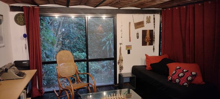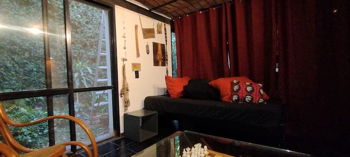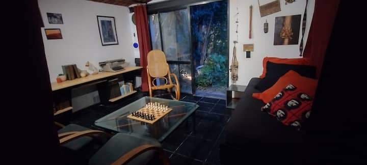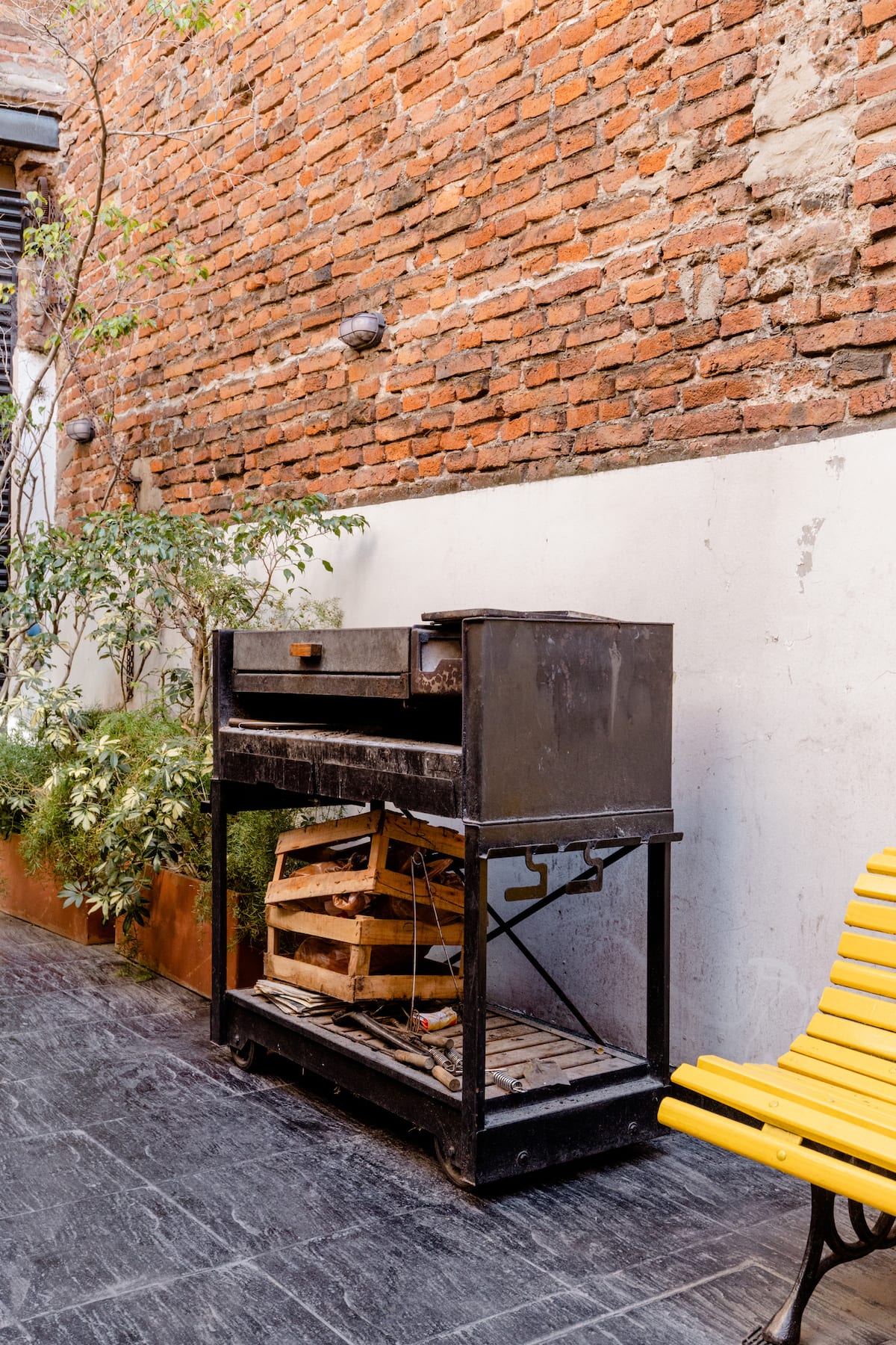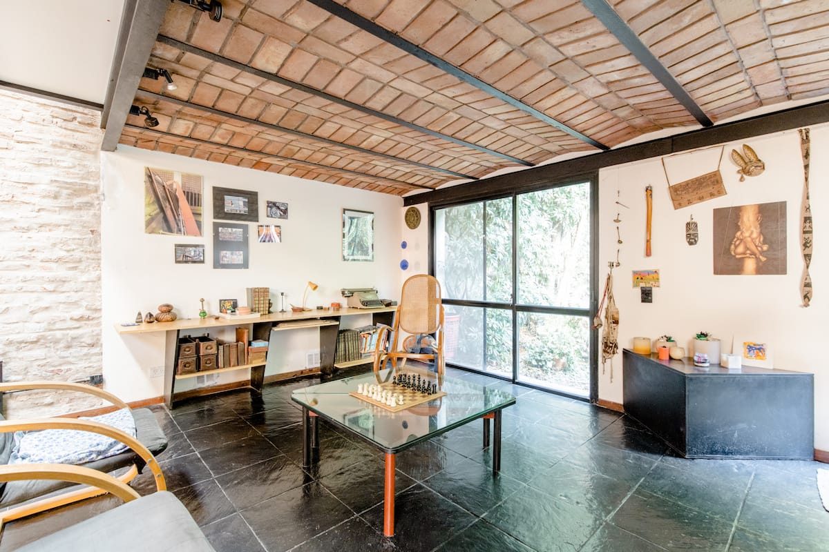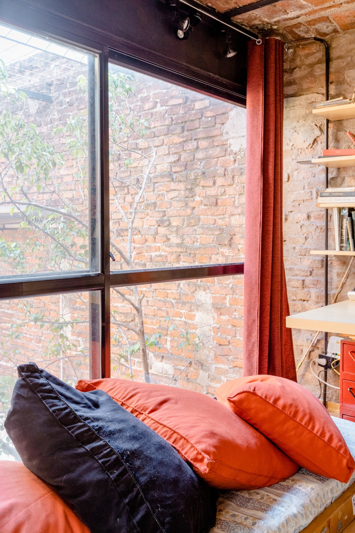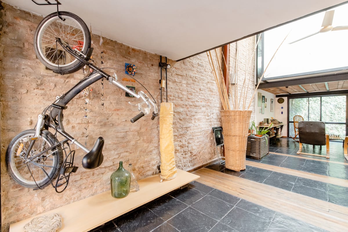 Квартира в формате лофта в доме с двойной высотой, общие помещения и два приватных пространства. Помещение на цокольном уровне связано с домом и выходит во внутренний сад; приватность обеспечивается занавесками. В лофте предусмотрены 4 комнаты (одна скрыта занавесками), отдельная зона на уровне антресоли и зона на цокольном уровне с занавесками; остальное пространство используется совместно. Общие помещения включают гостиную, оборудованную кухню, обеденную зону, доступ к патио, зону гриля, перед