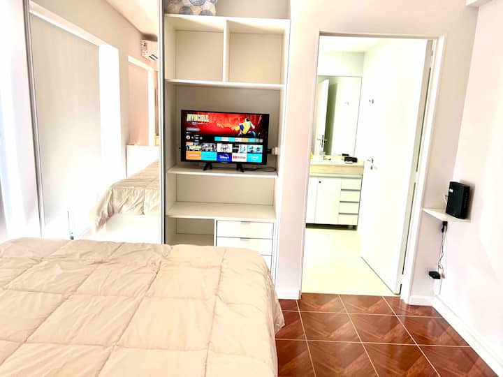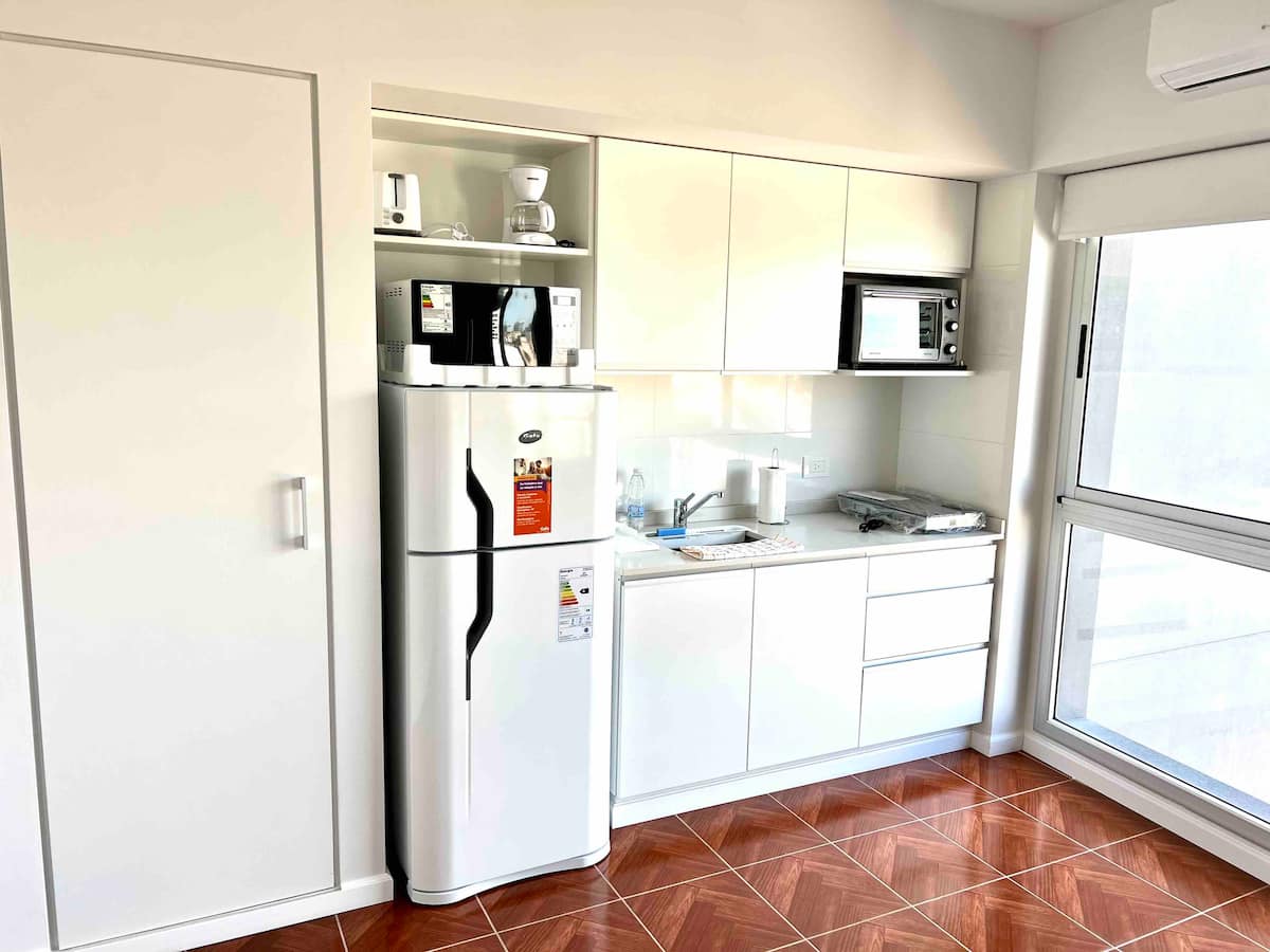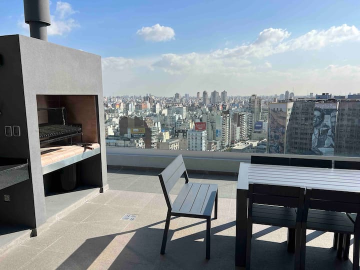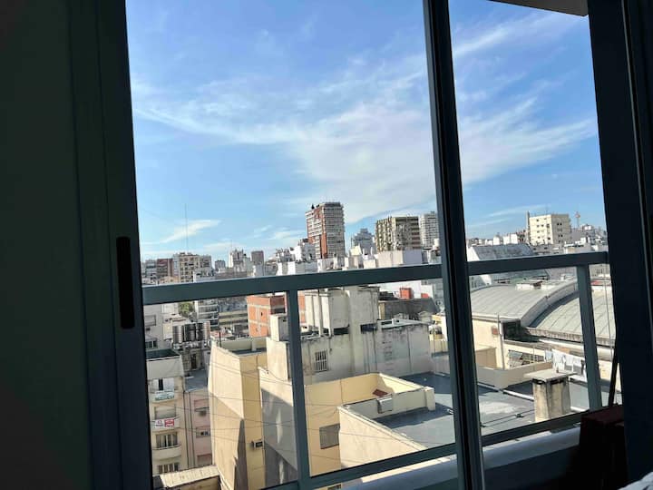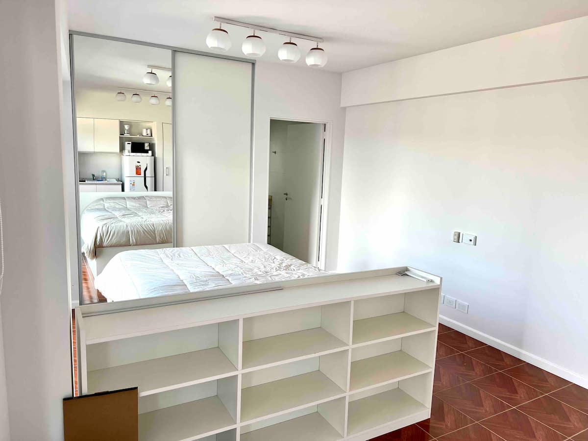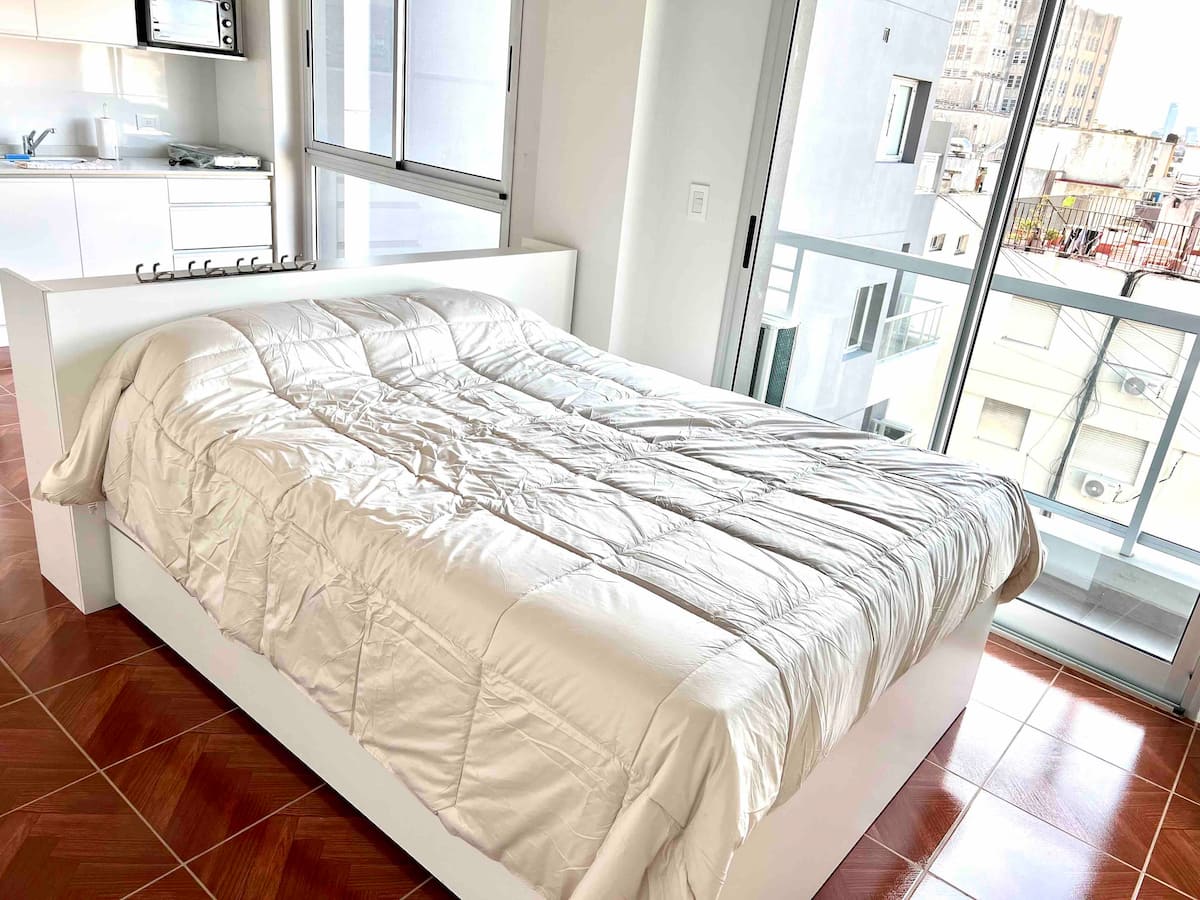 Квартира-студия в современном здании в Balvanera с круглосуточной охраной и удобствами. Площадь и этаж не указаны. В студии собственная ванная комната, двуспальная кровать и всё необходимое для готовки; под кроватью есть дополнительная кровать длиной 1.7 метра. В наличии кондиционер. Доступ предоставляется в спортзал, прачечную и зону гриля в здании.