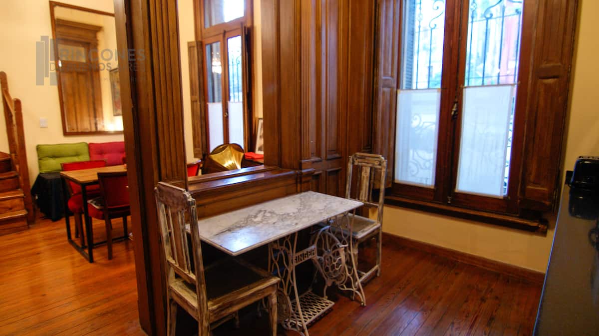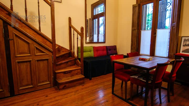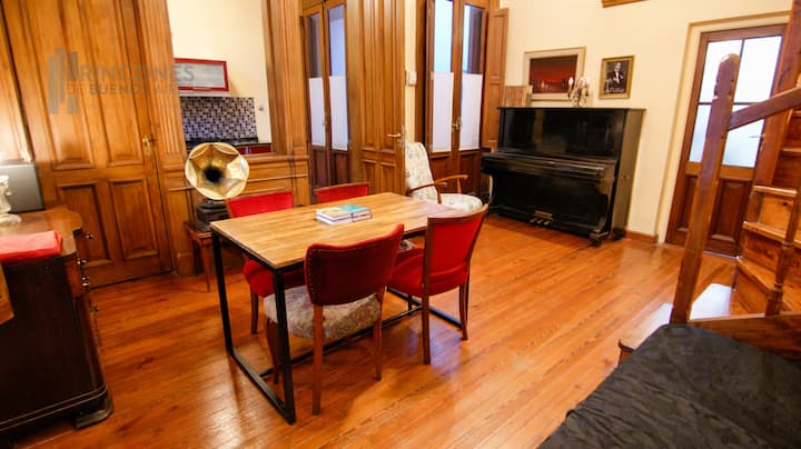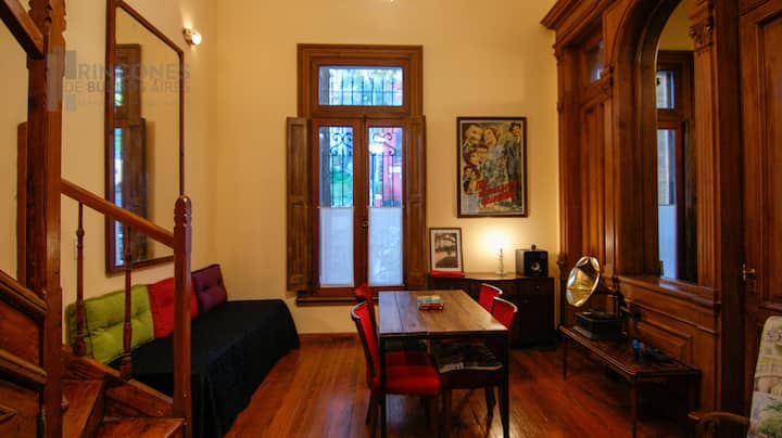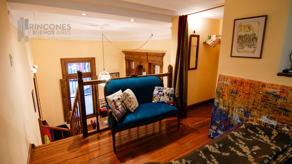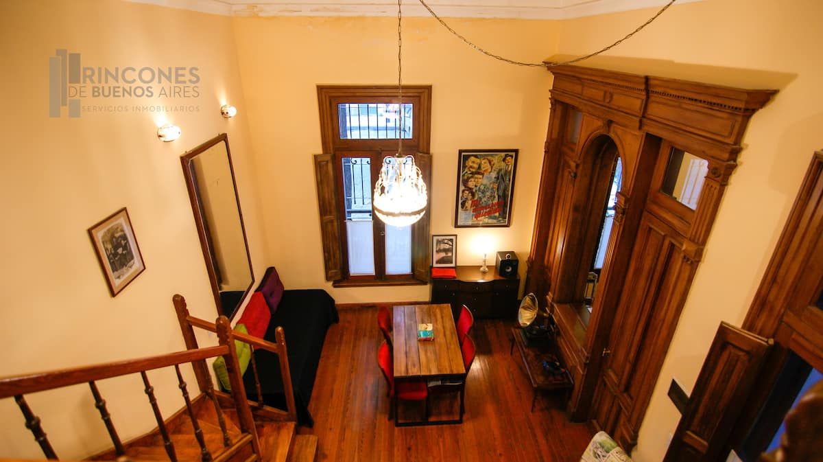 Квартира-лофт в здании в французском стиле 1901 года в Barracas. Две большие окна выходят на улицу с деревьями. Внутри: кухня, гостиная и ванная на первом этаже, затем по деревянной лестнице на верхний уровень есть комната со встроенным шкафом. В здании сохранены элементы отделки, включая лепнину, фрески, boiserie, витражи, мрамор, столярные изделия и сводчатые перекрытия в два уровня. Внутренние части связаны центральными двориками, есть приток воздуха и света.