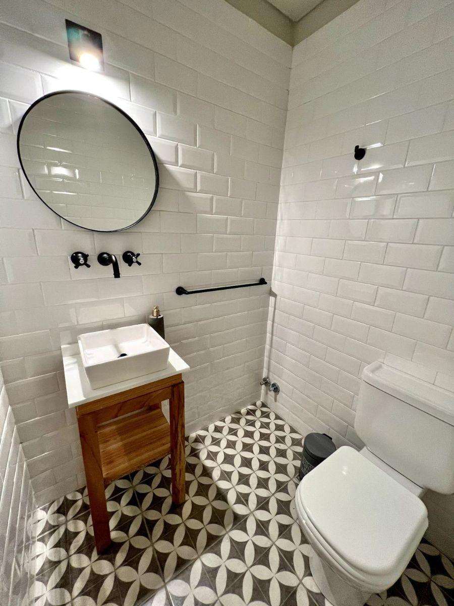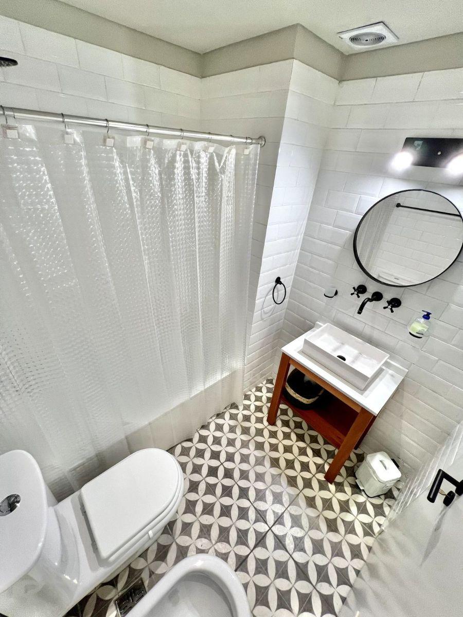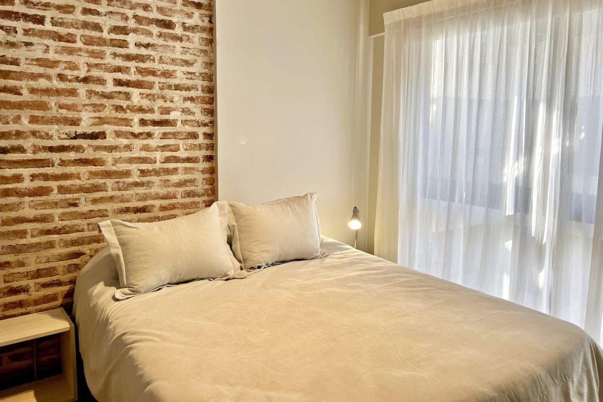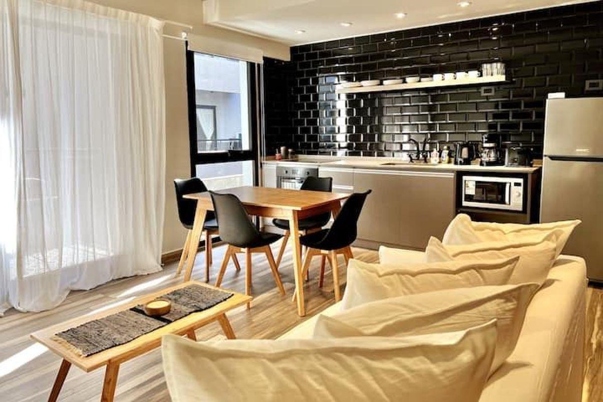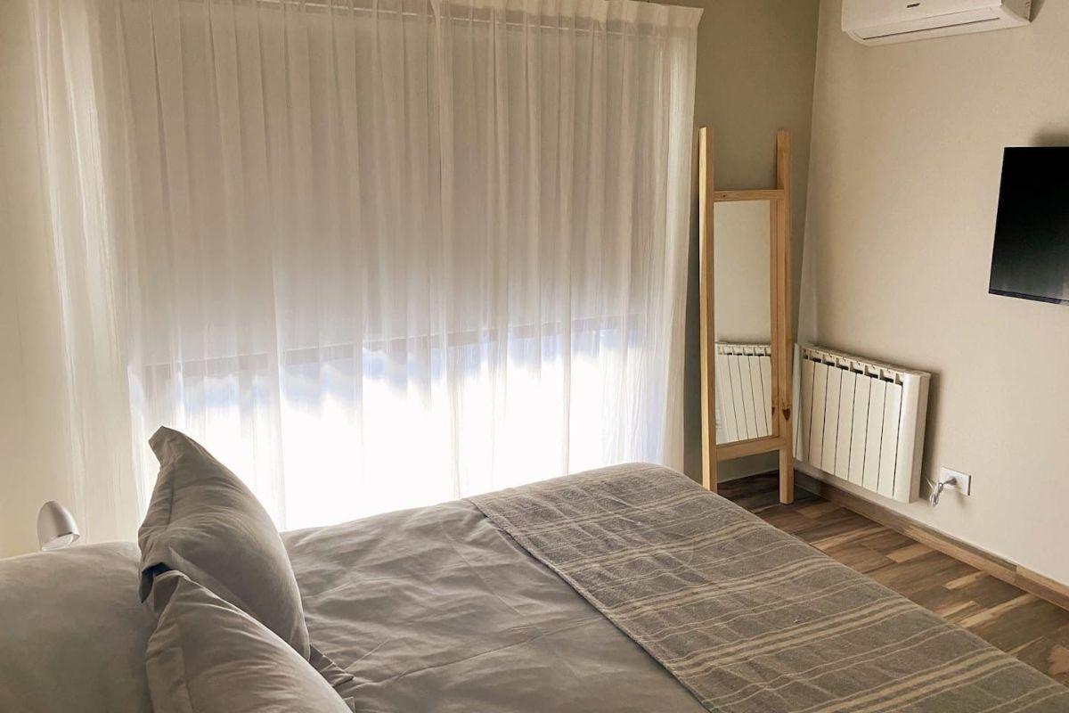 Квартира из двух комнат площадью 2 ambientes (1 спальня и гостиная) на 2-м этаже в здании на 4 этажа, с мебелью и оснащением. Вход в гостиную-столовую с выходом на балкон; кухня интегрирована в общую зону и выходит к большой барной стойке. Есть гостевой туалет и спальня с открытым гардеробом. В здании предусмотрены бассейн с двумя соляриями, зона кухни, холодильники, тренажёрный зал и прачечная в полуподвальном уровне с стиральными и сушильными машинами; круглосуточная охрана и рецепция. Арендна