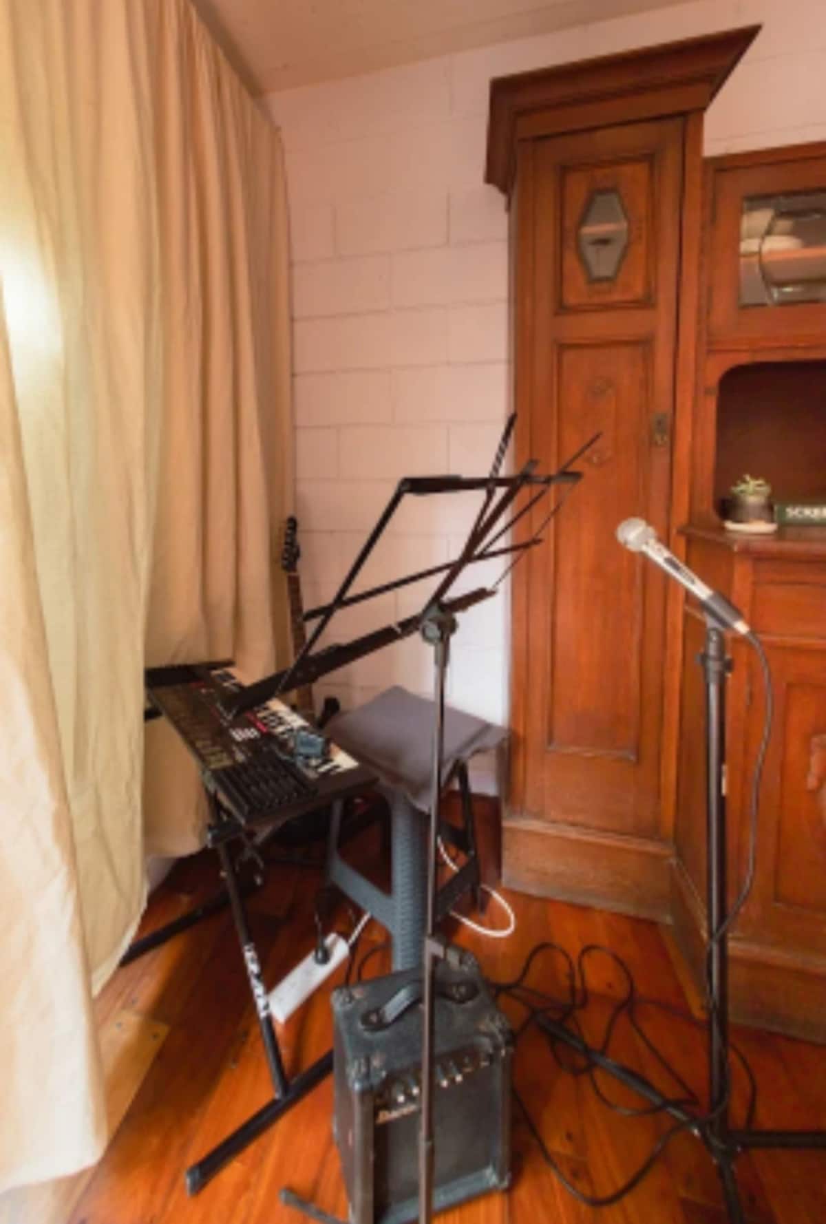 В квартире есть гостиная с микрофоном, колонкой и гитарой. В числе удобств гидромассажная ванна, зона гриля и телевизор.