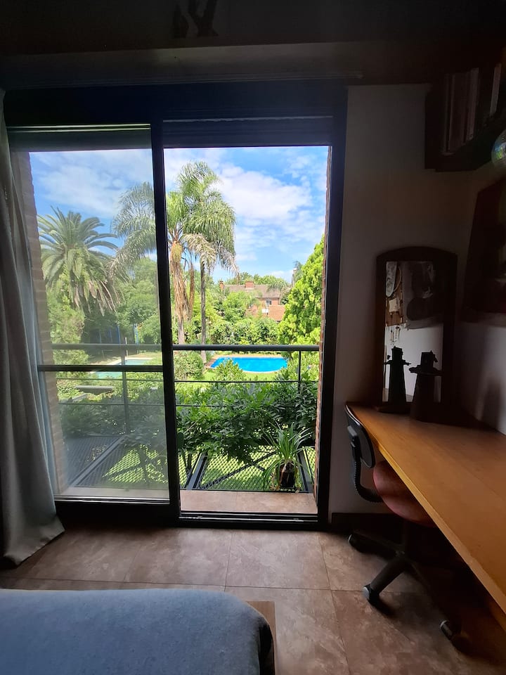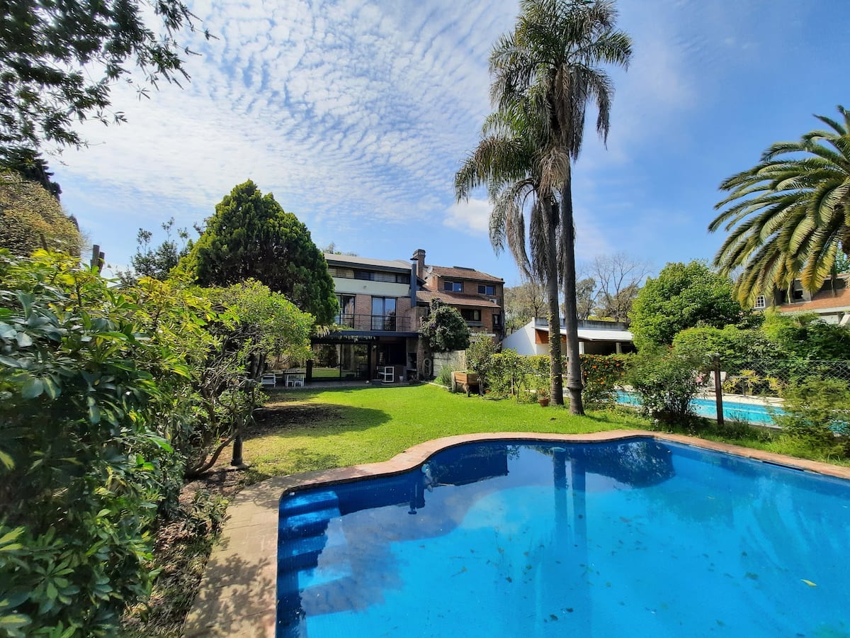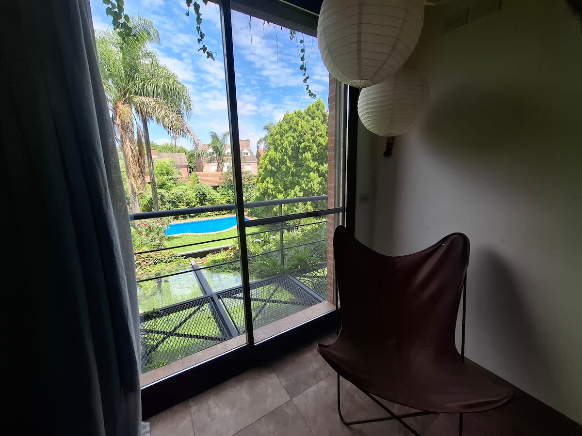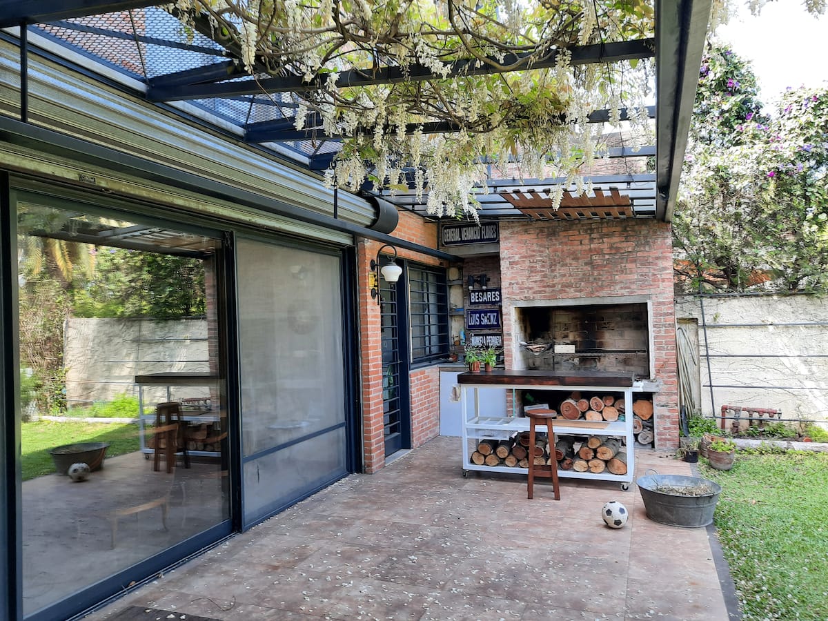 Апартаменты в Beccar с 1 спальней и гостиной, размещение рассчитано на 3 гостей. В доме 3 этажа; на первом этаже две комнаты с выходом в сад через балкон и ванная комната с ванной. Есть Wi‑Fi и отдельная рабочая зона, доступ к кабельной сети. На территории предусмотрены сад, зона гриля, бассейн и (закреплённые) места для парковки во внутреннем дворе.