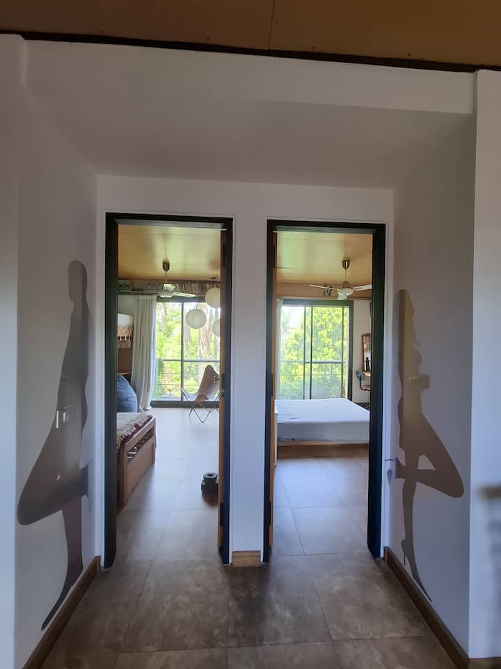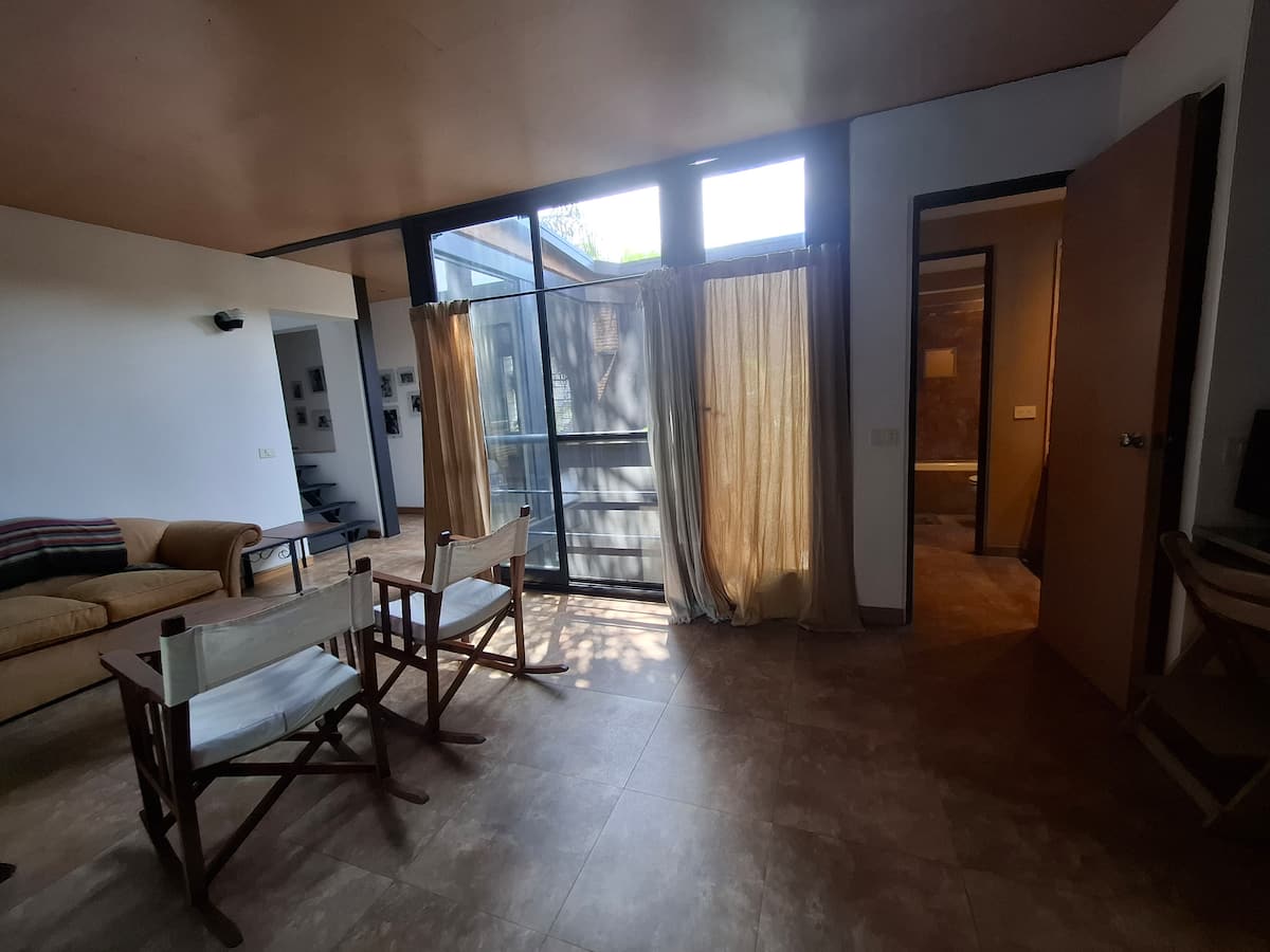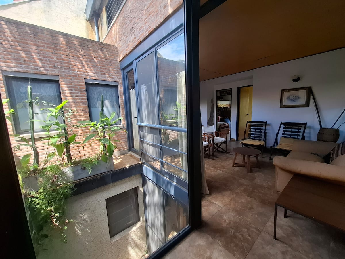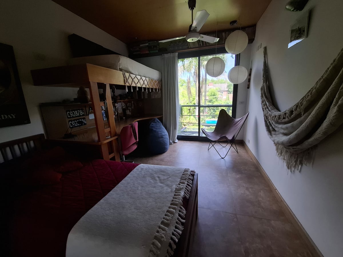 Апартаменты в Beccar с 1 спальней и гостиной, размещение рассчитано на 3 гостей. В доме 3 этажа; на первом этаже две комнаты с выходом в сад через балкон и ванная комната с ванной. Есть Wi‑Fi и отдельная рабочая зона, доступ к кабельной сети. На территории предусмотрены сад, зона гриля, бассейн и (закреплённые) места для парковки во внутреннем дворе.