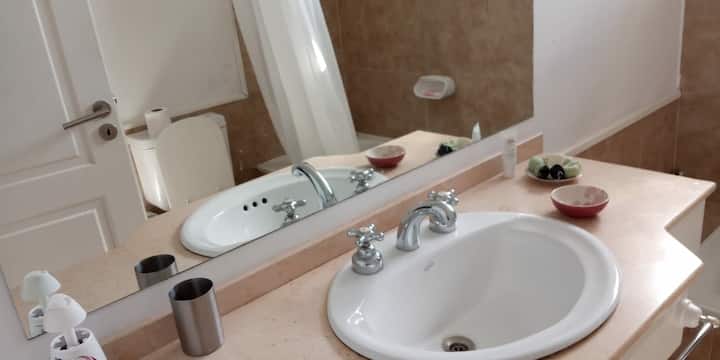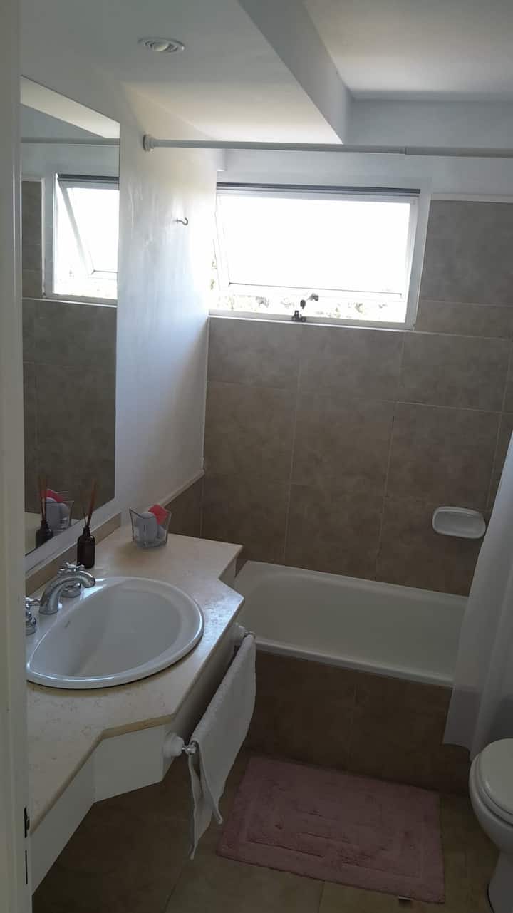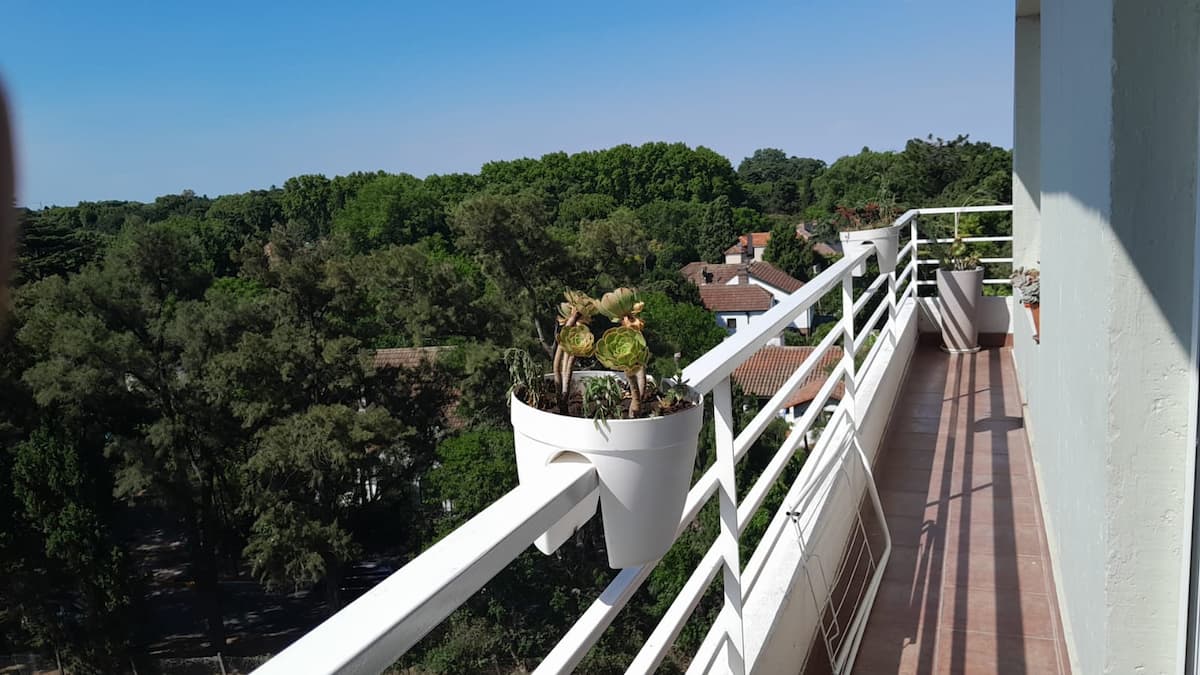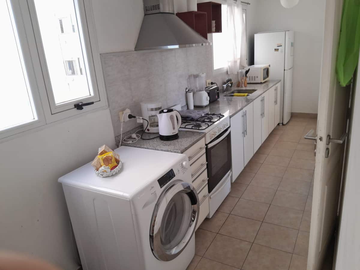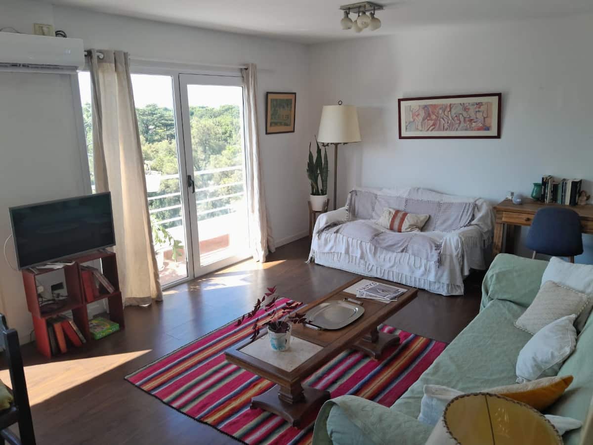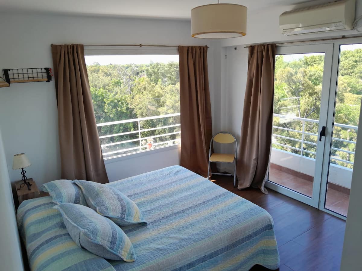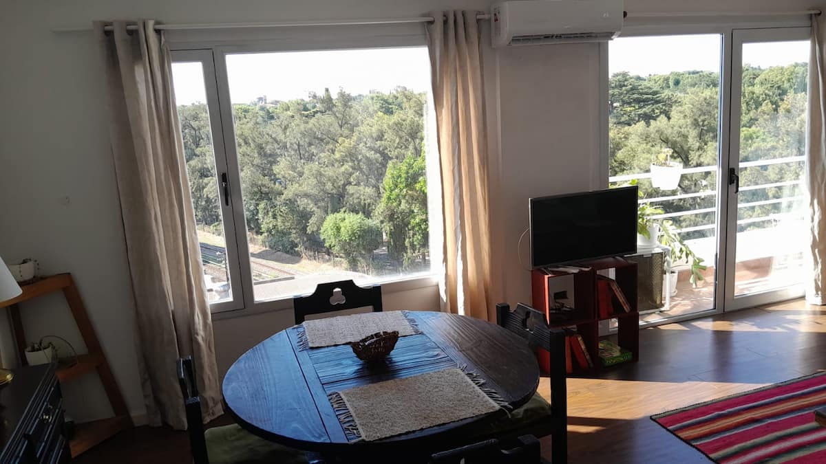 Квартира в Beccar, San Isidro, на 6-м этаже с большими окнами и видом на внутренние сады района. Есть гостиная, газовая кухня, полноценная ванная и спальня с двуспальной кроватью, которую можно разделить на 2 односпальные. В гостиной предусмотрен диван-кровать; по запросу добавляется матрас на полу для 4-го гостя. В здании есть гараж, входной холл и охрана 24 часа в сутки, установлены кондиционеры холод/тепло. Указано, что здание находится рядом с торговой зоной, на главной авеню и в половине кв