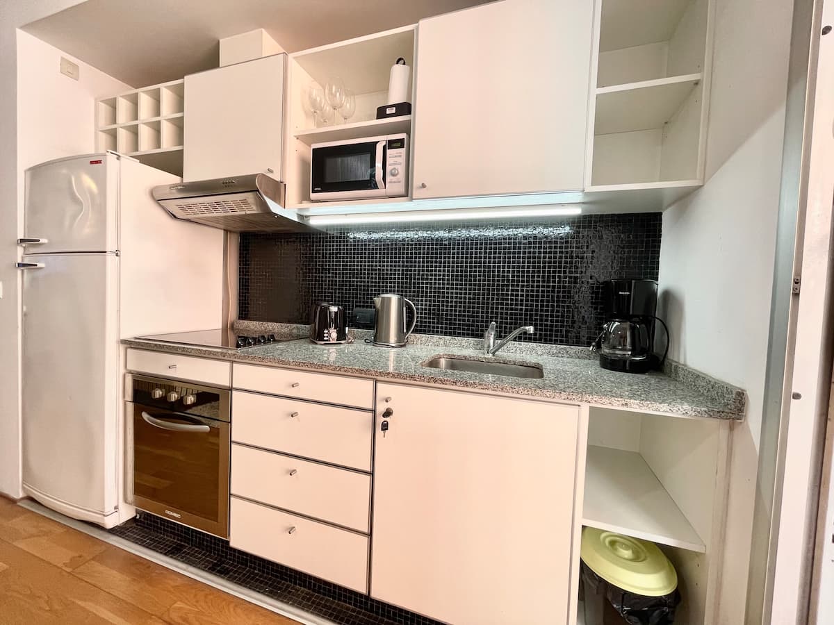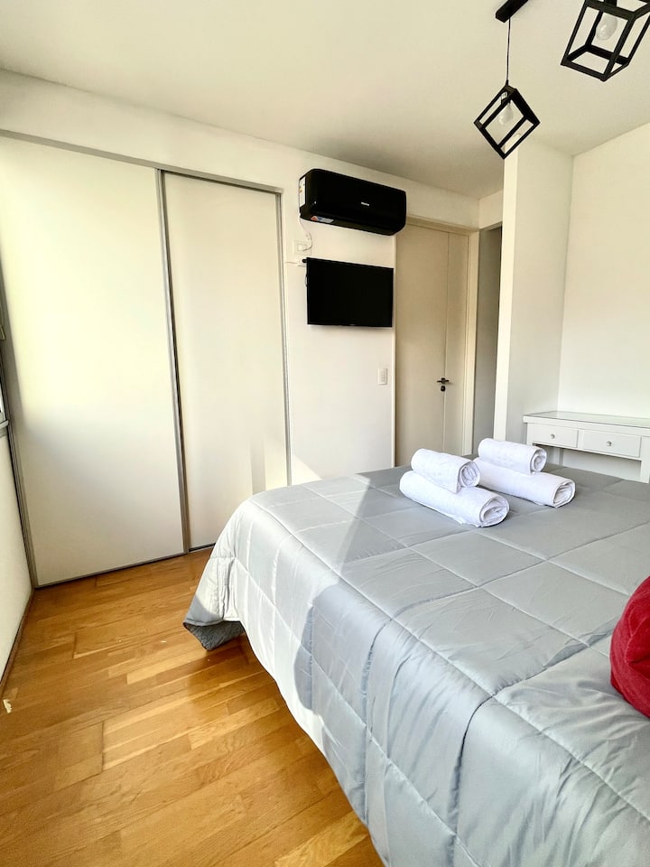 Квартира в Belgrano, 5-й этаж, с лифтом. Спальня с рабочим столом, кондиционер (обогрев/охлаждение), телевизор 32" и плотные шторы блэкаут. Ванная комната с биде и феном. Гостиная с кухней открытой планировки оснащена керамической варочной панелью и духовкой; есть кофеварка, электрическая пава, тостер и микроволновая печь. В распоряжении стол на 4 человека, постельное место на диване-кровати для 2, два телевизора (32" и 50"), балкон с мебелью и столом; также предусмотрены умный замок и интернет
