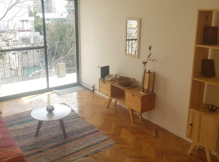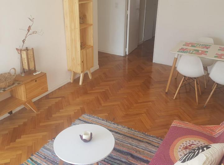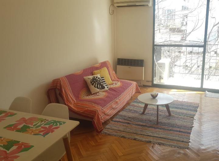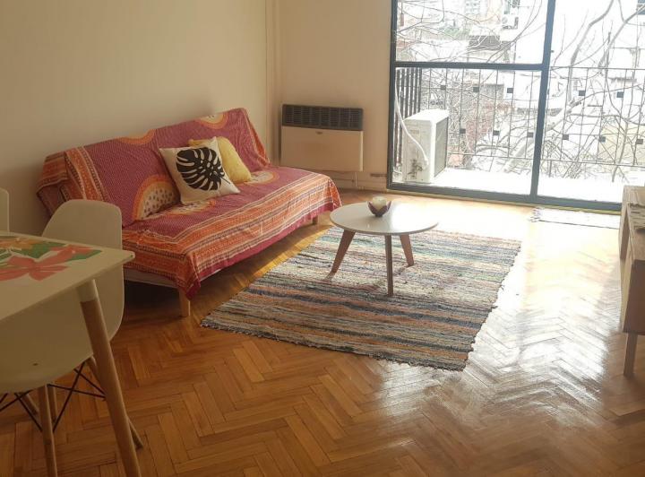 Квартира в Caballito на 4-м этаже: 2 комнаты (1 спальня и гостиная) общей площадью 42 m², из них 40 m² крытых и 2 m² открытых, окна на улицу с открытым видом и балконом. Квартира меблирована и полностью оборудована. В спальне двуспальная кровать, встроенный шкаф, тумба и автоматическая шторка на окне; в гостиной кондиционер и газовый отопительный прибор, выход на балкон. Кухня с плитой на 4 конфорки и духовкой, холодильником и стиральной машиной; ванная с ванной, биде и умывальником с тумбой. В