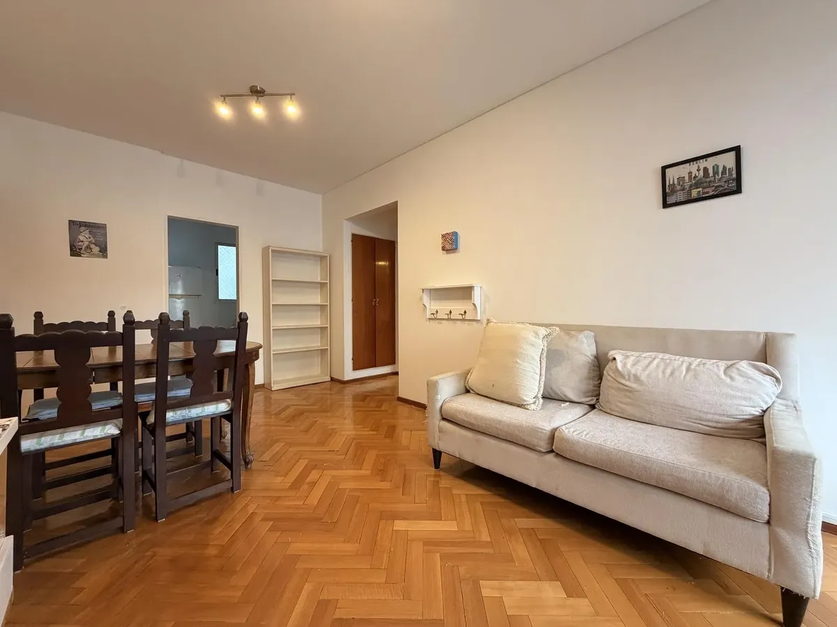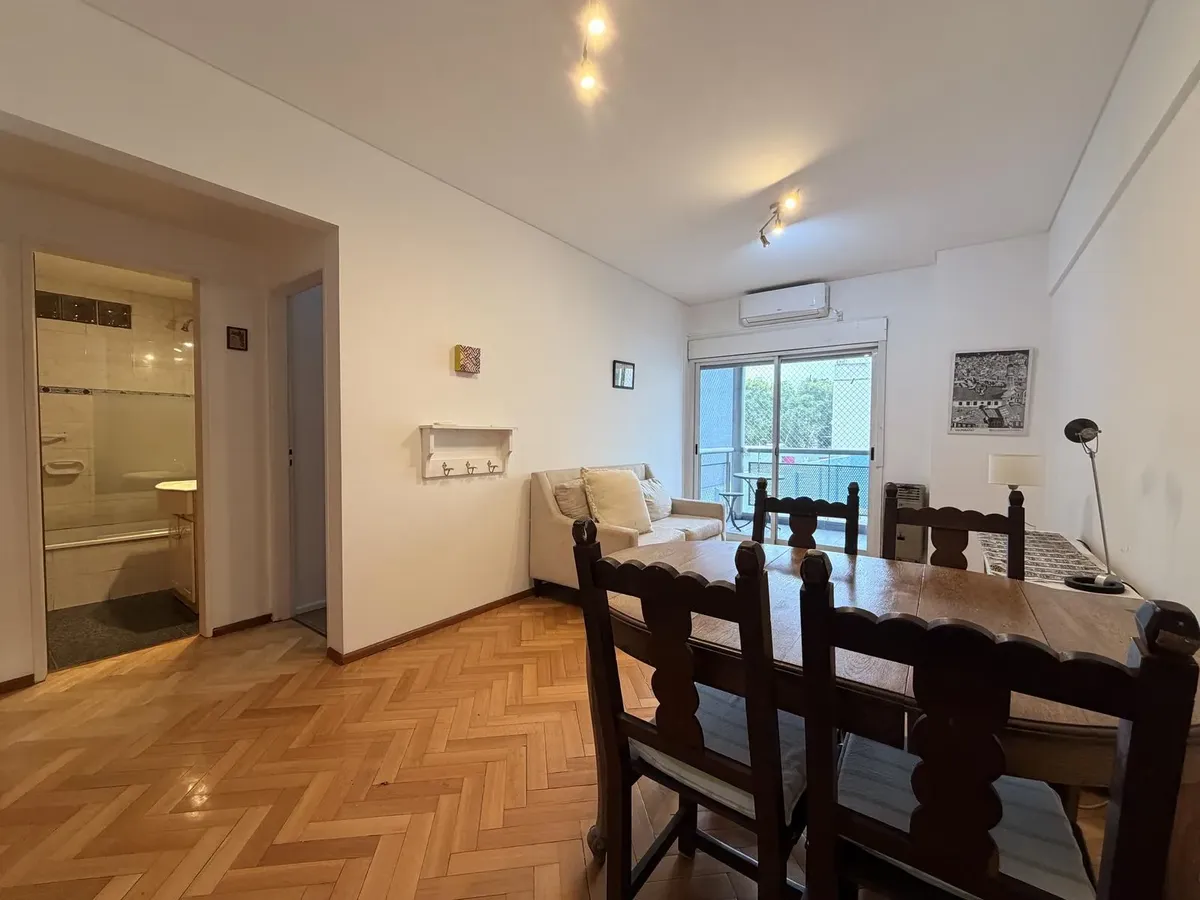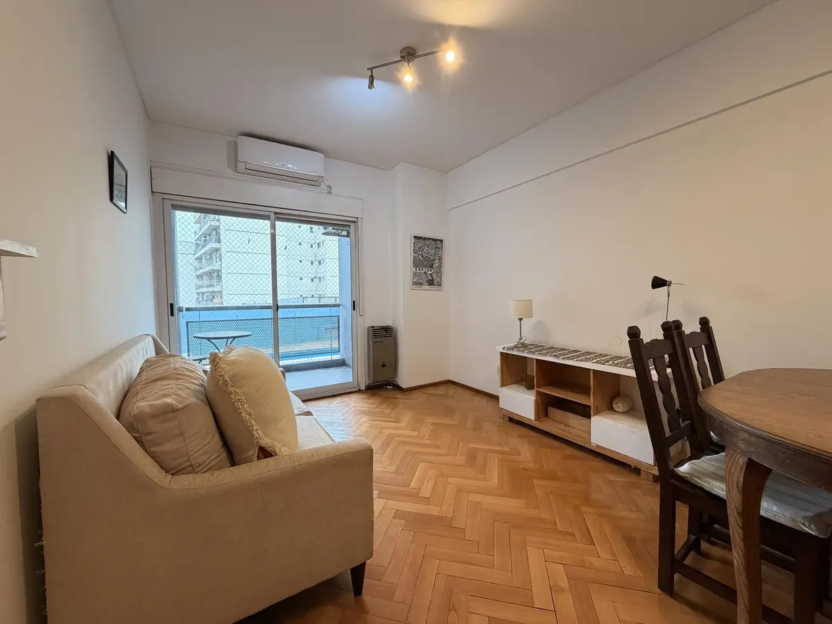 Квартира из 2 комнат площадью 3-й этаж, окна во двор (contrafrente), ориентация на восток, с балконом. Полностью меблирована, недавно покрашена; из окон вид на внутренний двор здания. В гостиной-столовой установлены кондиционер (холод/тепло) и отопление на tiro balanceado. Спальня с потолочным вентилятором и встроенным шкафом, двуспальная кровать и прикроватная тумба. В ванной комнате установлен душ, кухня оборудована холодильником, стиральной машиной и водонагревателем (calefón); отдельно указа
