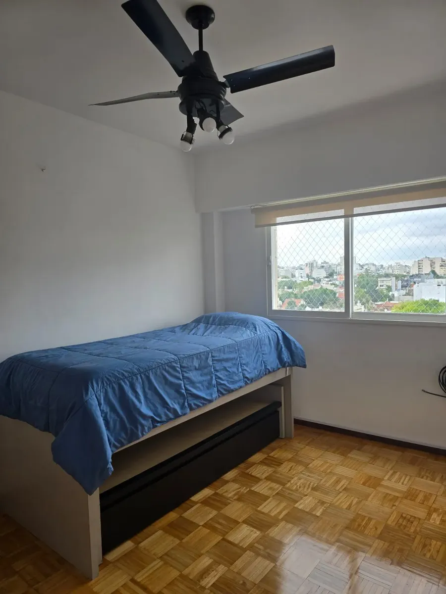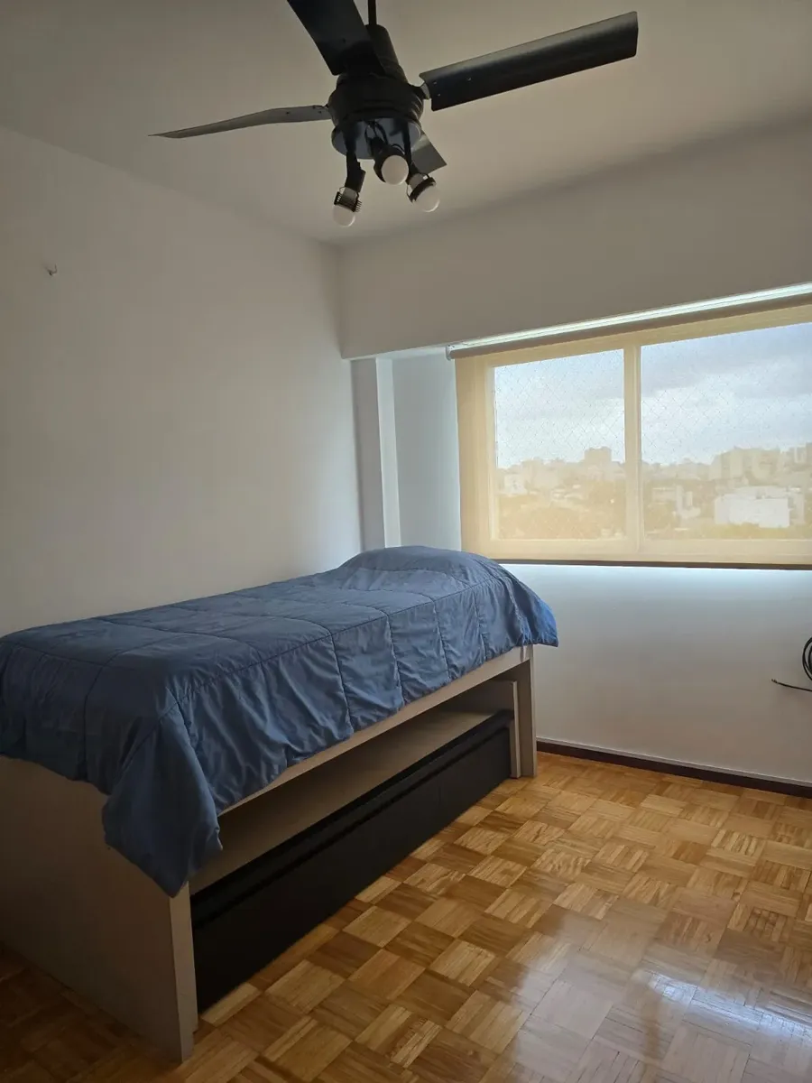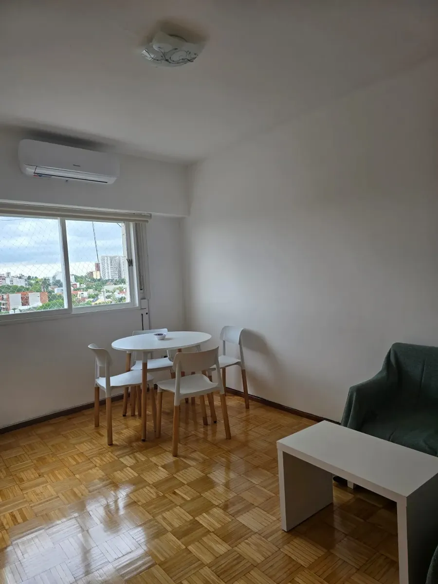 Квартира-«2 ambientes» площадью не указана, 8-й этаж, боковое расположение, с окнами на улицу. Полы с паркетом, окрашена, есть сплит-система. Квартира с мебелью для 1 человека. Кухня оборудована холодильником с морозильной камерой, есть бойлер. Ванная с душем. В спальне кровать-трансформер, в гостиной обеденный стол на 4 места, шторы и мебель.