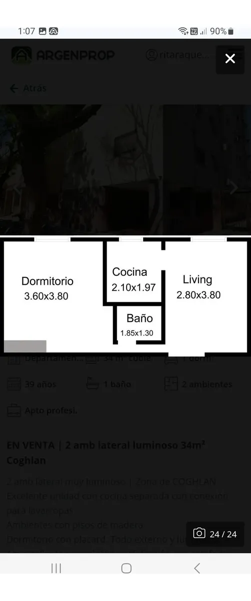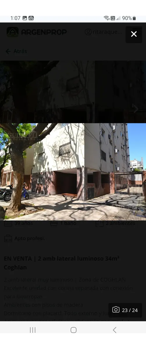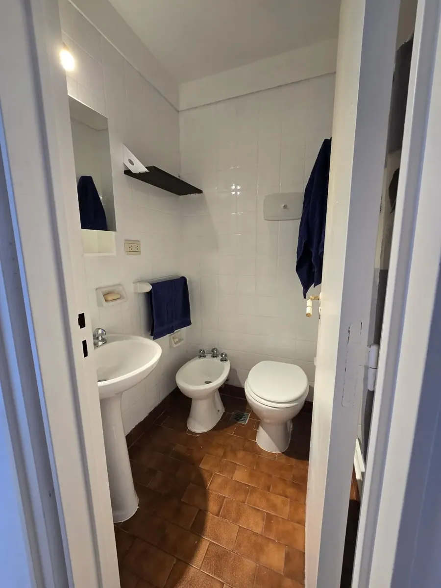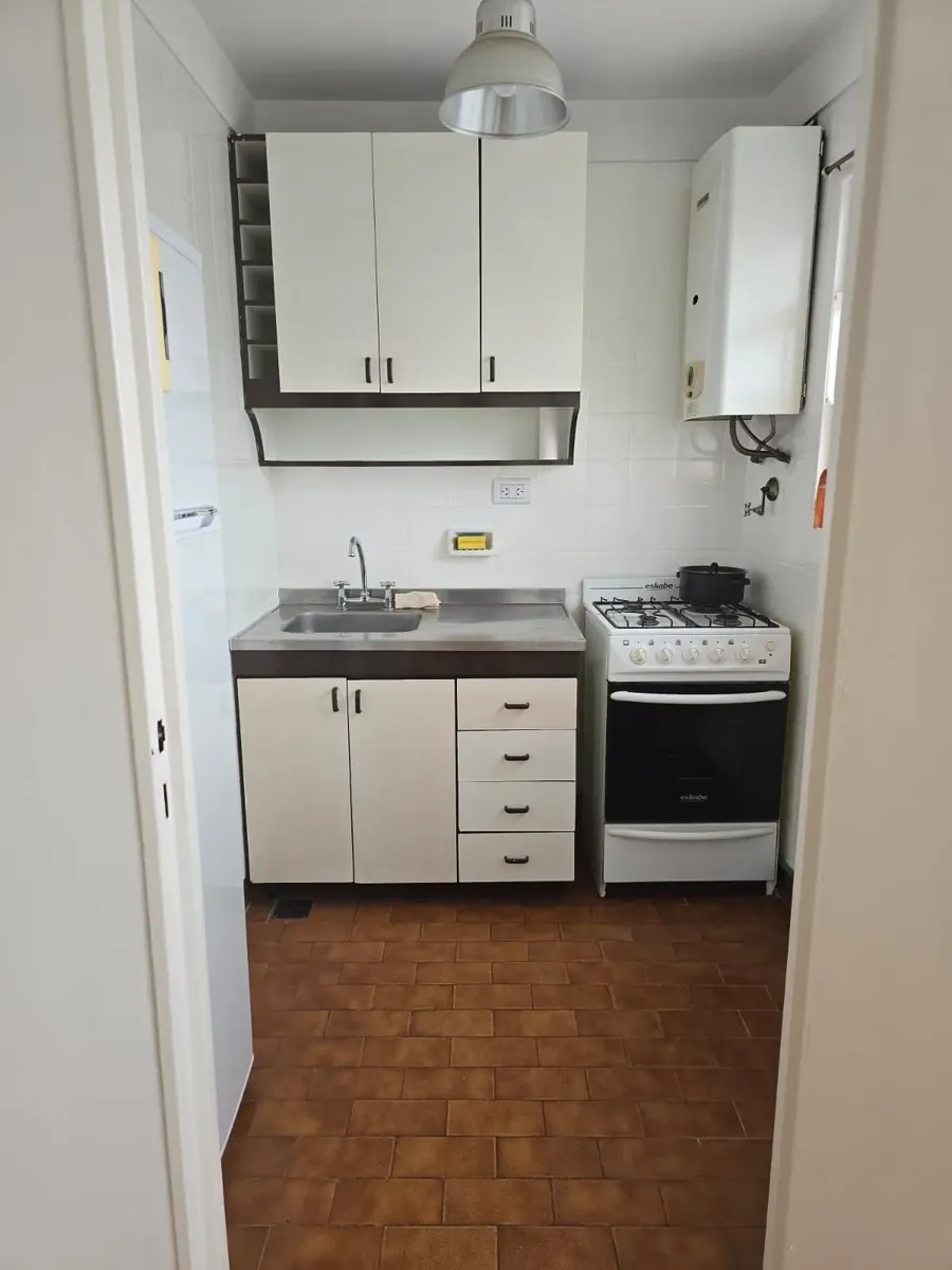 Квартира-«2 ambientes» площадью не указана, 8-й этаж, боковое расположение, с окнами на улицу. Полы с паркетом, окрашена, есть сплит-система. Квартира с мебелью для 1 человека. Кухня оборудована холодильником с морозильной камерой, есть бойлер. Ванная с душем. В спальне кровать-трансформер, в гостиной обеденный стол на 4 места, шторы и мебель.