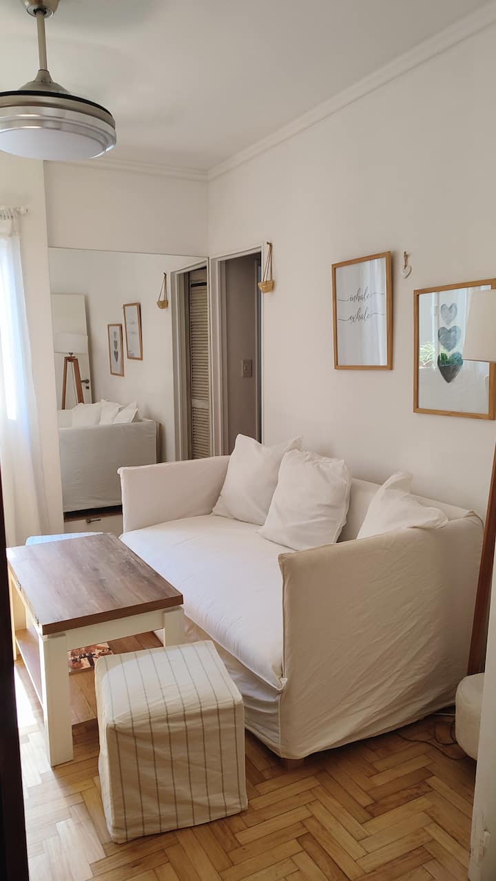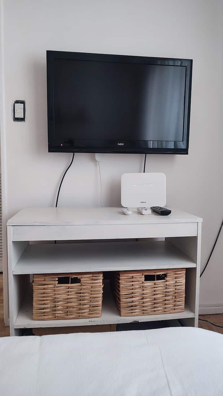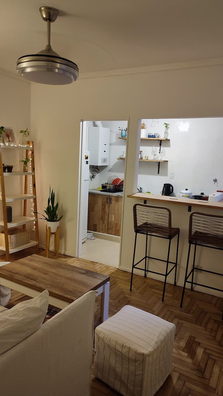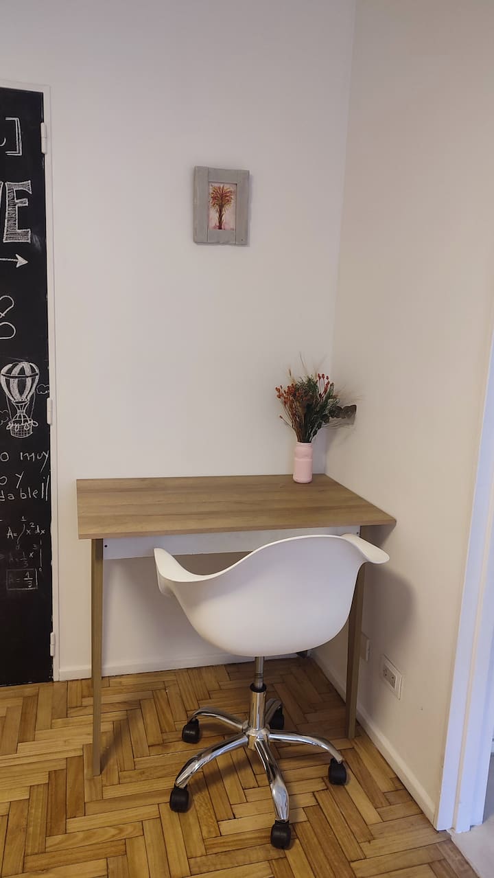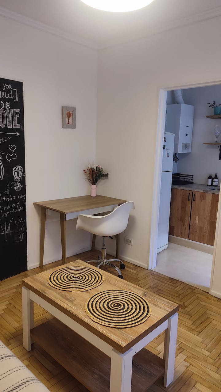 Квартира с двумя комнатами в Colegiales. В ней есть интегрированная кухня и спальня с двуспальной кроватью, где установлен телевизор. В прихожей предусмотрен шкаф для хранения, а также есть стул и письменный стол для работы.