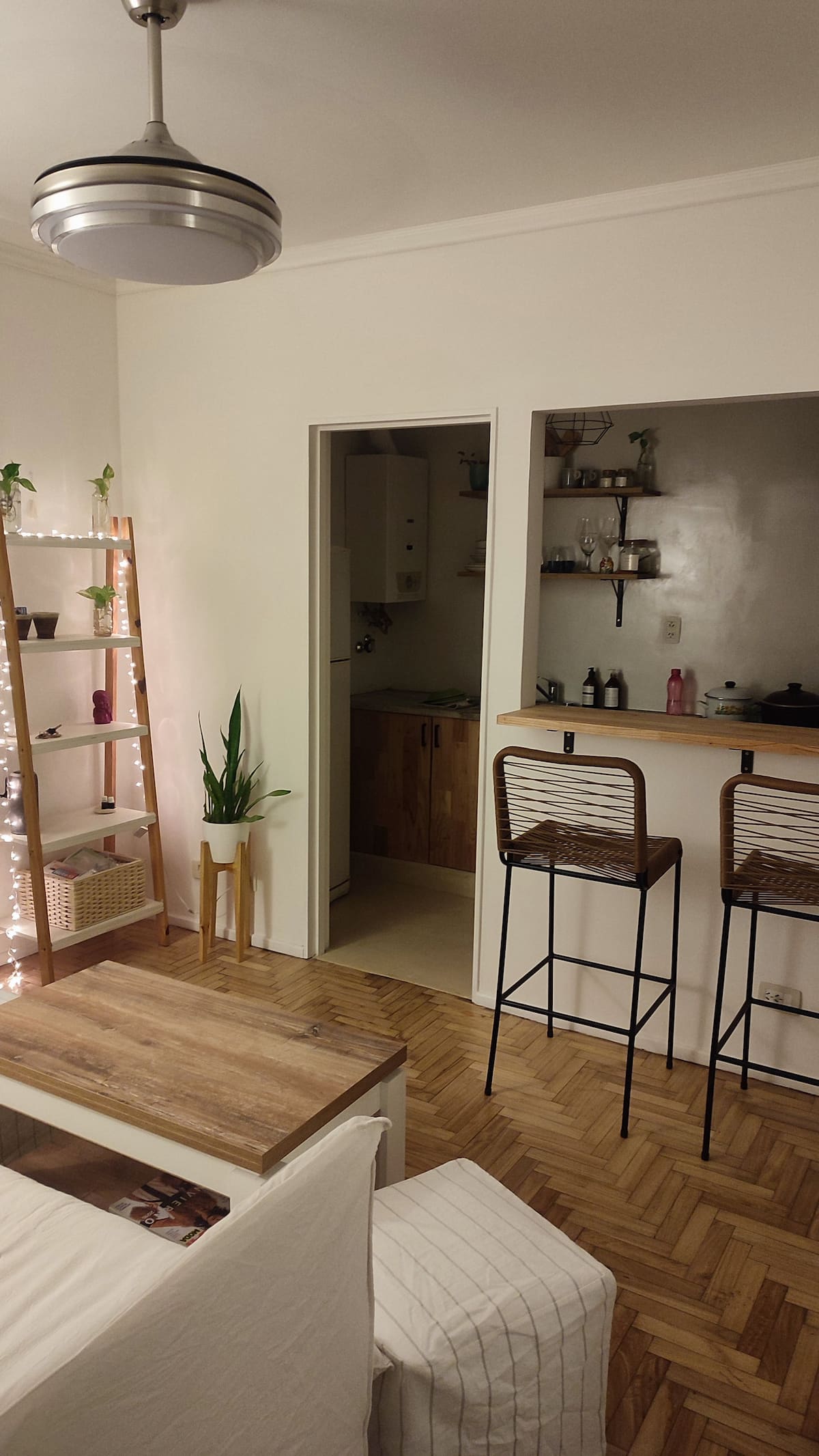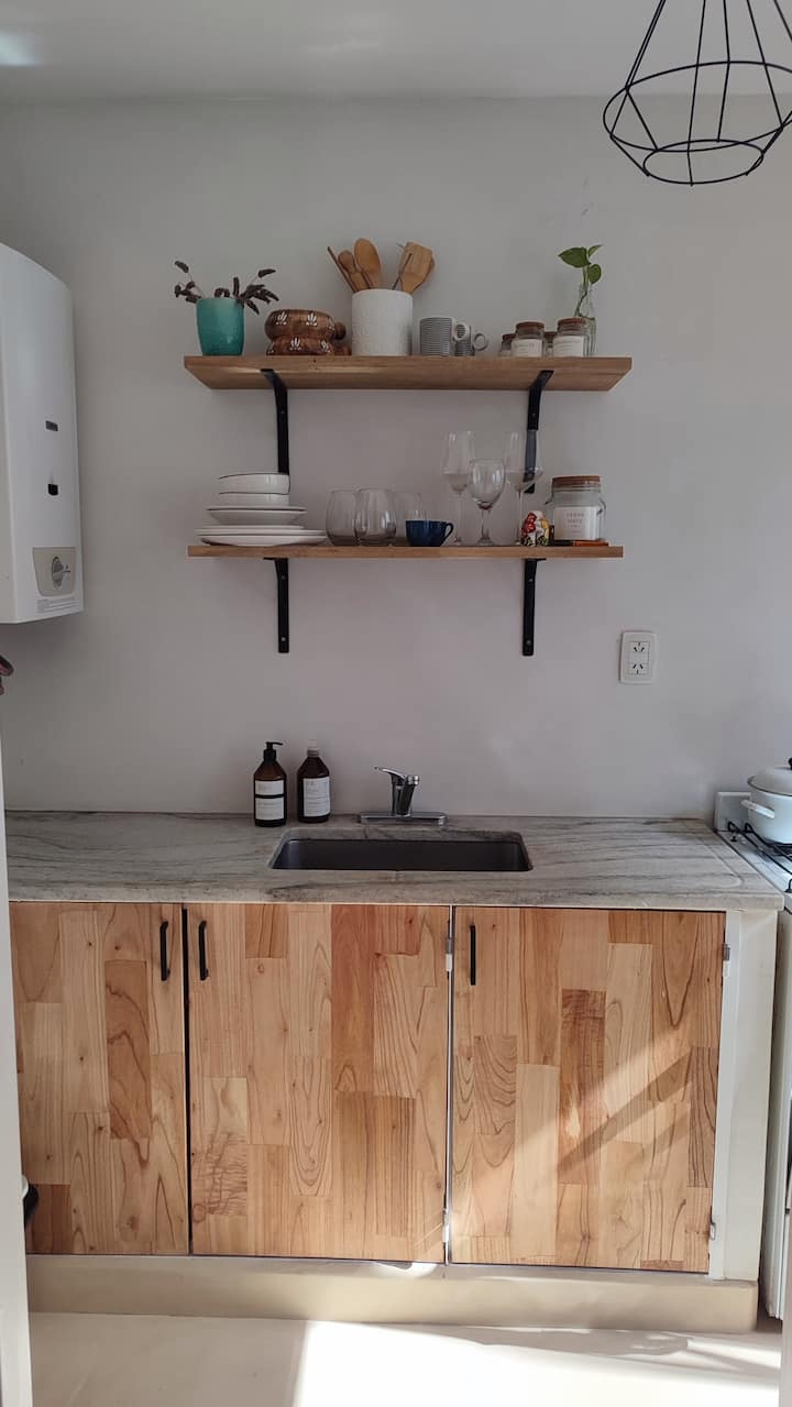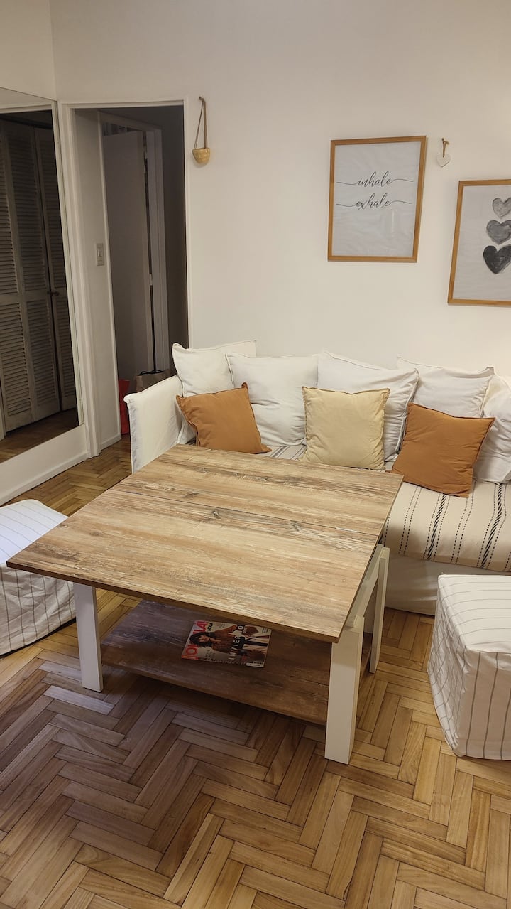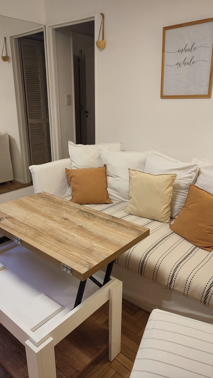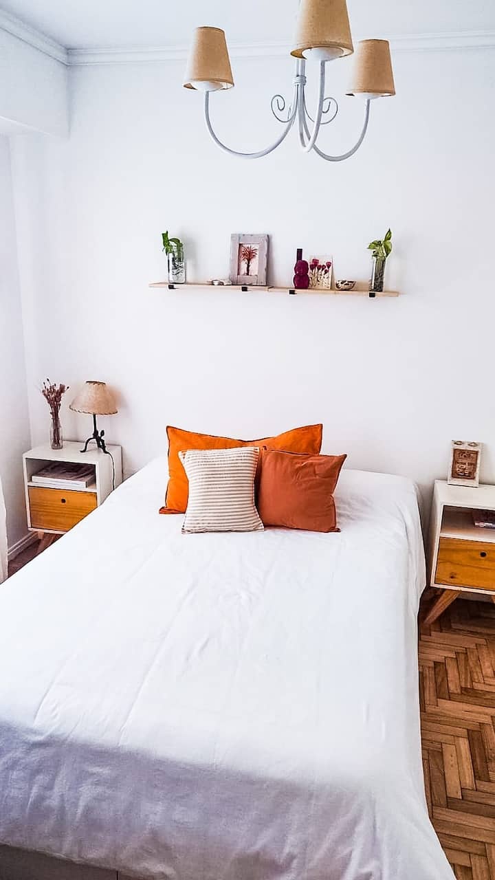Квартира с двумя комнатами в Colegiales. В ней есть интегрированная кухня и спальня с двуспальной кроватью, где установлен телевизор. В прихожей предусмотрен шкаф для хранения, а также есть стул и письменный стол для работы.