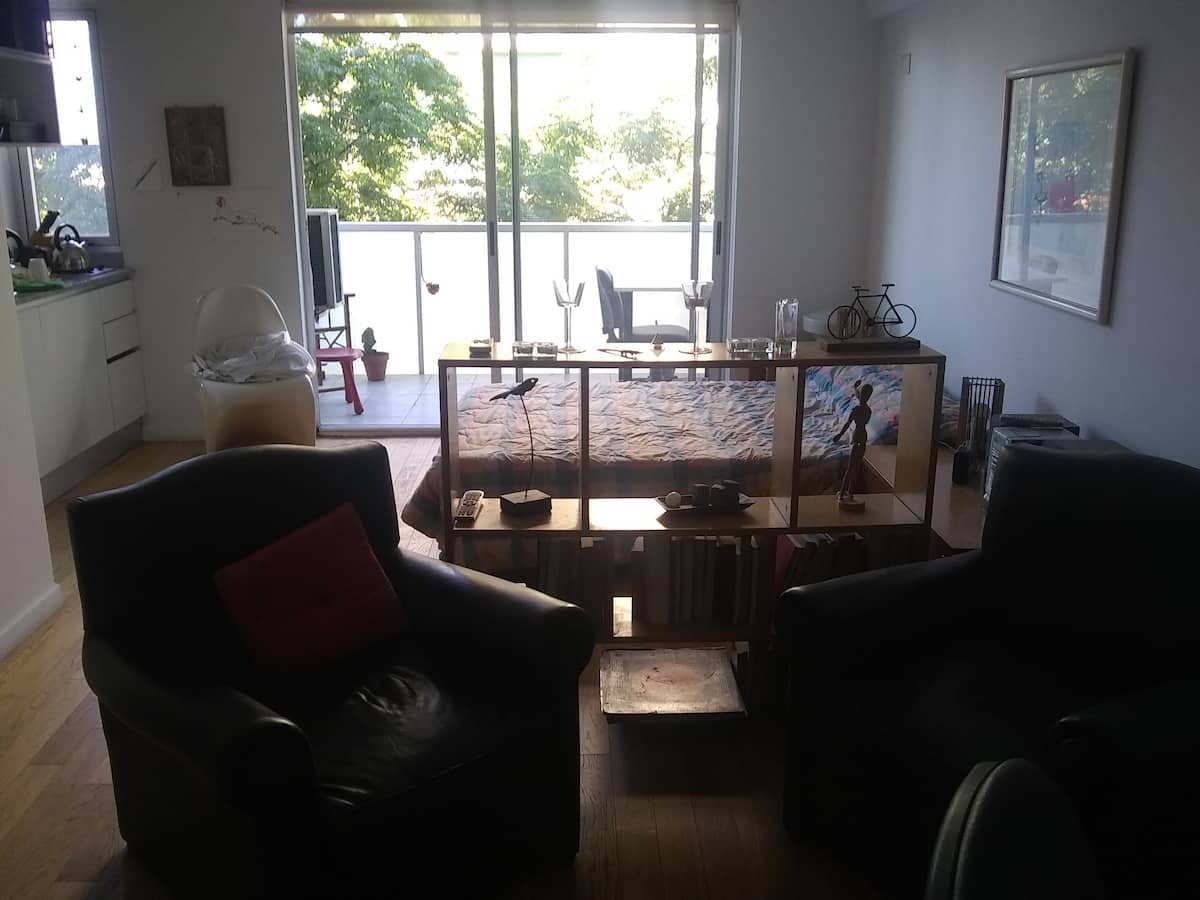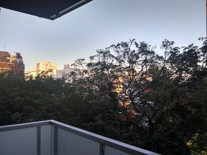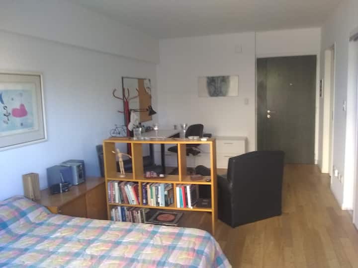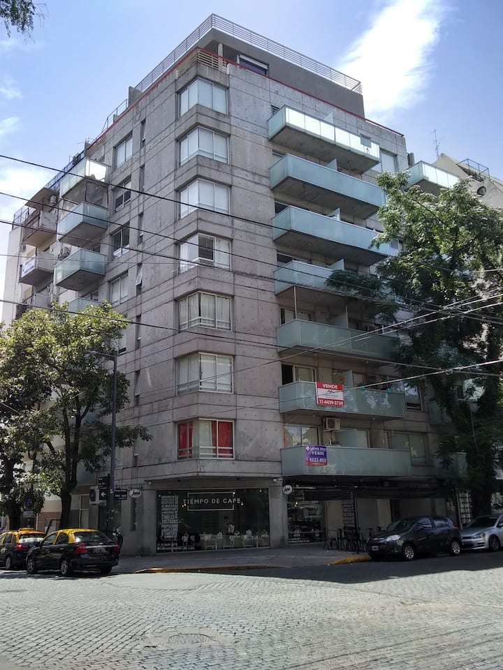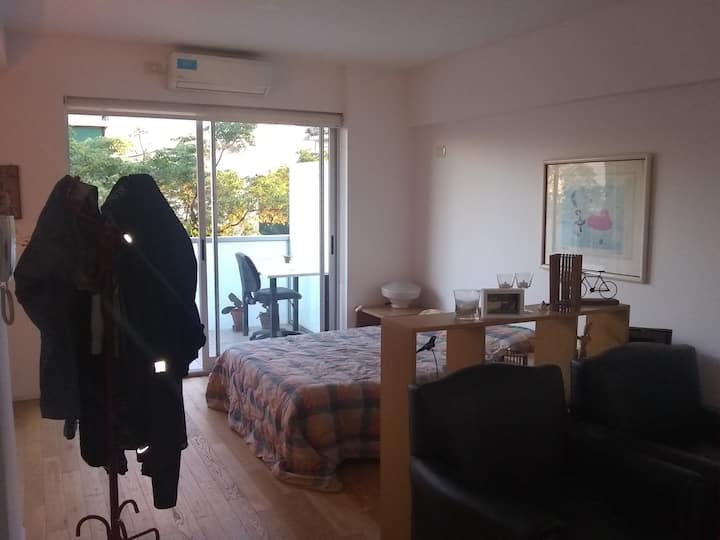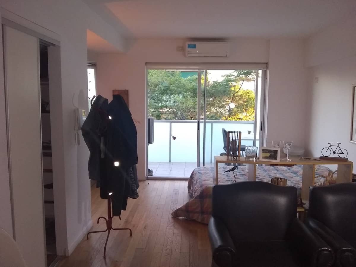 Квартира-студия, 1 комната, в Colegiales, с балконом и окнами на улицу. В здании категории Colegiales. Окрестности с магазинами в нескольких метрах, удобный доступ к общественному транспорту. В описании указано, что управление квартирой осуществляется соседом.