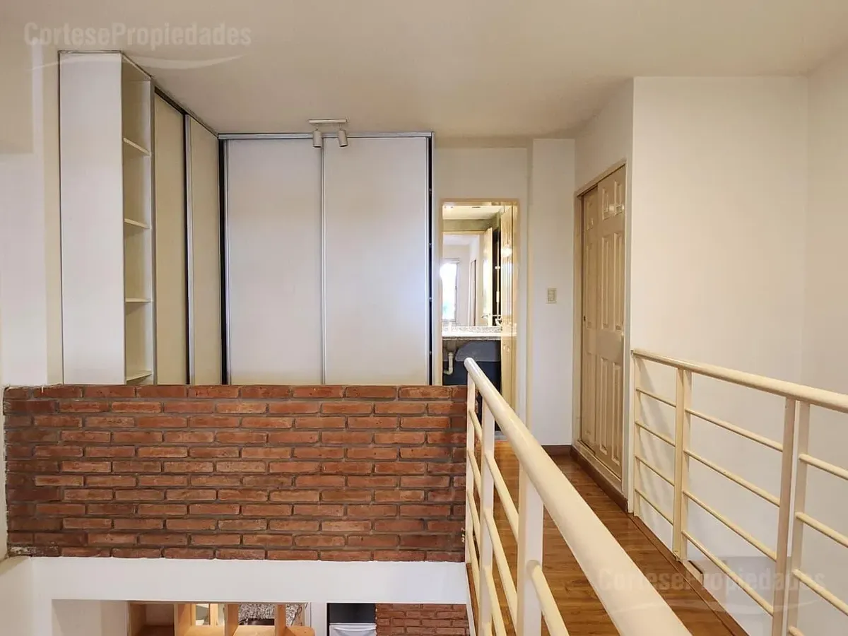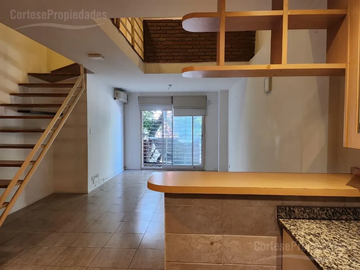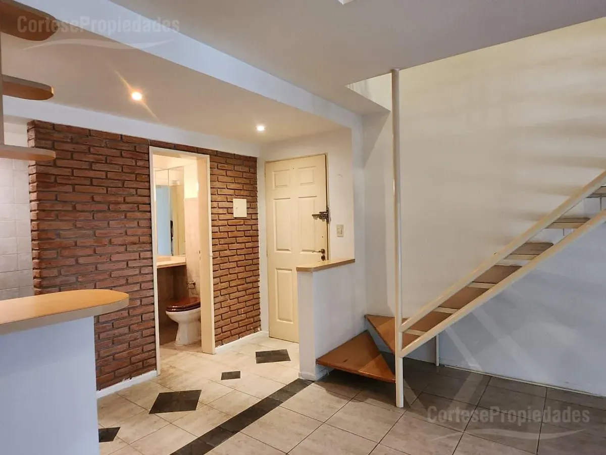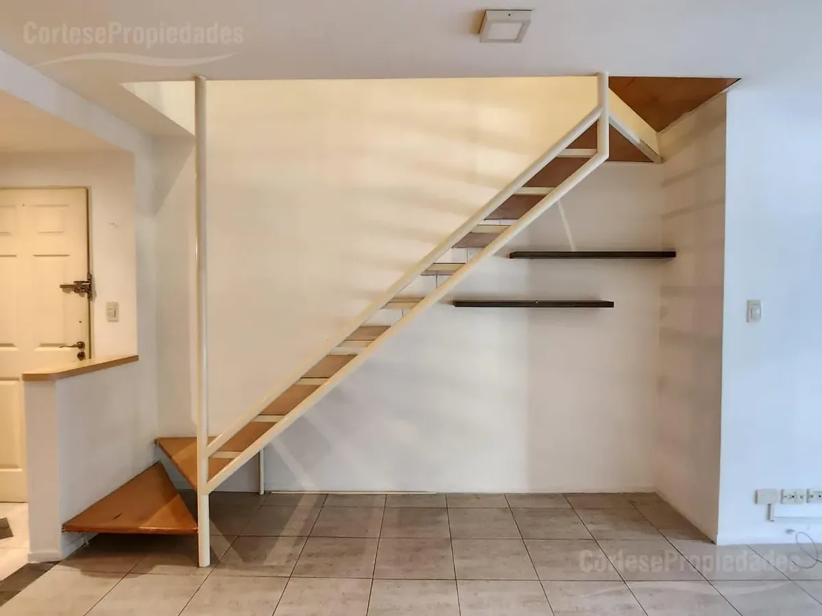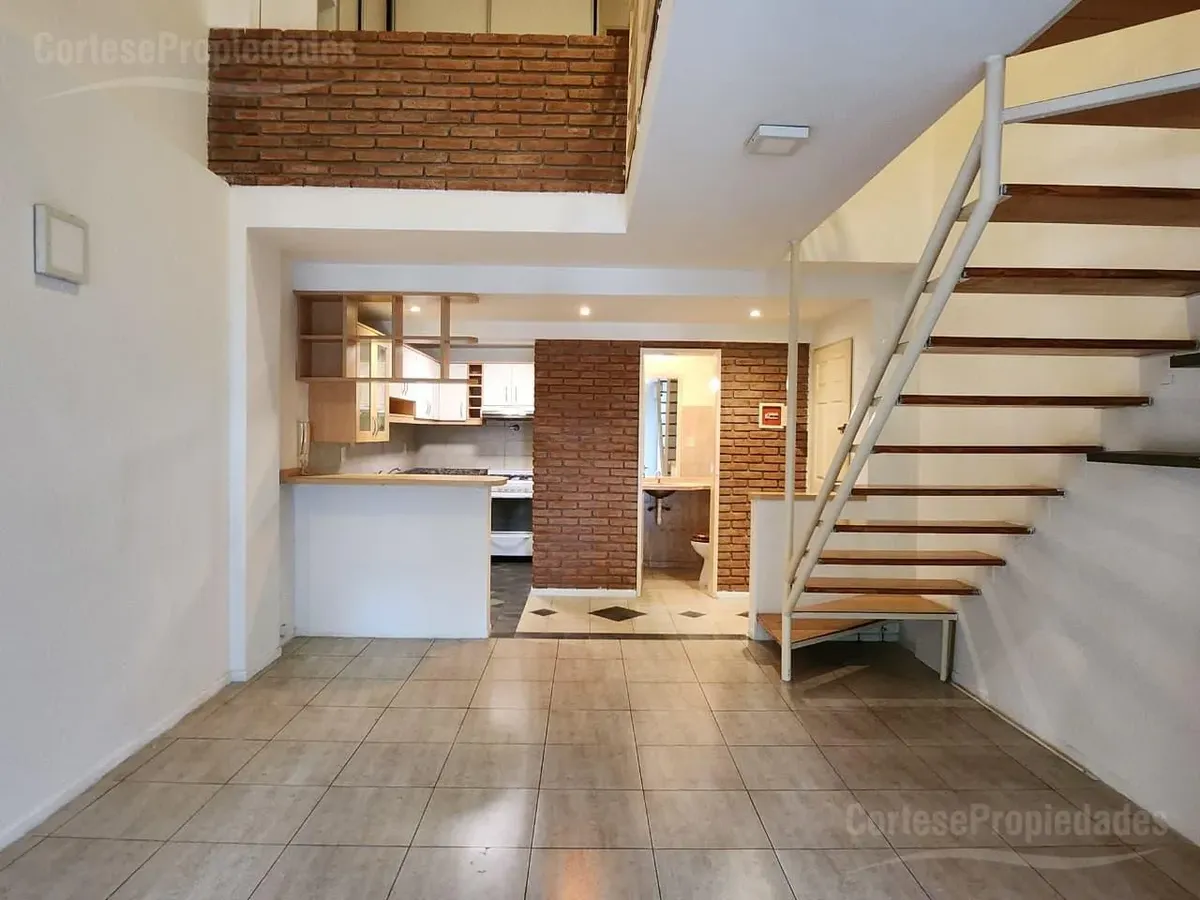 Двухуровневая квартира-дуплекс в Colegiales, 1 спальня, окна на улицу, с балконом, 1-й этаж. На первом уровне открытая кухня в гостиную-столовую с барной стойкой, зона постирочной внутри помещения, гостиную-столовую можно выйти на балкон, есть гостевой туалет. На втором уровне полная ванная, спальня с встроенным шкафом и кабинет с новым встроенным шкафом по всей высоте стен в форме буквы L. В квартире новая покраска, установлено освещение и рольставни roller screen и black out, на обоих уровнях