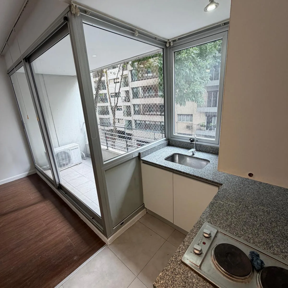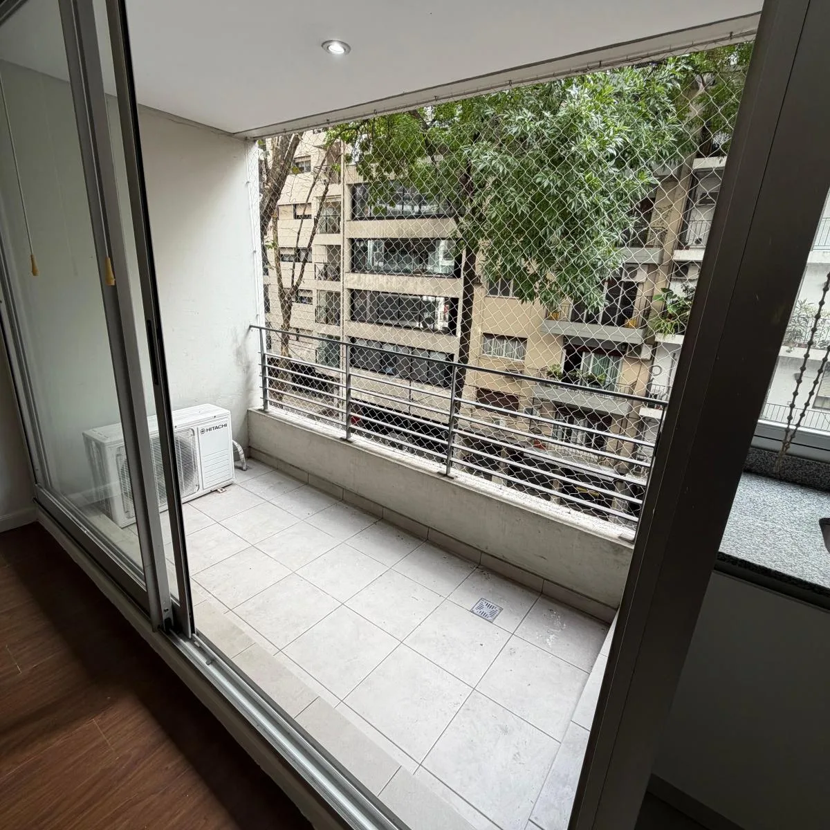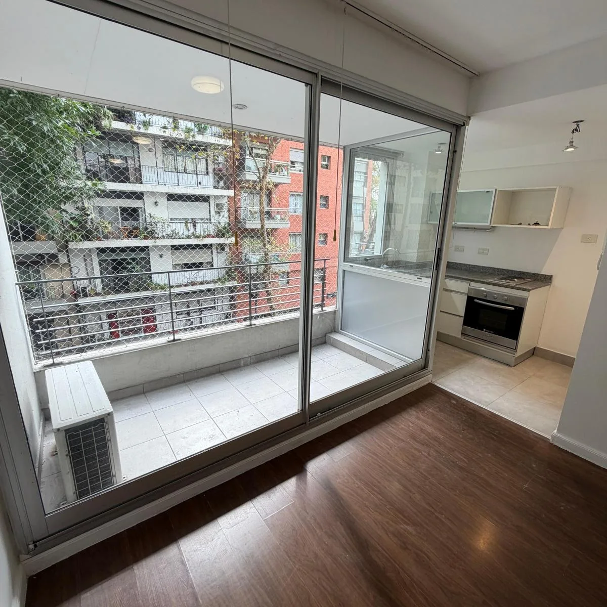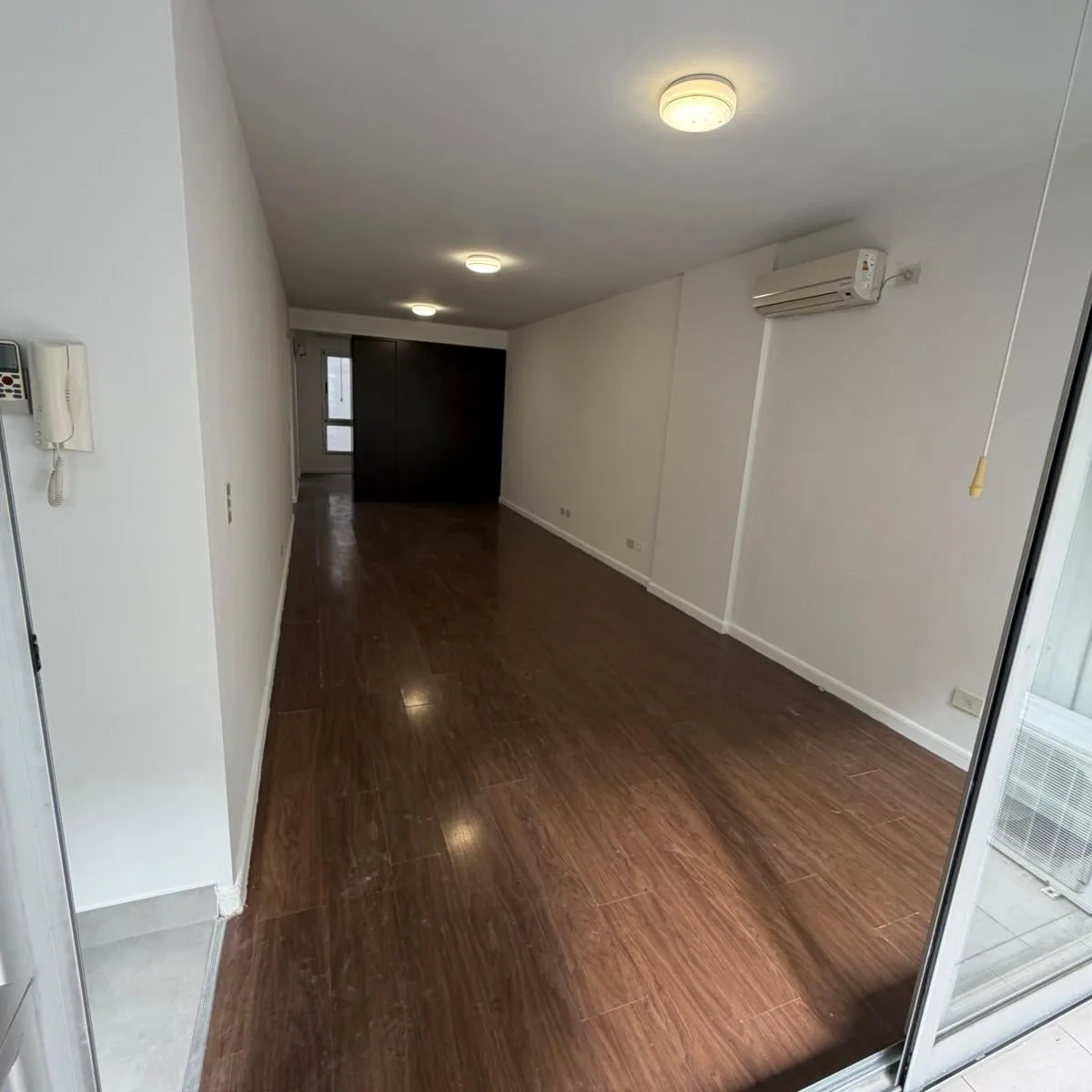 Квартира-студия площадью 46 m² в Colegiales, окна во двор, с балконом на лицевой стороне полукрытого типа 4 m². Комната разделена установленной перегородкой с мебелью. В квартире есть кухня, полноценная ванная и отдельный туалет. За охраной отвечает система с круглосуточным наблюдением и столбом Prosegur. Коммунальные платежи здания включают газ и воду.