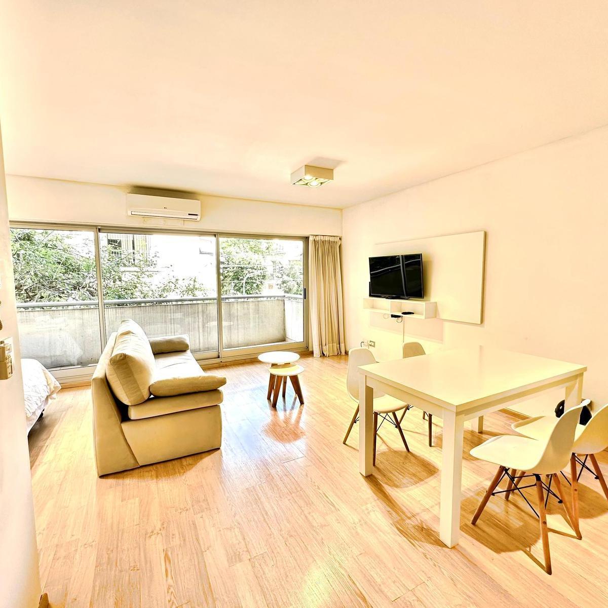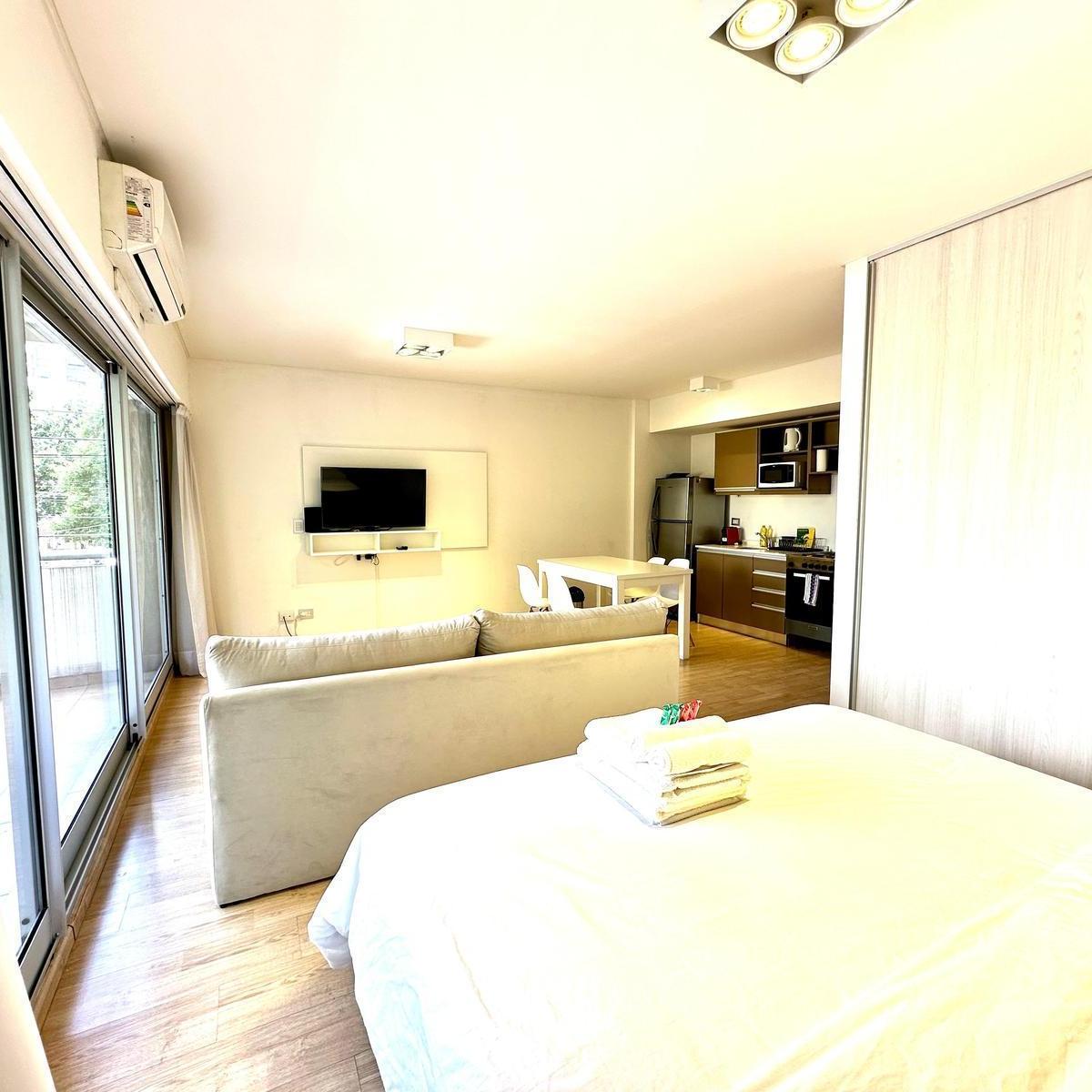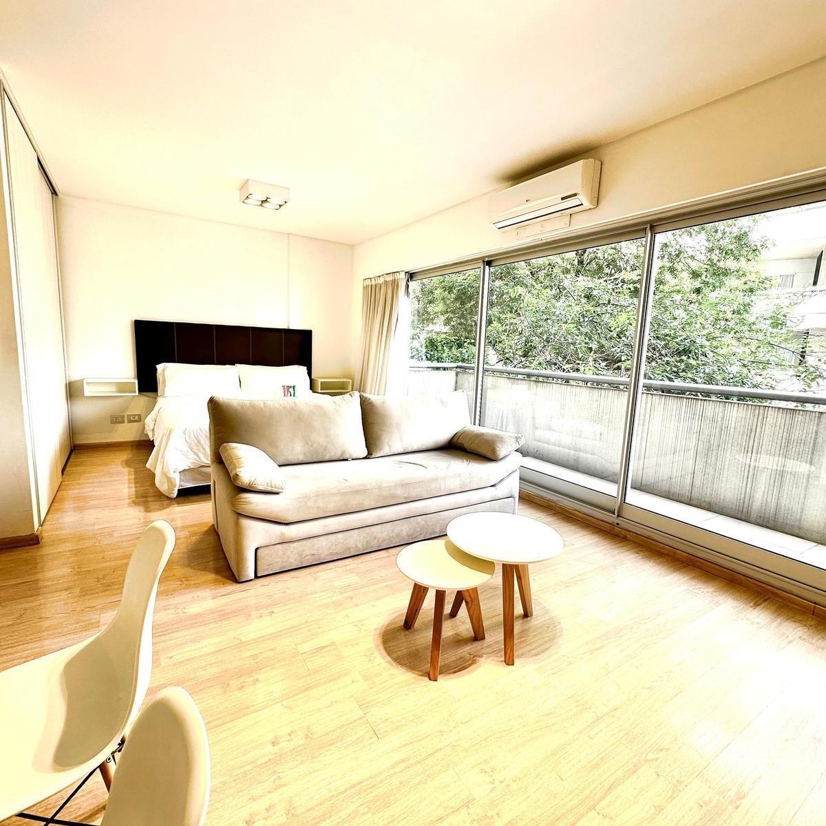 Квартира-студия в Colegiales с мебелью. Предусмотрен временный вариант аренды: стоимость меняется по периодам (август USD 850, июль USD 800, первая половина марта ARS 1.000). Квартира с окнами на улицу и балконом. Кухня оборудована, есть кондиционер холод/тепло. Указаны laundry и gym. В объявлении отмечено, что аренда предполагает оплату плюс коммунальные платежи здания.