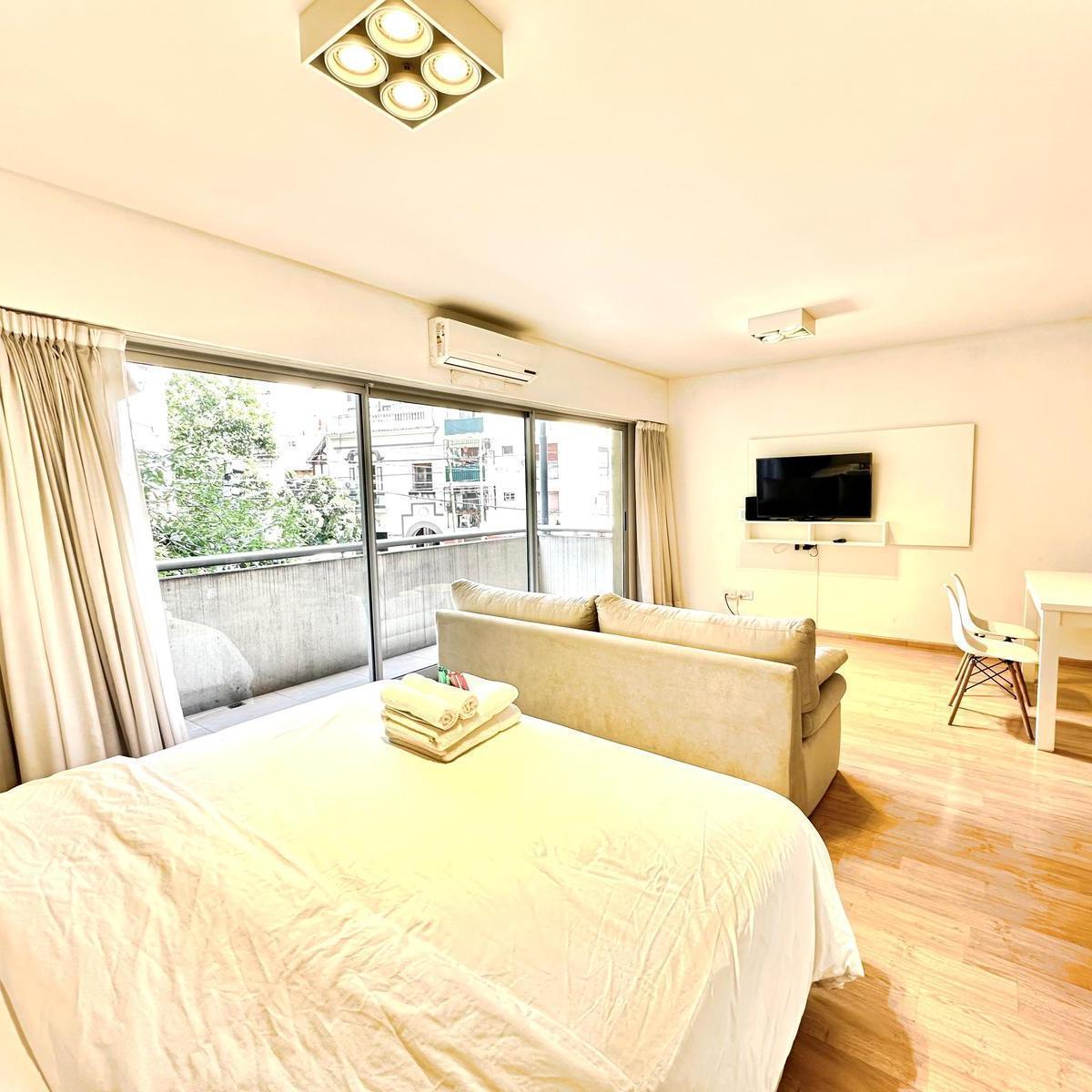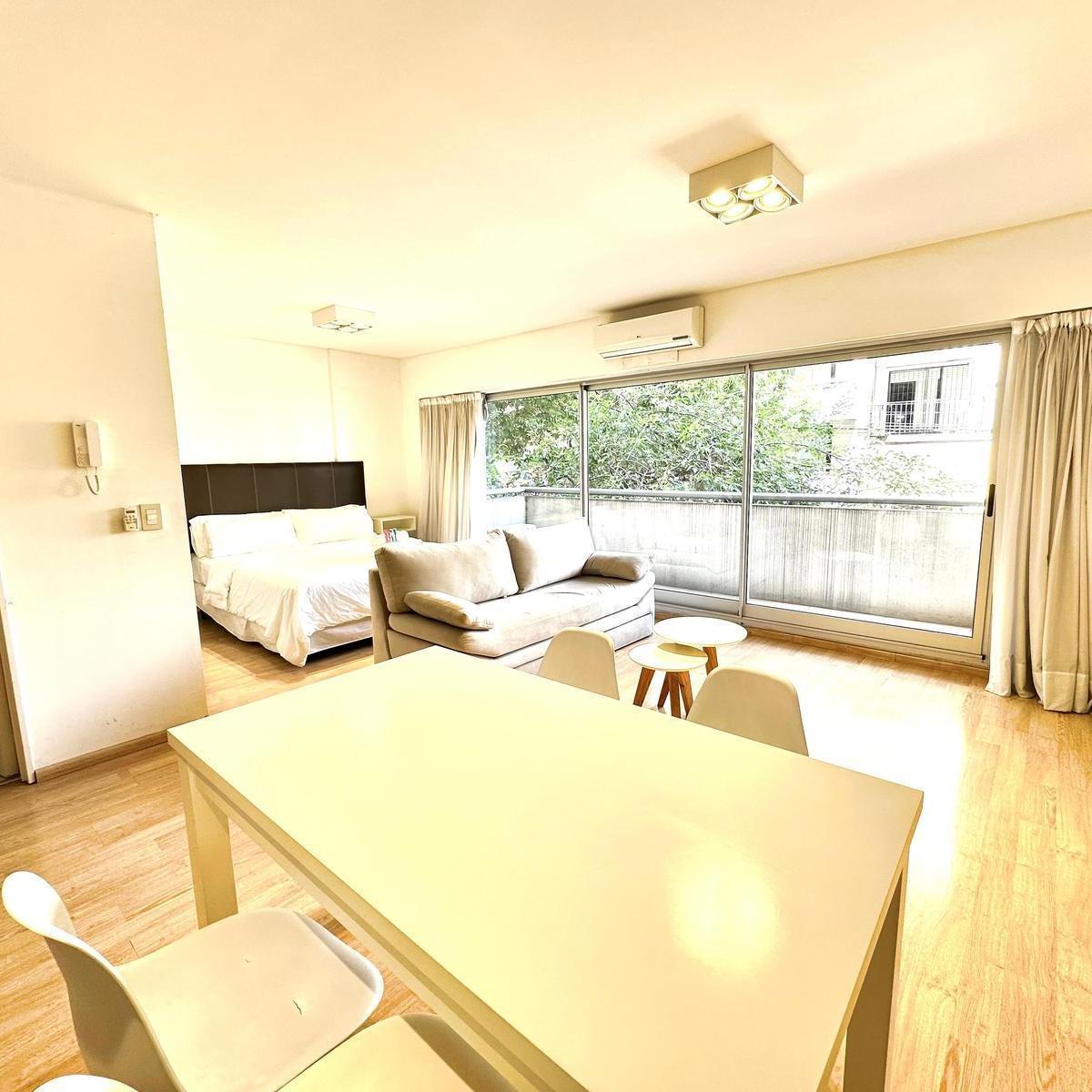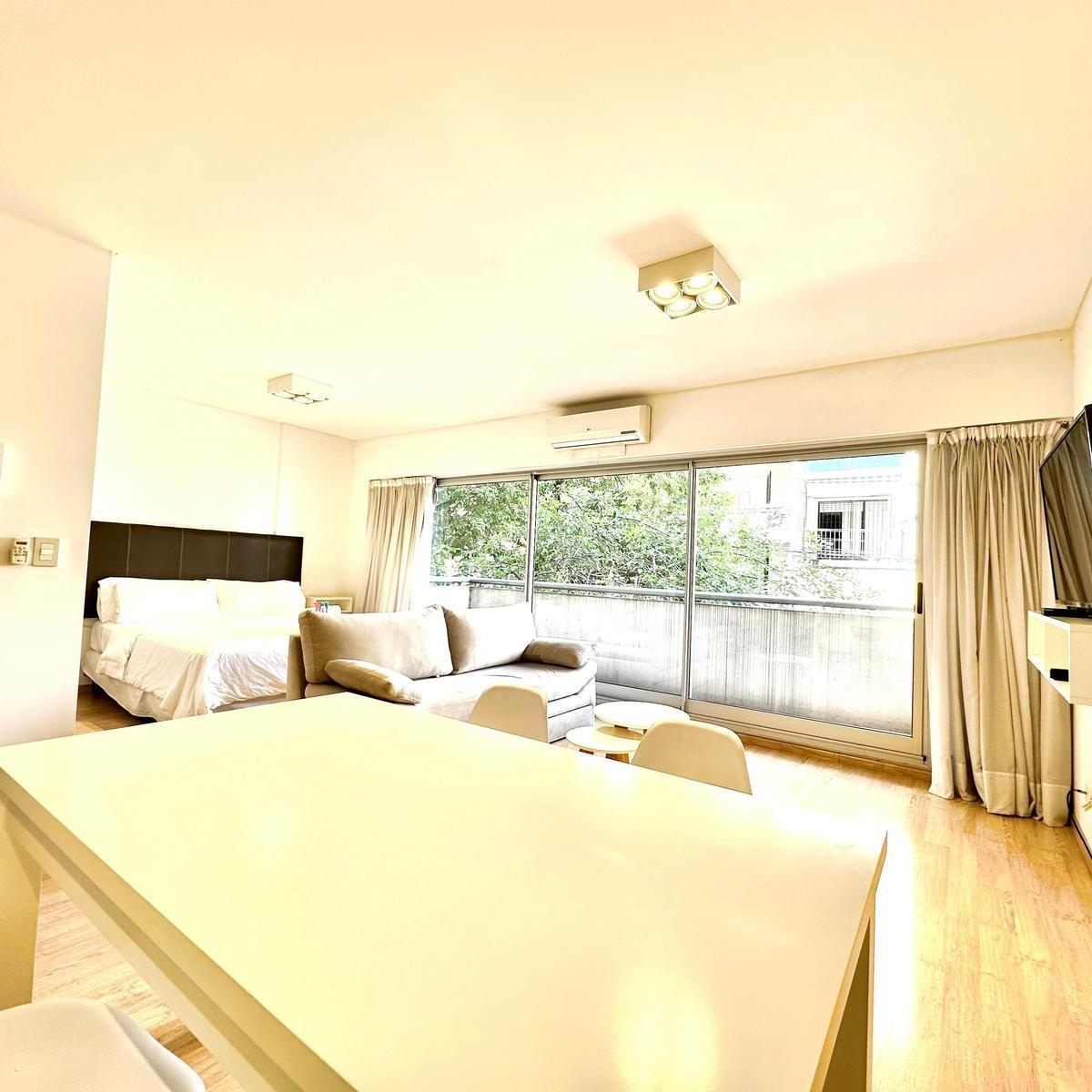 Квартира-студия в Colegiales с мебелью. Предусмотрен временный вариант аренды: стоимость меняется по периодам (август USD 850, июль USD 800, первая половина марта ARS 1.000). Квартира с окнами на улицу и балконом. Кухня оборудована, есть кондиционер холод/тепло. Указаны laundry и gym. В объявлении отмечено, что аренда предполагает оплату плюс коммунальные платежи здания.