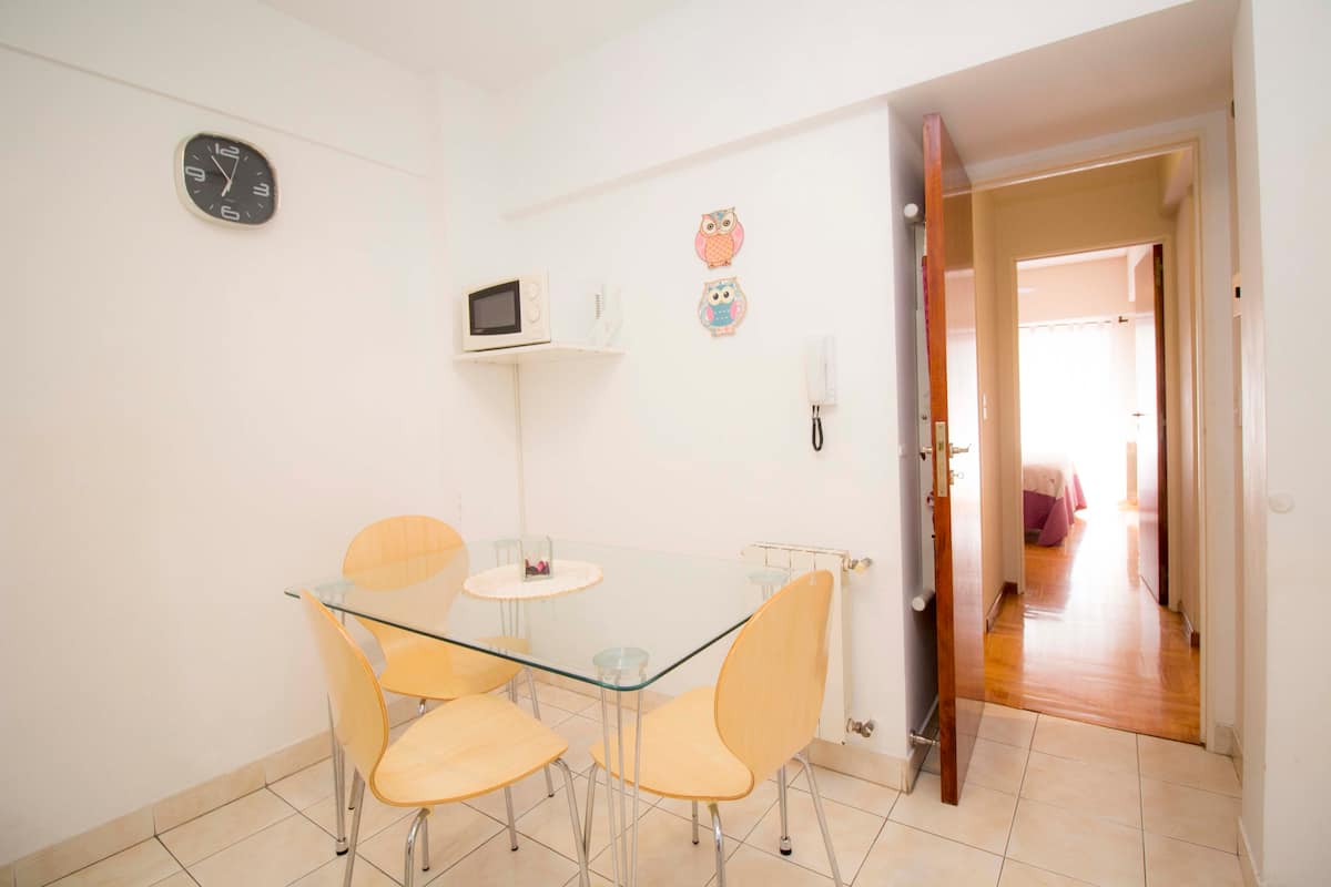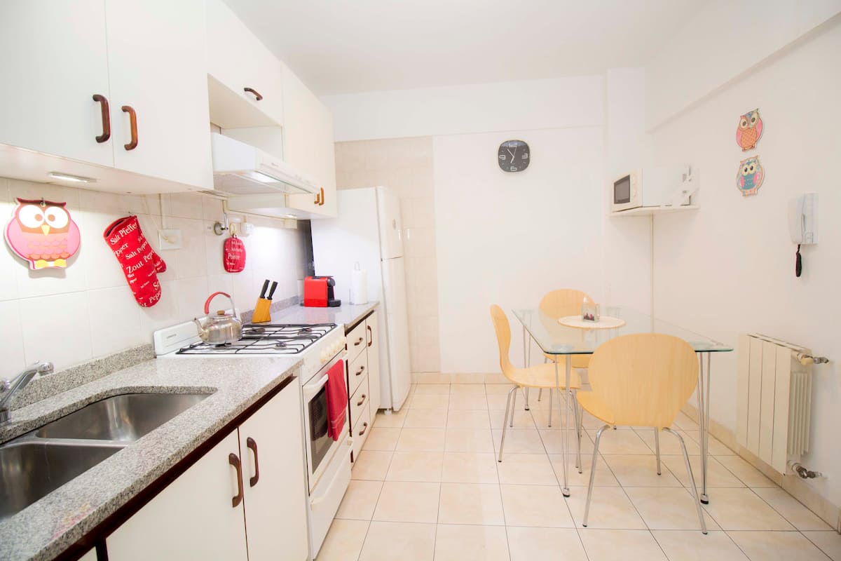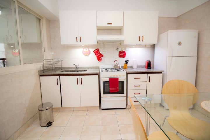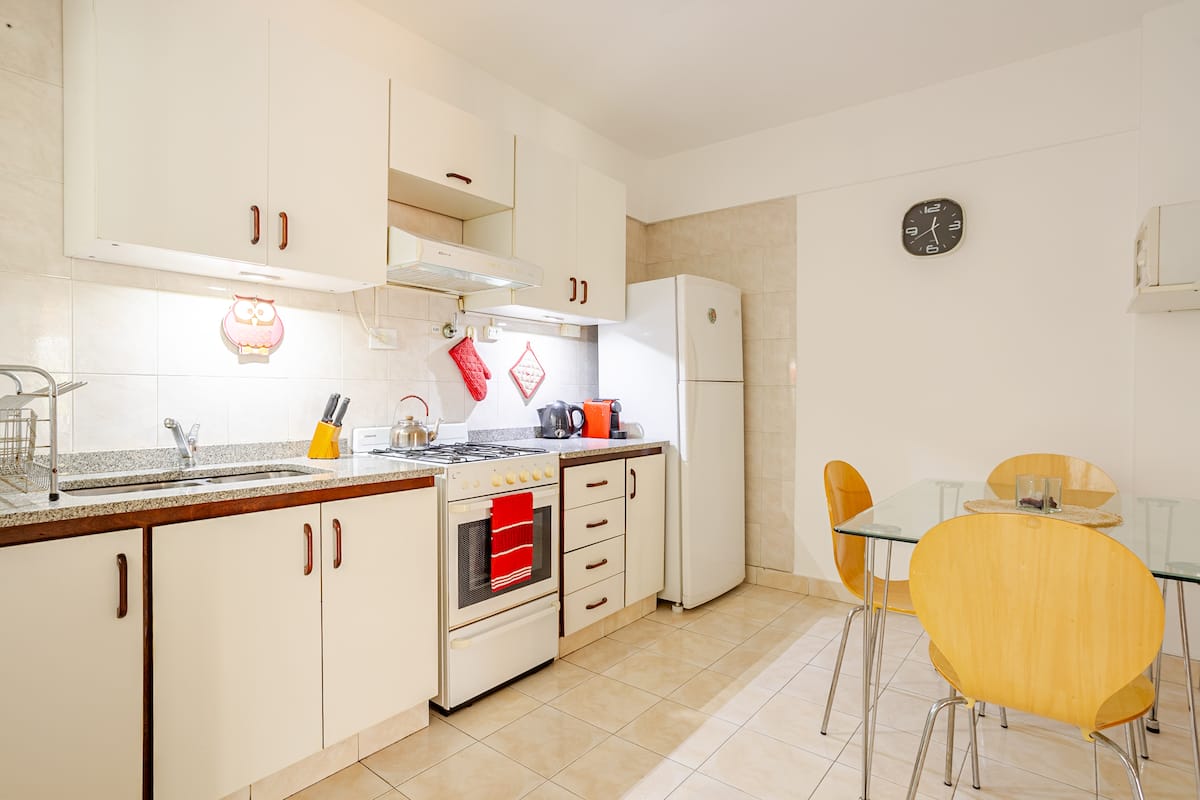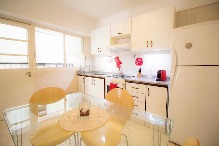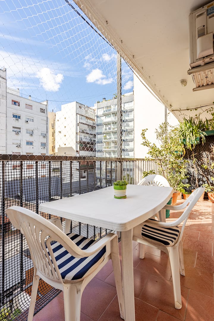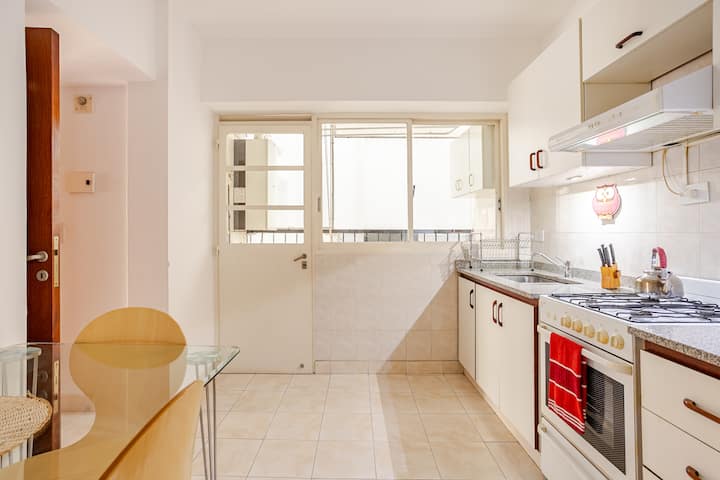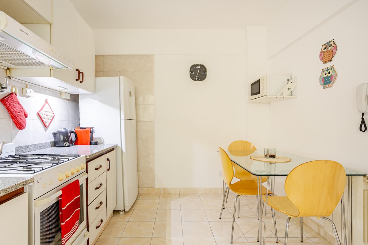 Квартира с 1 спальней площадью 60 m² в Colegiales. Кровать queen size, кухня полностью оборудована, есть стиральная машина и большая гостиная-столовая. Большой балкон с зеленью и столом для еды. В числе оборудования телевизор HD 40" LED, доступ в интернет и Wi‑Fi, кофемашина, тостер, микроволновая печь, духовка, холодильник и мультифункциональный кухонный прибор, а также утюг; предусмотрен манеж для ребёнка без дополнительной платы. Отопление регулируется термостатом по расписанию; предоставляет