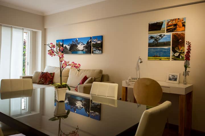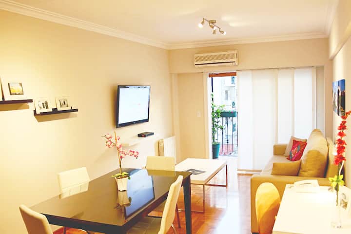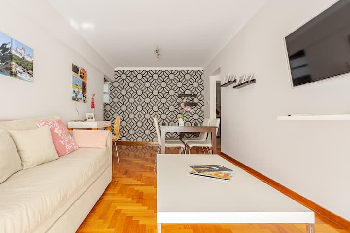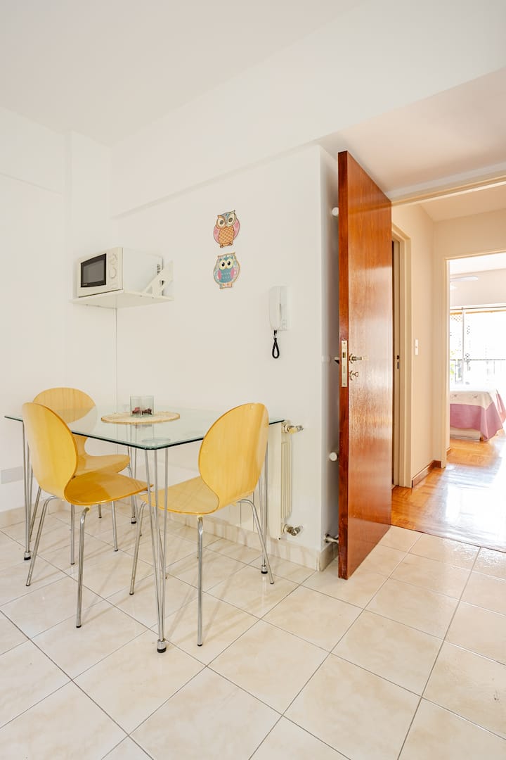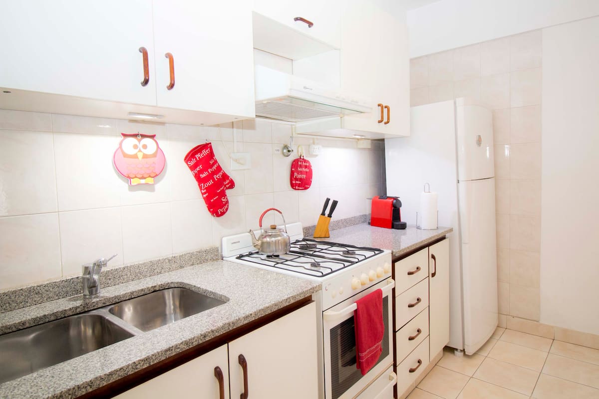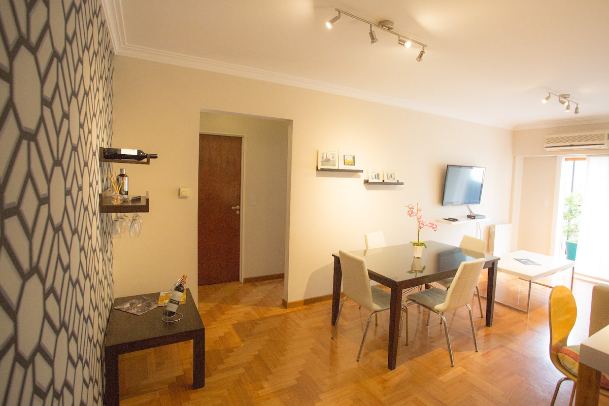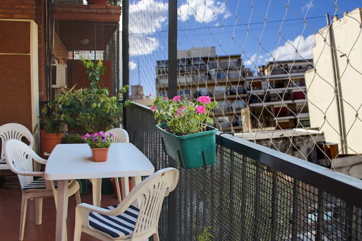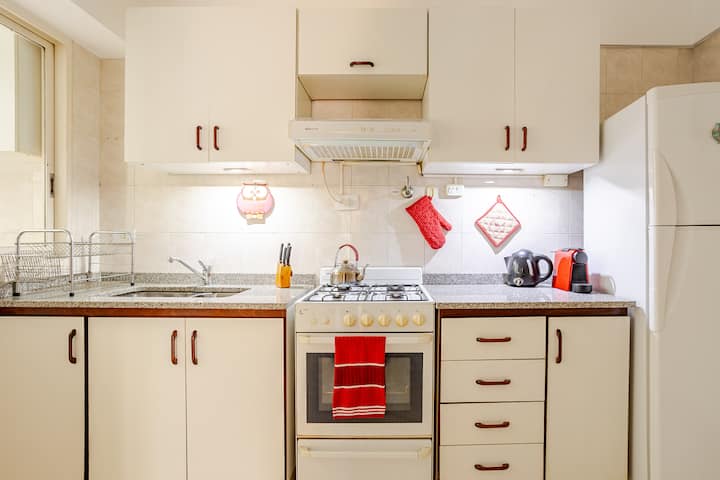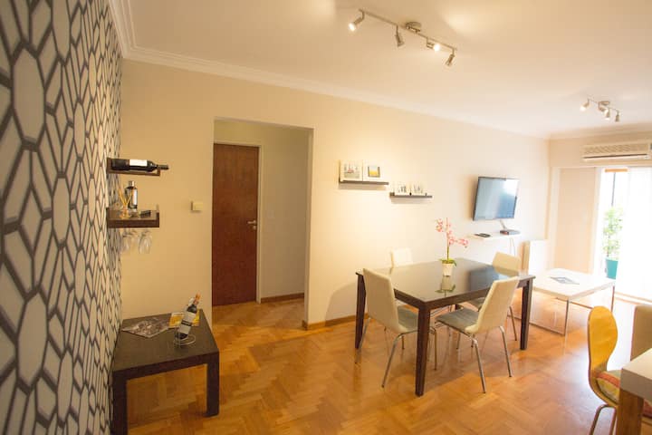 Квартира с 1 спальней площадью 60 m² в Colegiales. Кровать queen size, кухня полностью оборудована, есть стиральная машина и большая гостиная-столовая. Большой балкон с зеленью и столом для еды. В числе оборудования телевизор HD 40" LED, доступ в интернет и Wi‑Fi, кофемашина, тостер, микроволновая печь, духовка, холодильник и мультифункциональный кухонный прибор, а также утюг; предусмотрен манеж для ребёнка без дополнительной платы. Отопление регулируется термостатом по расписанию; предоставляет