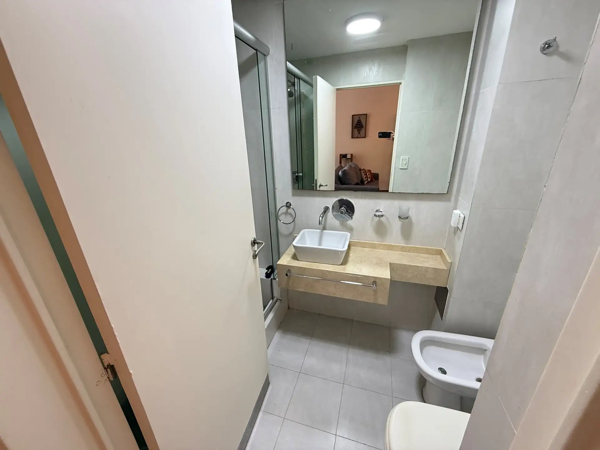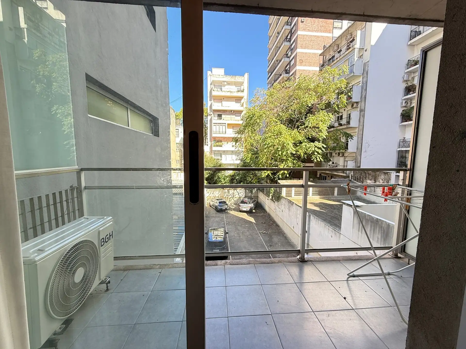 Квартира-студия площадью 35 m² в Colegiales, с балконом со стороны внутреннего двора (con contrafrente) и окнами на запад. С мебелью и бытовой техникой, с кондиционером split (холод/тепло) BGH. Кухня с варочной панелью и электрической духовкой DOMEC, установлен шкаф, отдельная ванная с душевой перегородкой. Горячая вода от электрического термотанкa. В здании есть общая гостиная для жильцов (SUM) и тренажёрный зал. Объявление указывает наличие (закреплённого) парковочного места открытого типа и б