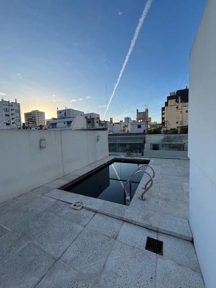 Квартира в Colegiales. В описании указаны собственный бассейн в здании и прачечная. Сообщается о транспортной доступности на метро, автобусах и поезде, а также о близости к Barrio Chino.
