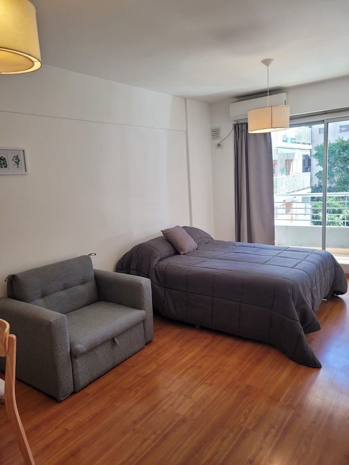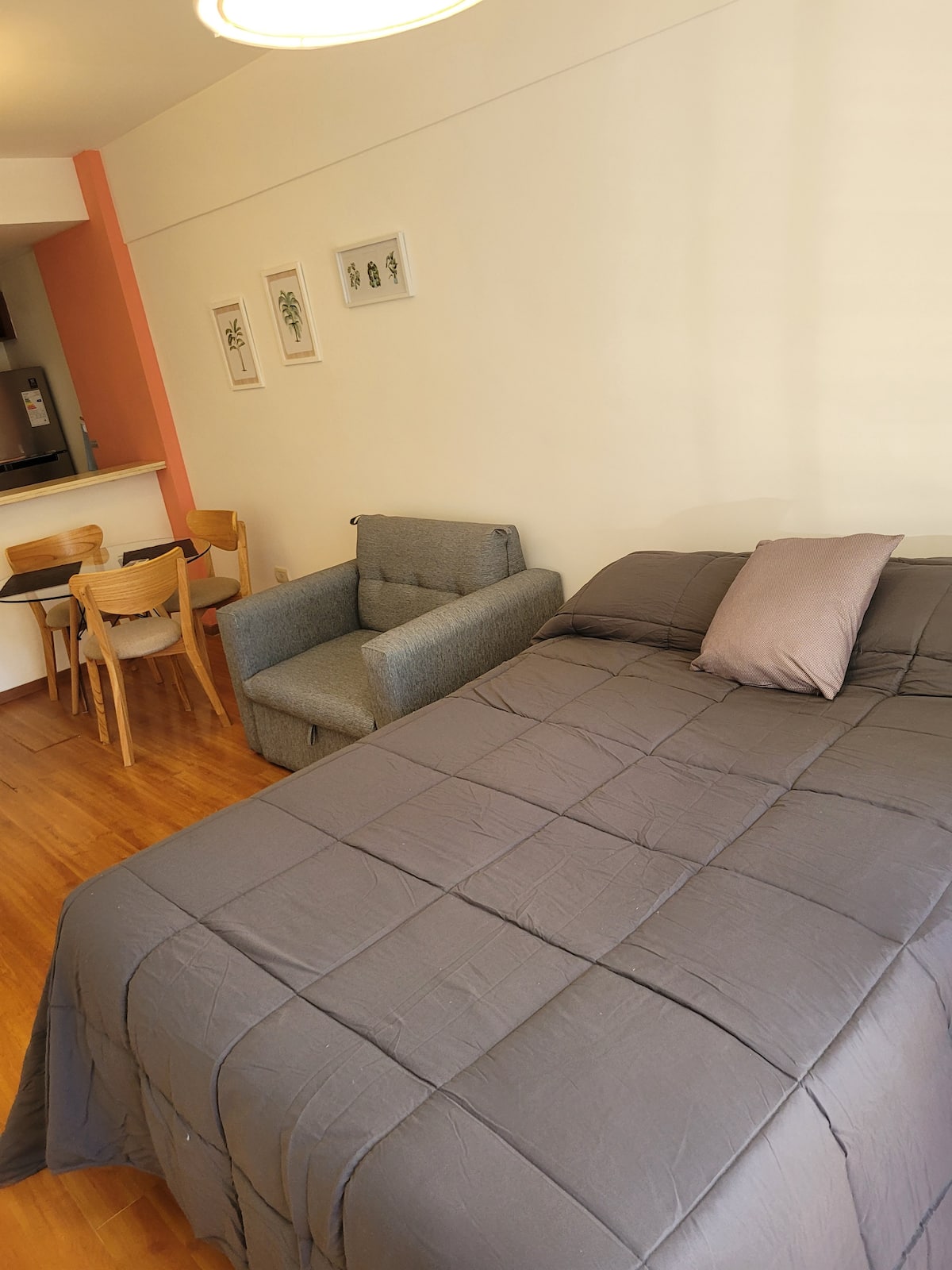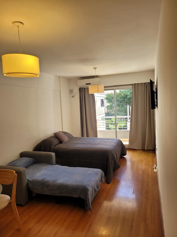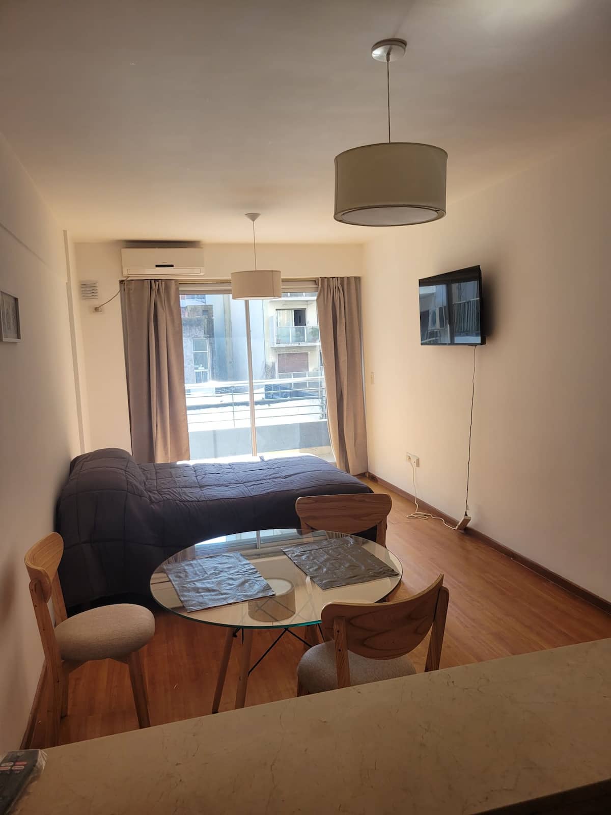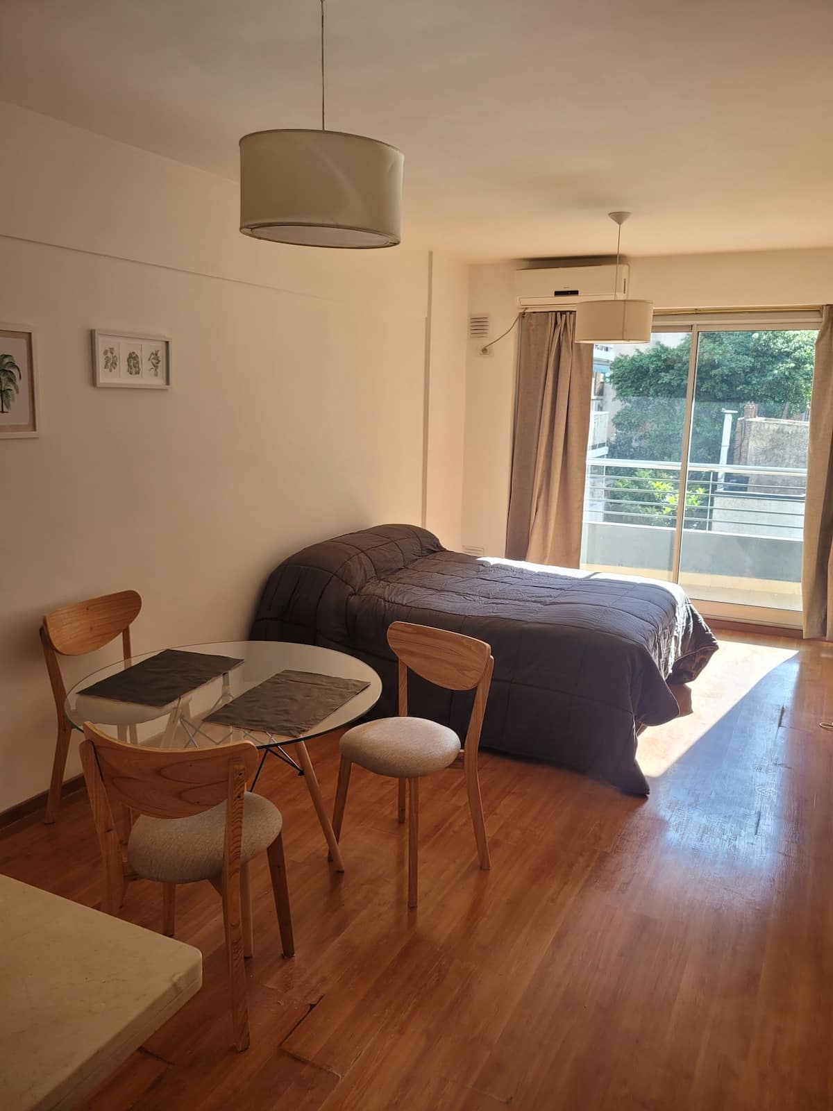 Квартира-студия в Colegiales. Есть мебель: двуспальная кровать и диван-кровать. В здании предусмотрены бассейн, общий зал для жильцов (SUM), тренажёрный зал и прачечная. Пространство с полной кухней, указано как очень светлое.