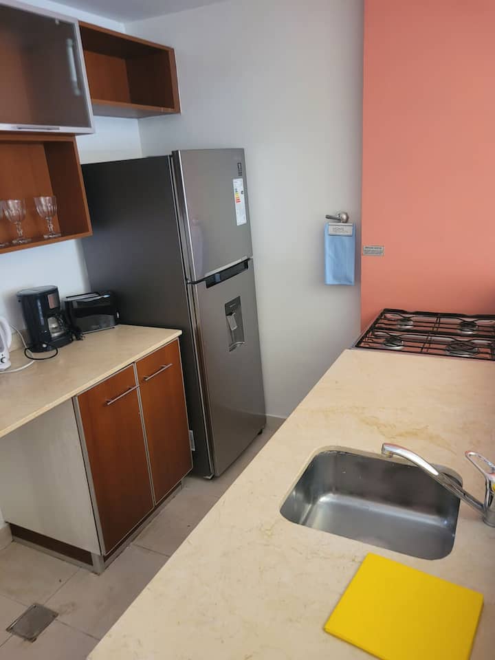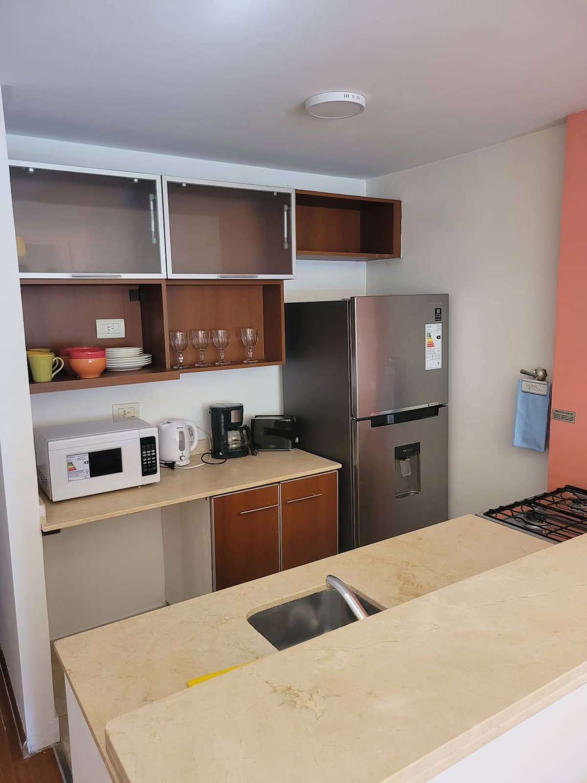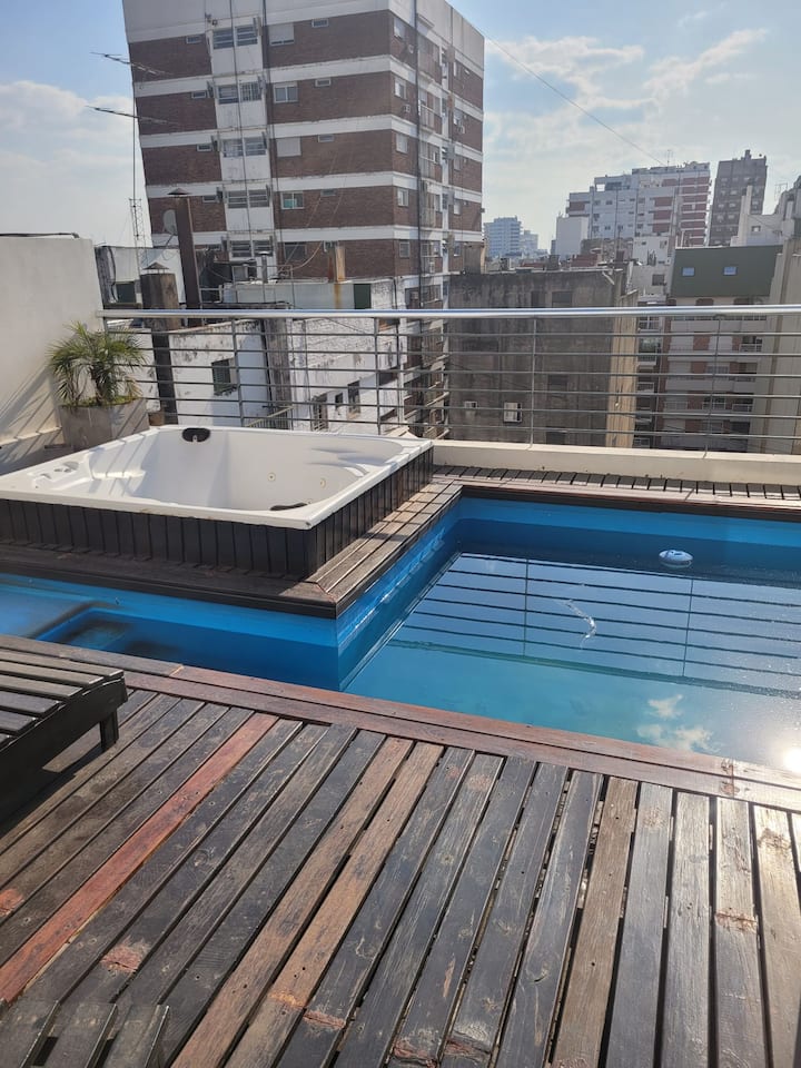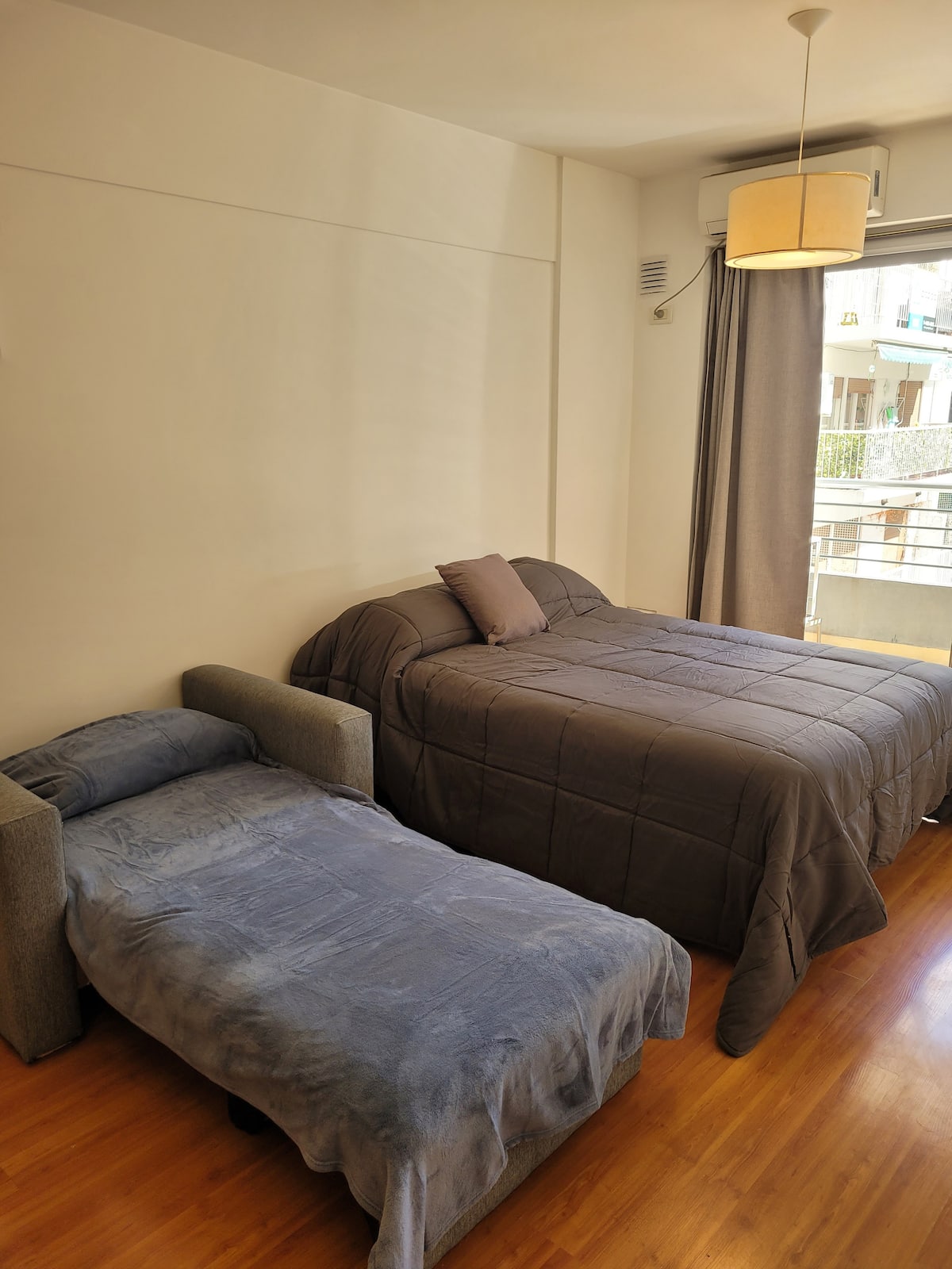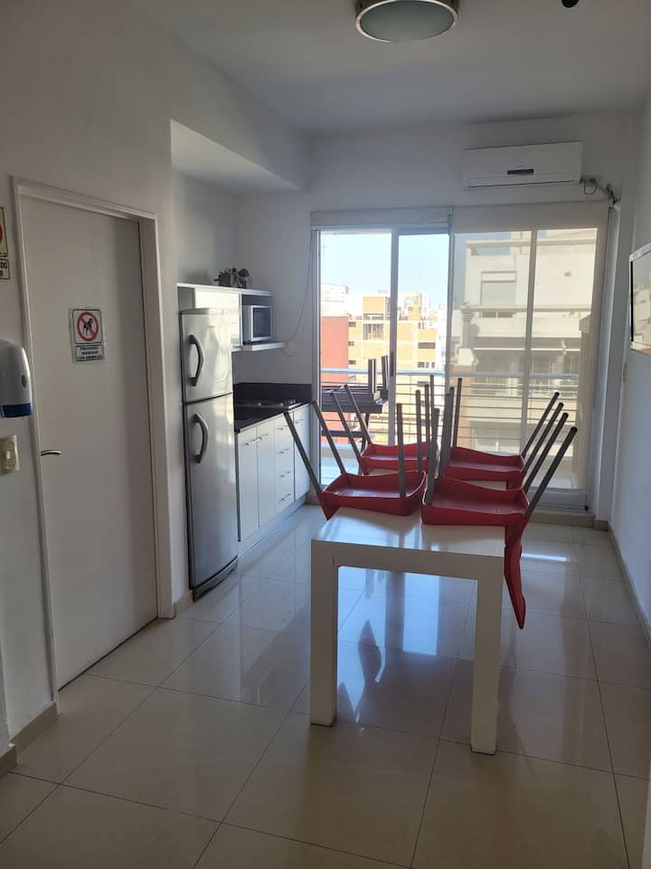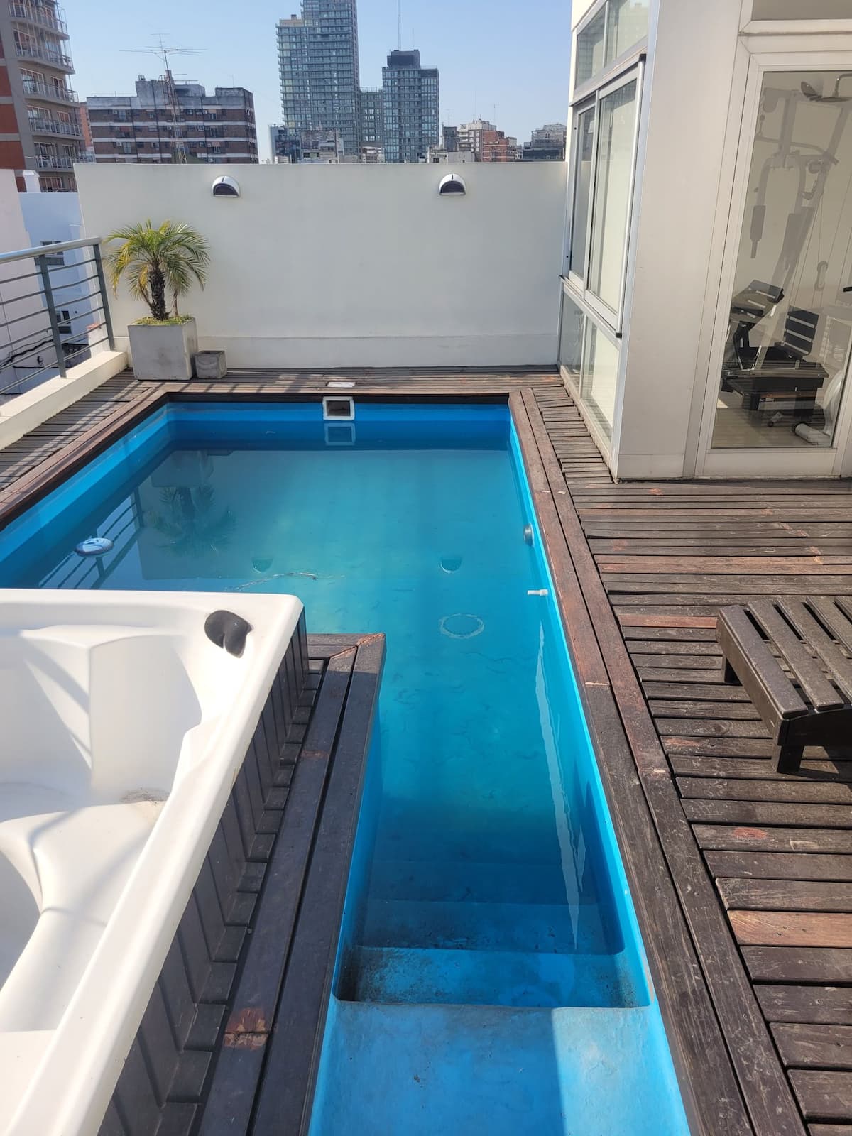 Квартира-студия в Colegiales. Есть мебель: двуспальная кровать и диван-кровать. В здании предусмотрены бассейн, общий зал для жильцов (SUM), тренажёрный зал и прачечная. Пространство с полной кухней, указано как очень светлое.