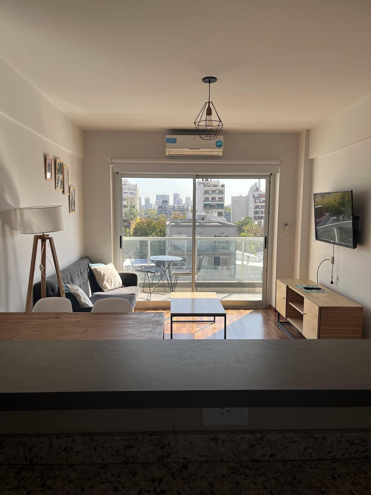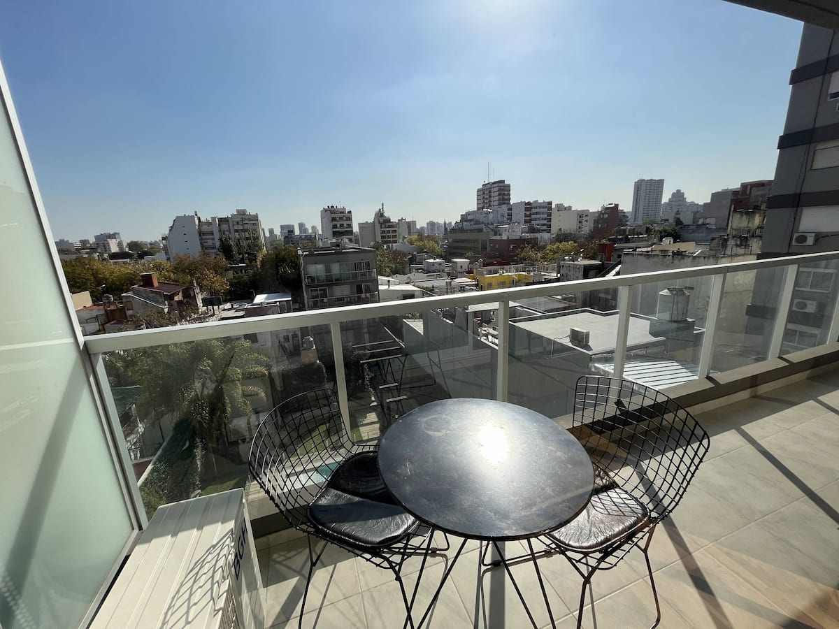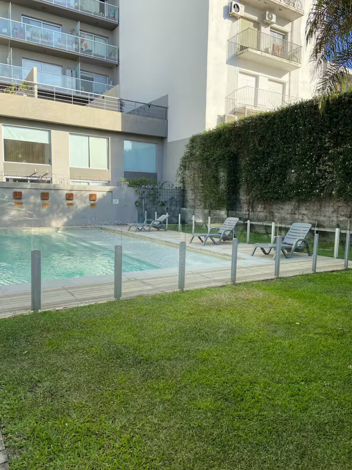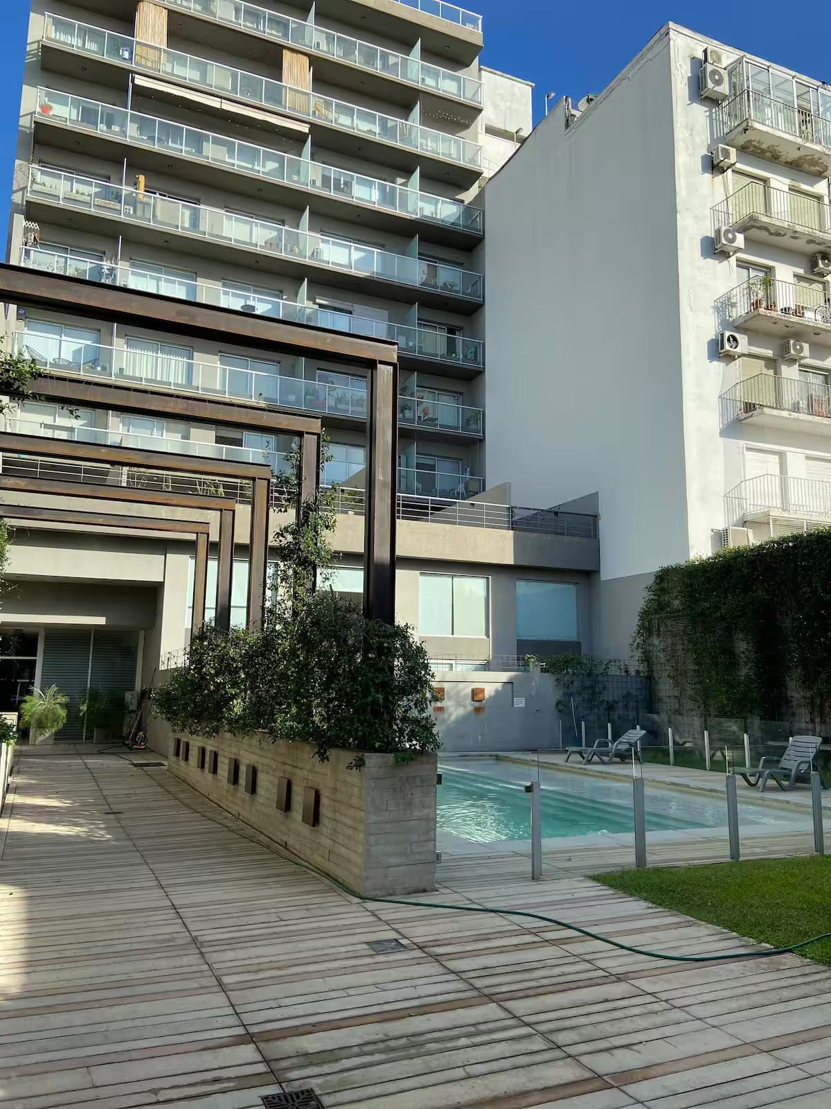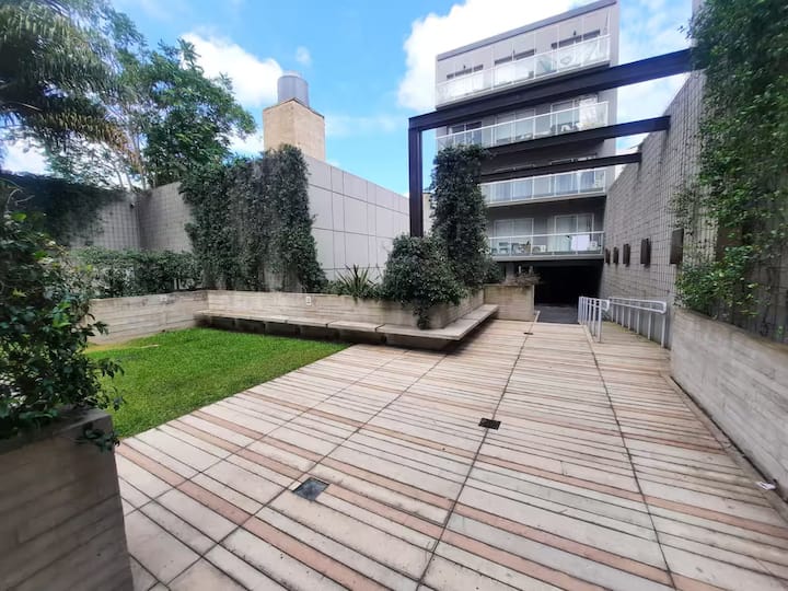 Квартира в роскошном здании в Colegiales, 4-й этаж, с балконом; планировка с отдельной спальней. Кухня оборудована, в том числе с кофемашиной Nespresso; есть WiFi 300 Mbps, кондиционер и смарт-телевизор. Доступ в общие зоны включает бассейн на улице, сад, спортзал и прачечную (нужна предварительная запись). В спальне двуспальная кровать, большой шкаф; в квартире ванная комната с душем и полноценной ванной. На балконе есть стол и стулья.