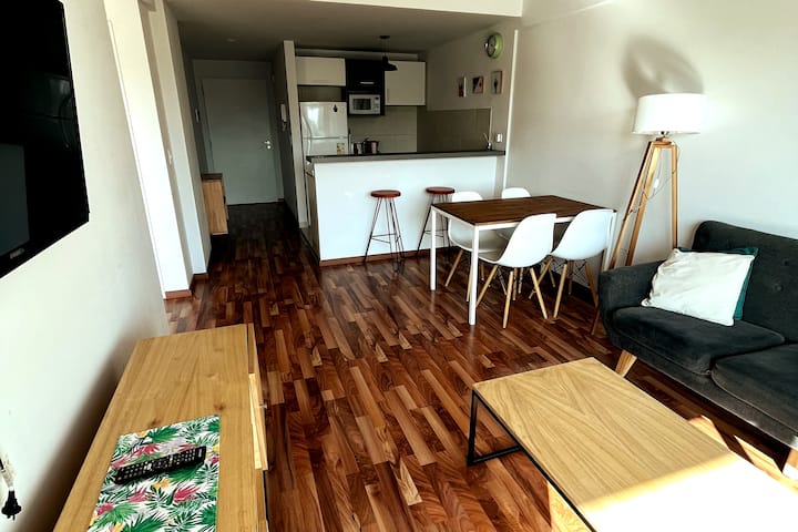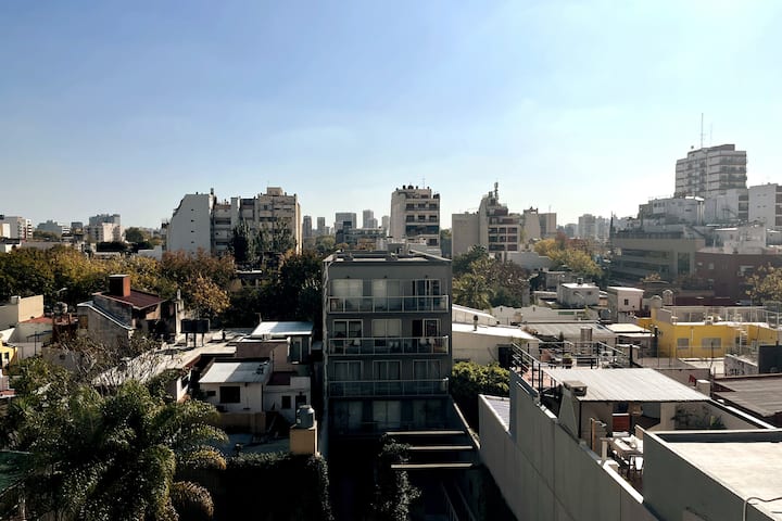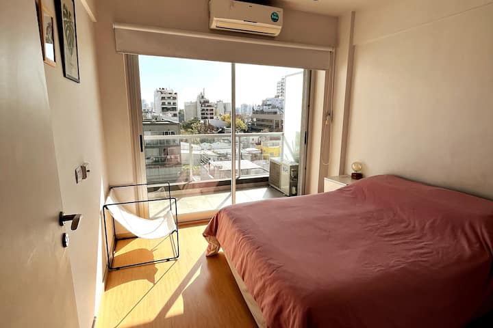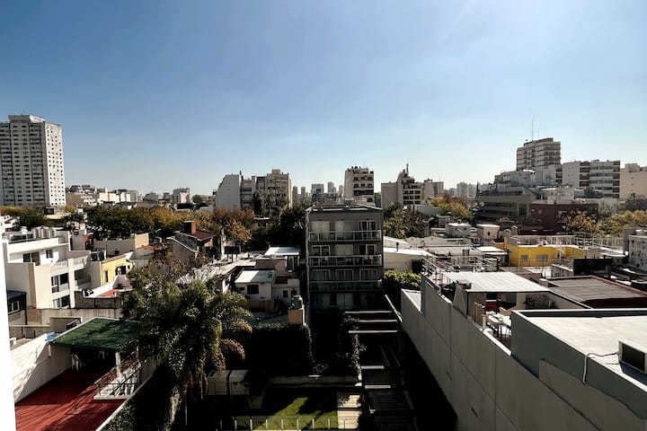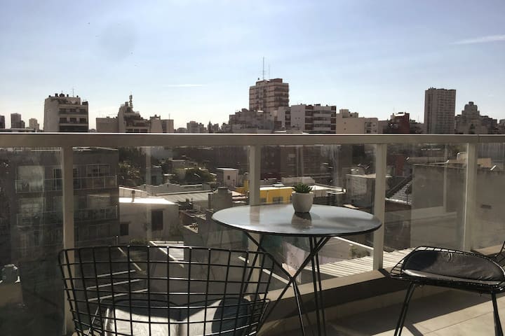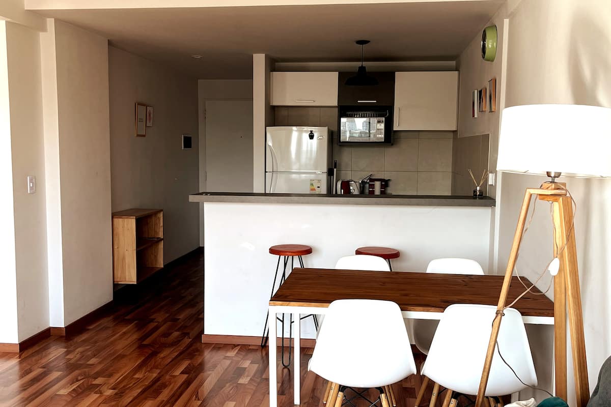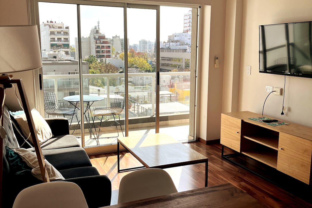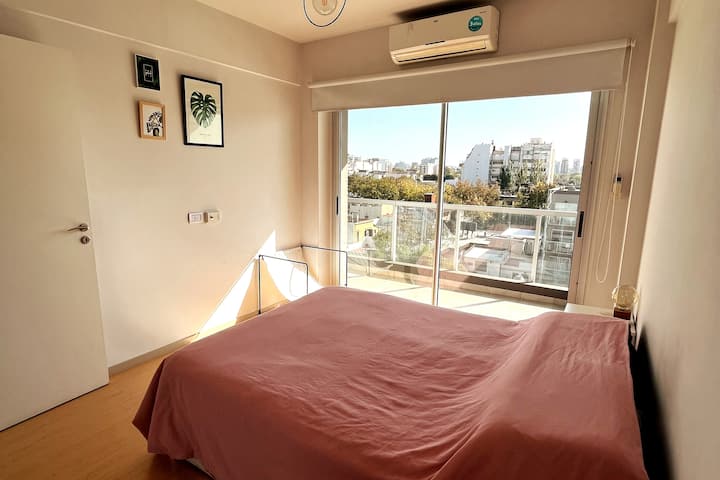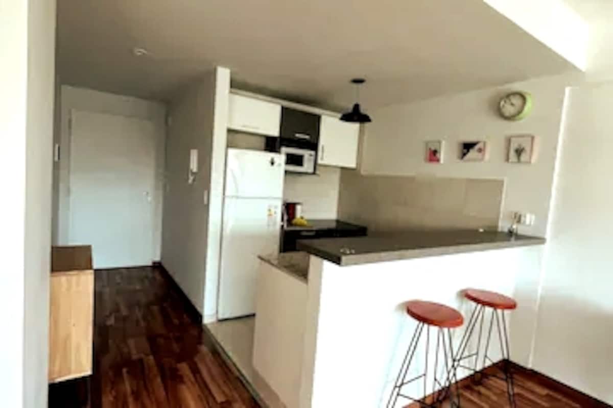 Квартира в роскошном здании в Colegiales, 4-й этаж, с балконом; планировка с отдельной спальней. Кухня оборудована, в том числе с кофемашиной Nespresso; есть WiFi 300 Mbps, кондиционер и смарт-телевизор. Доступ в общие зоны включает бассейн на улице, сад, спортзал и прачечную (нужна предварительная запись). В спальне двуспальная кровать, большой шкаф; в квартире ванная комната с душем и полноценной ванной. На балконе есть стол и стулья.