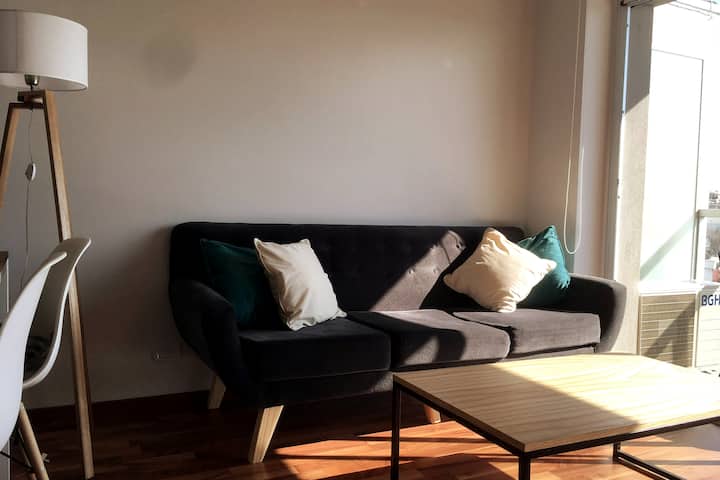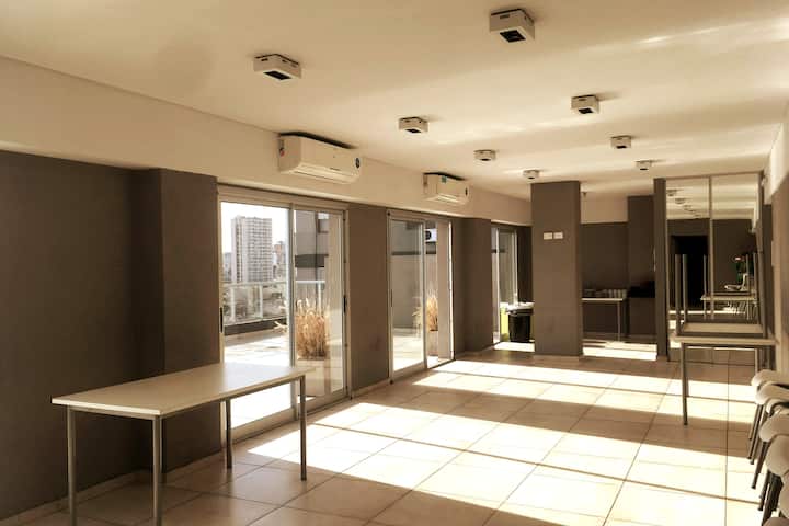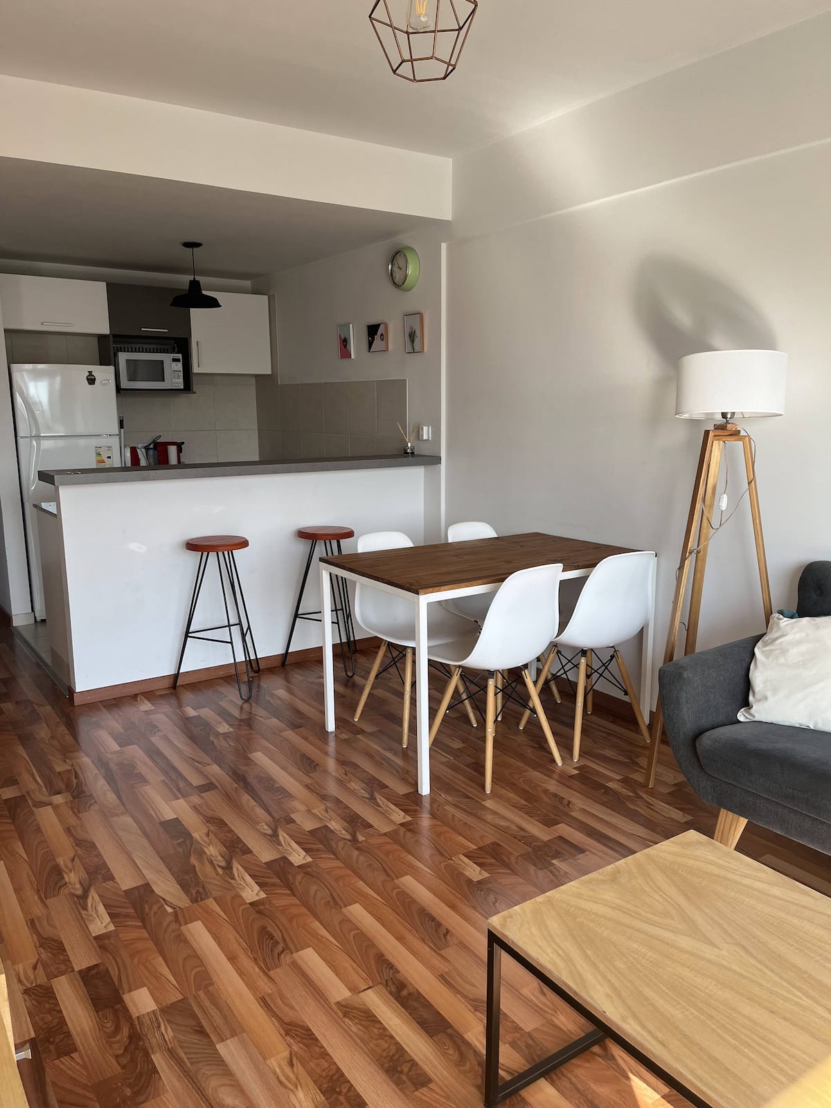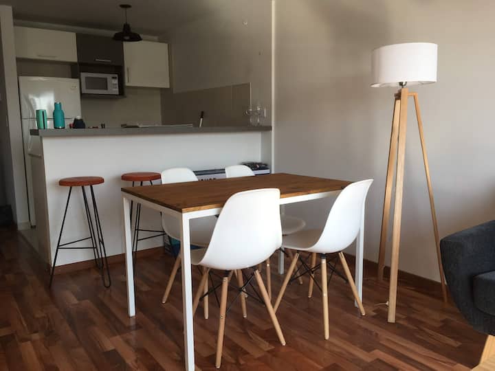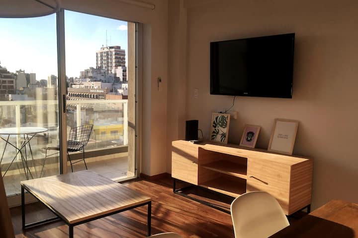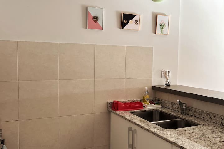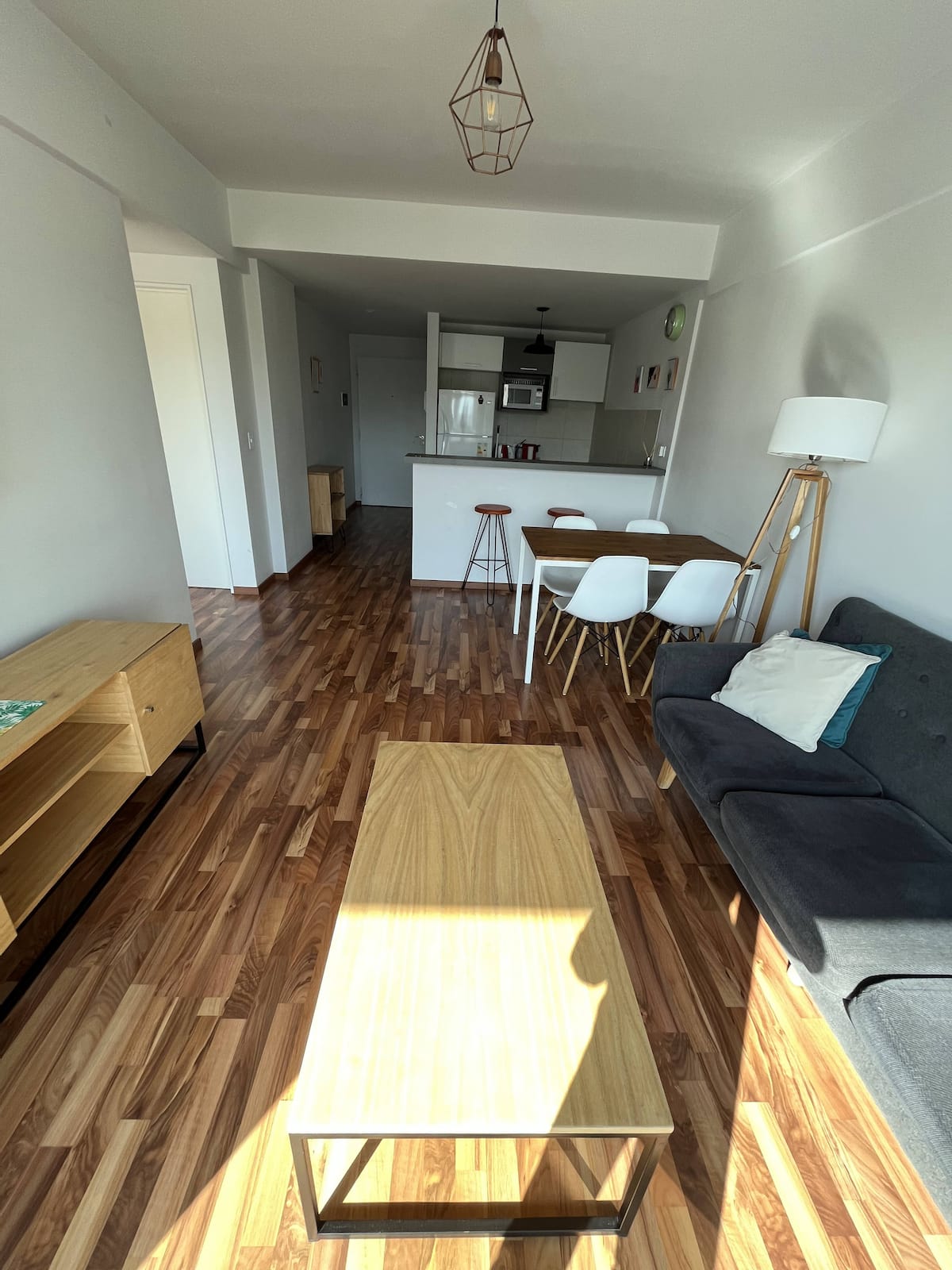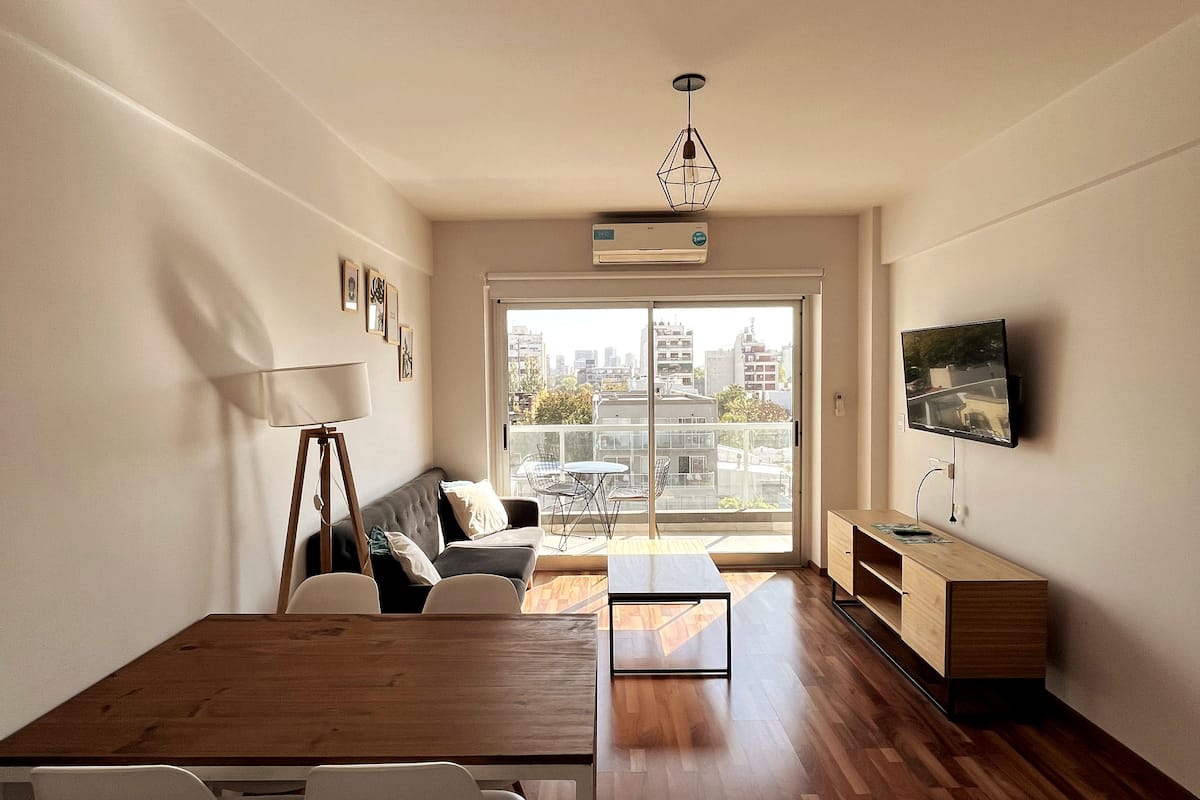 Квартира в роскошном здании в Colegiales, 4-й этаж, с балконом; планировка с отдельной спальней. Кухня оборудована, в том числе с кофемашиной Nespresso; есть WiFi 300 Mbps, кондиционер и смарт-телевизор. Доступ в общие зоны включает бассейн на улице, сад, спортзал и прачечную (нужна предварительная запись). В спальне двуспальная кровать, большой шкаф; в квартире ванная комната с душем и полноценной ванной. На балконе есть стол и стулья.
