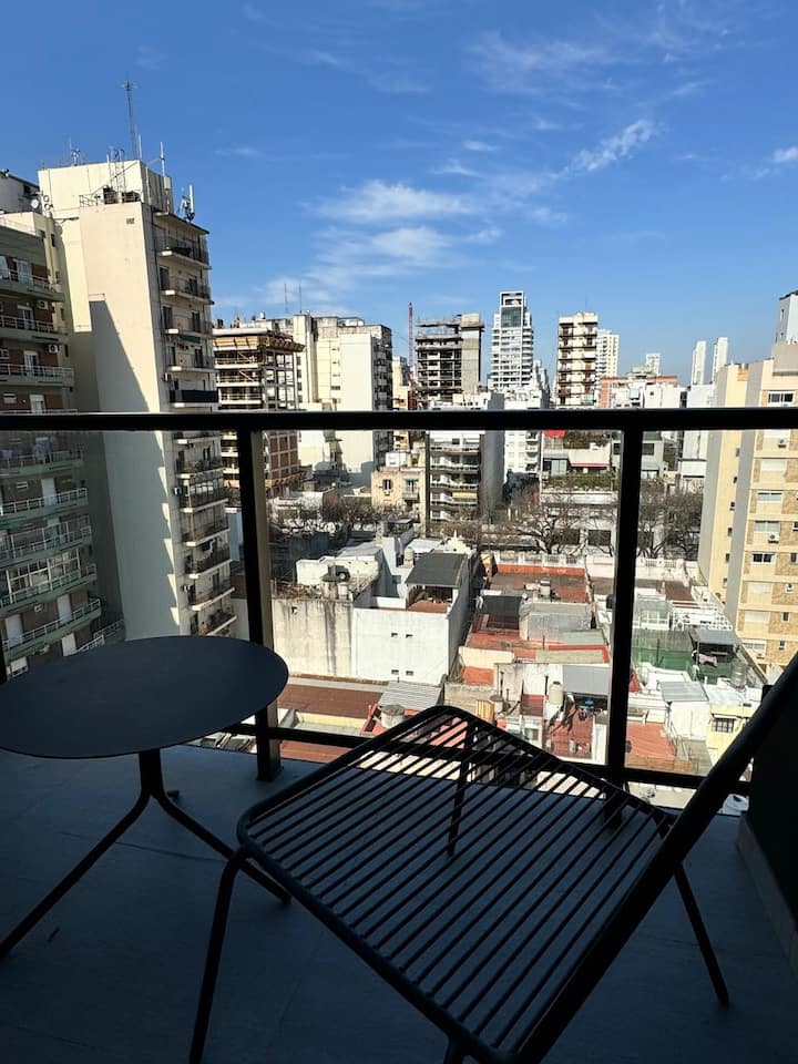 Квартира в Colegiales, двухкомнатная (1 спальня) с мебелью, с балконом. В доме предусмотрены бассейн с подогревом полуолимпийского формата, открытый бассейн, тренажёрный зал площадью 500 m², зона для коворкинга, помещение для йоги и медитации, массажный кабинет, терраса, солярий, зоны гриля, а также охрана 24 часа. В квартире есть кондиционер «холод/тепло», телевизор, Wi‑Fi, постельное бельё и полотенца; кухня-гостиная с диваном-кроватью, холодильником, электрической духовкой, тостером, электроч