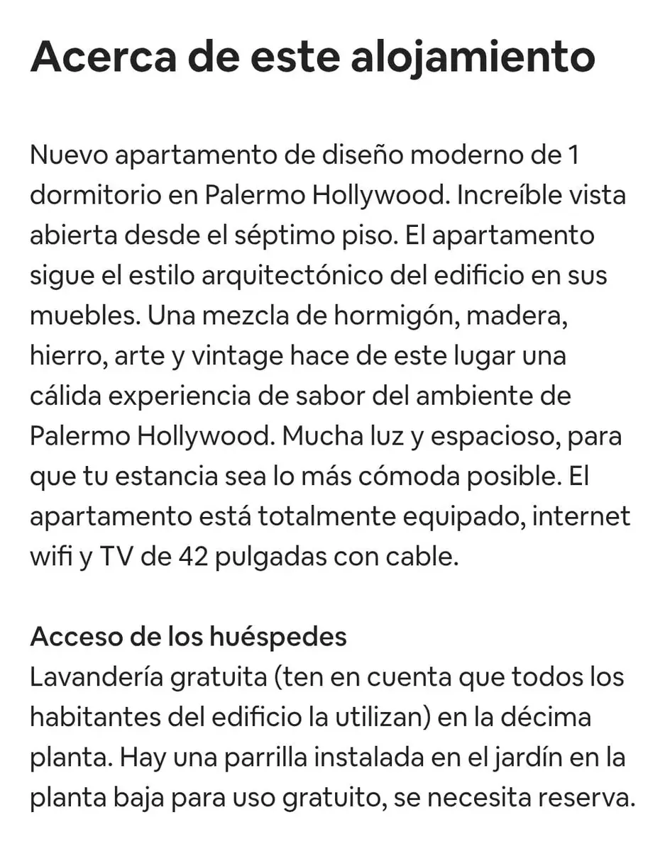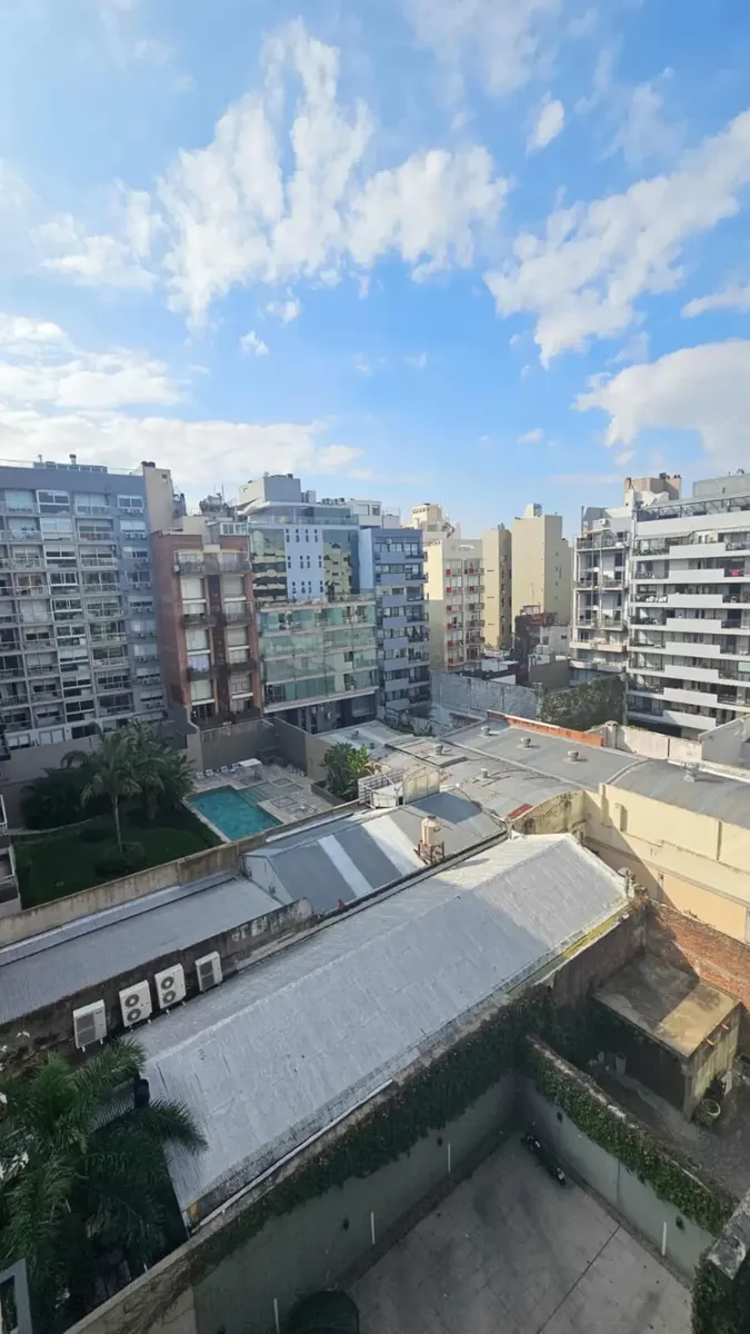 Квартира под временную или годовую аренду в здании в районе Palermo Hollywood, 7-й этаж. Окна выходят с открытым видом, с большим панорамным остеклением; тихая. Полная ванная с ванной. В квартире есть всё электрическое оборудование, Black Out, оптоволоконный интернет, индукционная панель, фен, кофемашина Nespresso. На последнем этаже предусмотрена панорамная терраса, а в здании есть зона гриля, место для хранения велосипедов и прачечная.