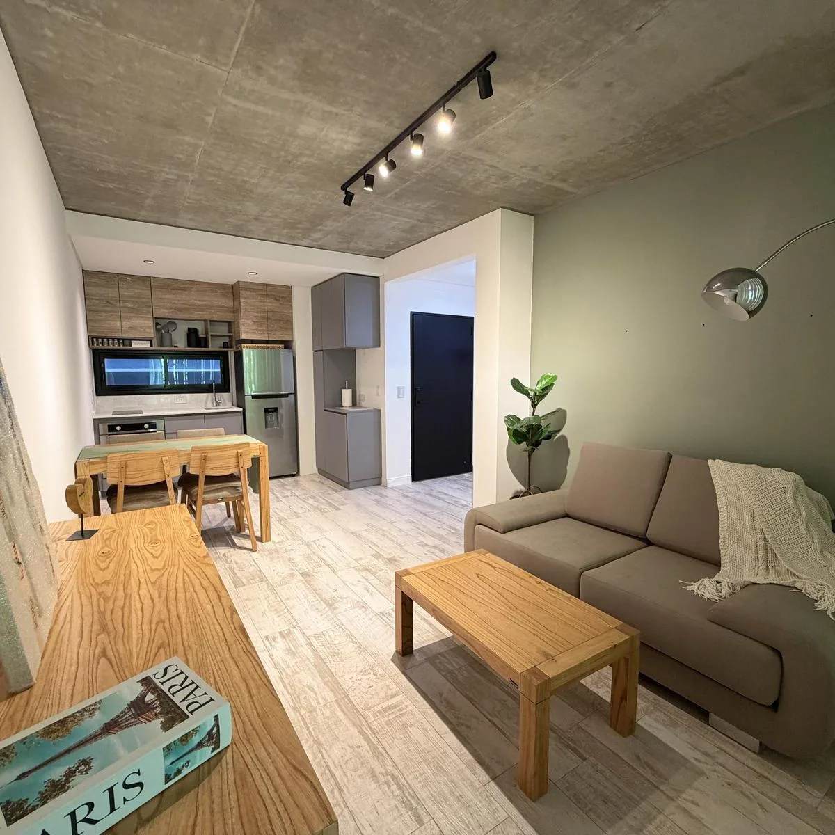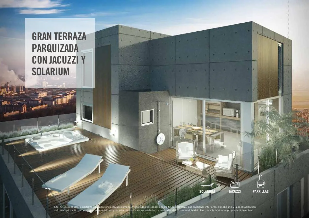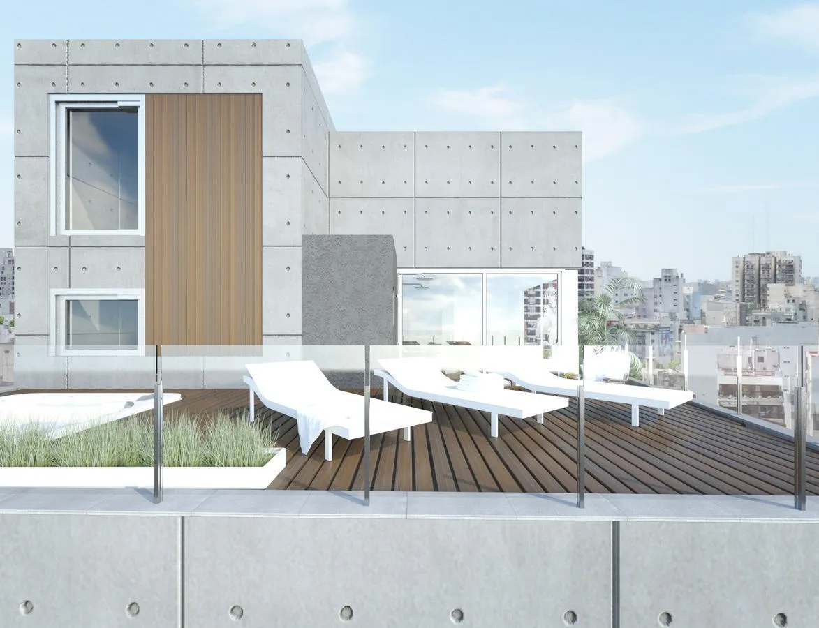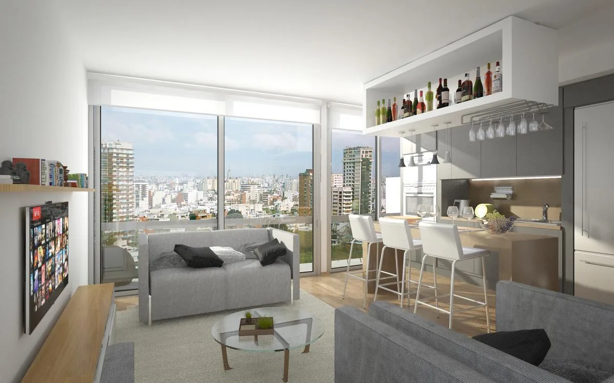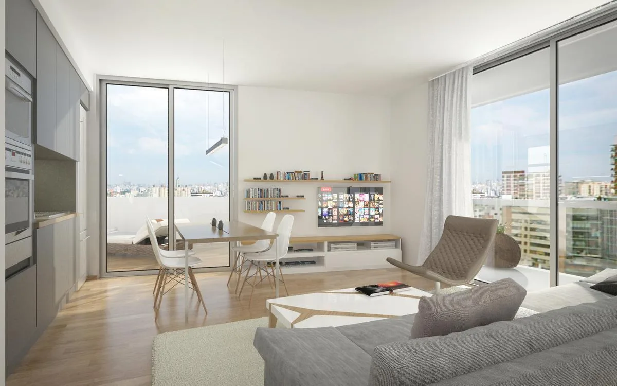 Квартира или офис с 1 спальней в Colegiales, 45 m² общих площадью, окна на улицу. Помещение с возможностью зонирования; фотографии относятся к шоуруму, при сдаче квартира будет без мебели. В квартире отдельный санузел, кухня в американском стиле объединена с гостиной-столовой и выходит на балкон. Здание на 10 этажей, предусмотрены цифровой доступ к дому и к квартирам через приложение HIPCAM (ключ, QR-код, распознавание лица или отпечаток). В здании есть озеленённая терраса с джакузи, солярий, об