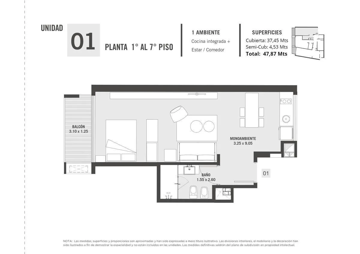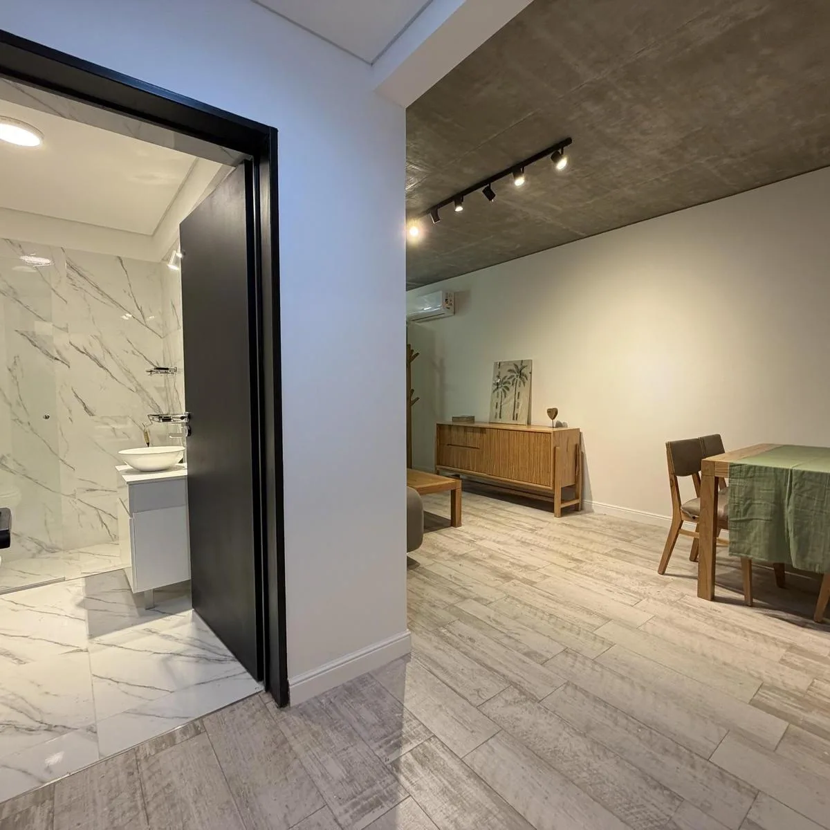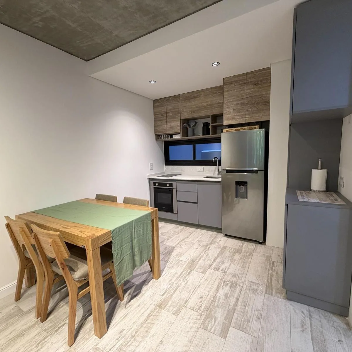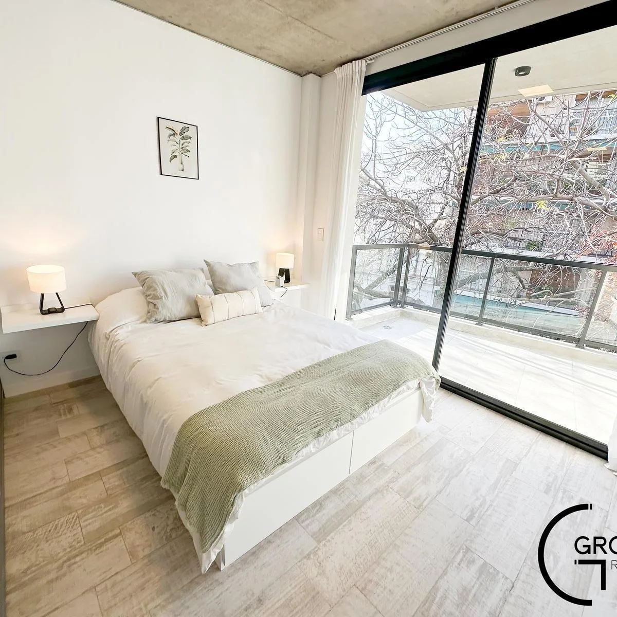 Квартира или офис с 1 спальней в Colegiales, 45 m² общих площадью, окна на улицу. Помещение с возможностью зонирования; фотографии относятся к шоуруму, при сдаче квартира будет без мебели. В квартире отдельный санузел, кухня в американском стиле объединена с гостиной-столовой и выходит на балкон. Здание на 10 этажей, предусмотрены цифровой доступ к дому и к квартирам через приложение HIPCAM (ключ, QR-код, распознавание лица или отпечаток). В здании есть озеленённая терраса с джакузи, солярий, об